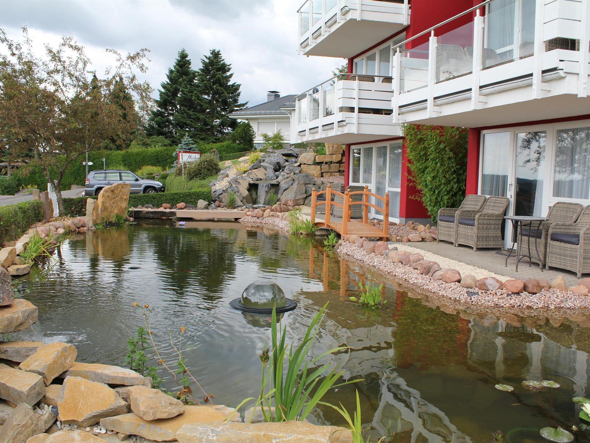 Ein wundervoller und aufwendig angelegter Zierteich mit Kois und anderen Fischen, 2 Wasserfällen und einem Bachlauf gehört zur Anlage.