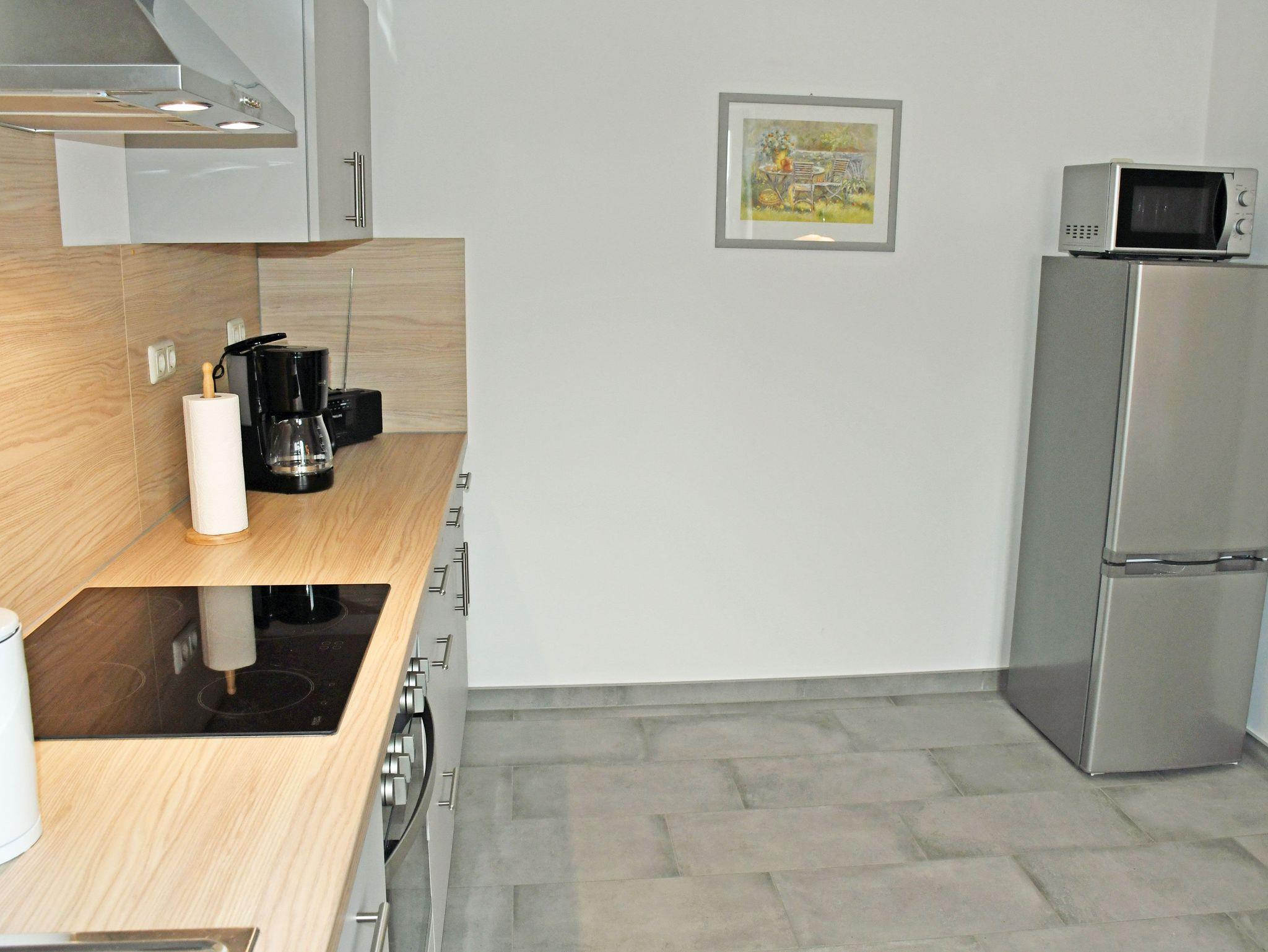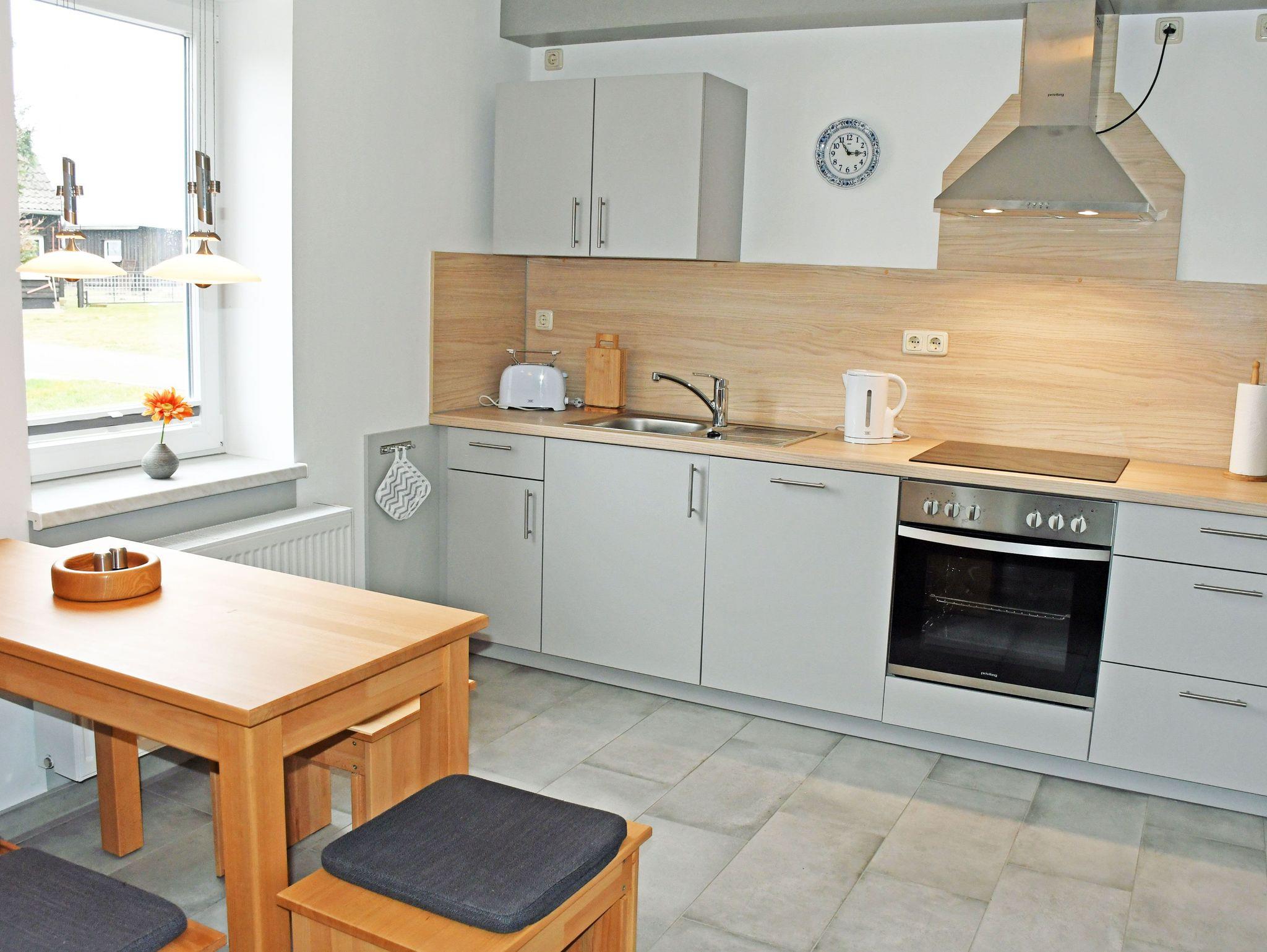 Im Erdgeschoss liegt die Küche. Hier steht auch ein Esstisch mit Stühlen. Die Küchenzeile ist mit einem Herd, Backofen, Wasserkocher, Kaffeemaschine, Toaster und Kühlschrank mit Gefrierfach komplett ausgestattet. Ebenfalls im EG liegt das Bad, es ist mit Dusche, WC und Waschtisch ausgestattet und verfügt über Tageslicht.