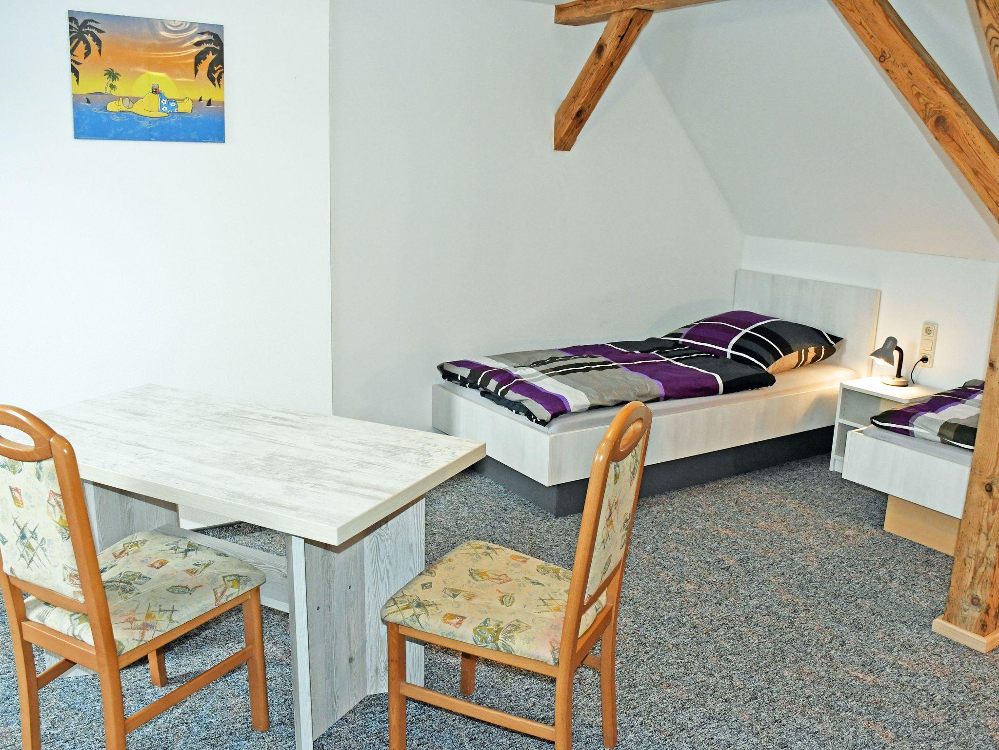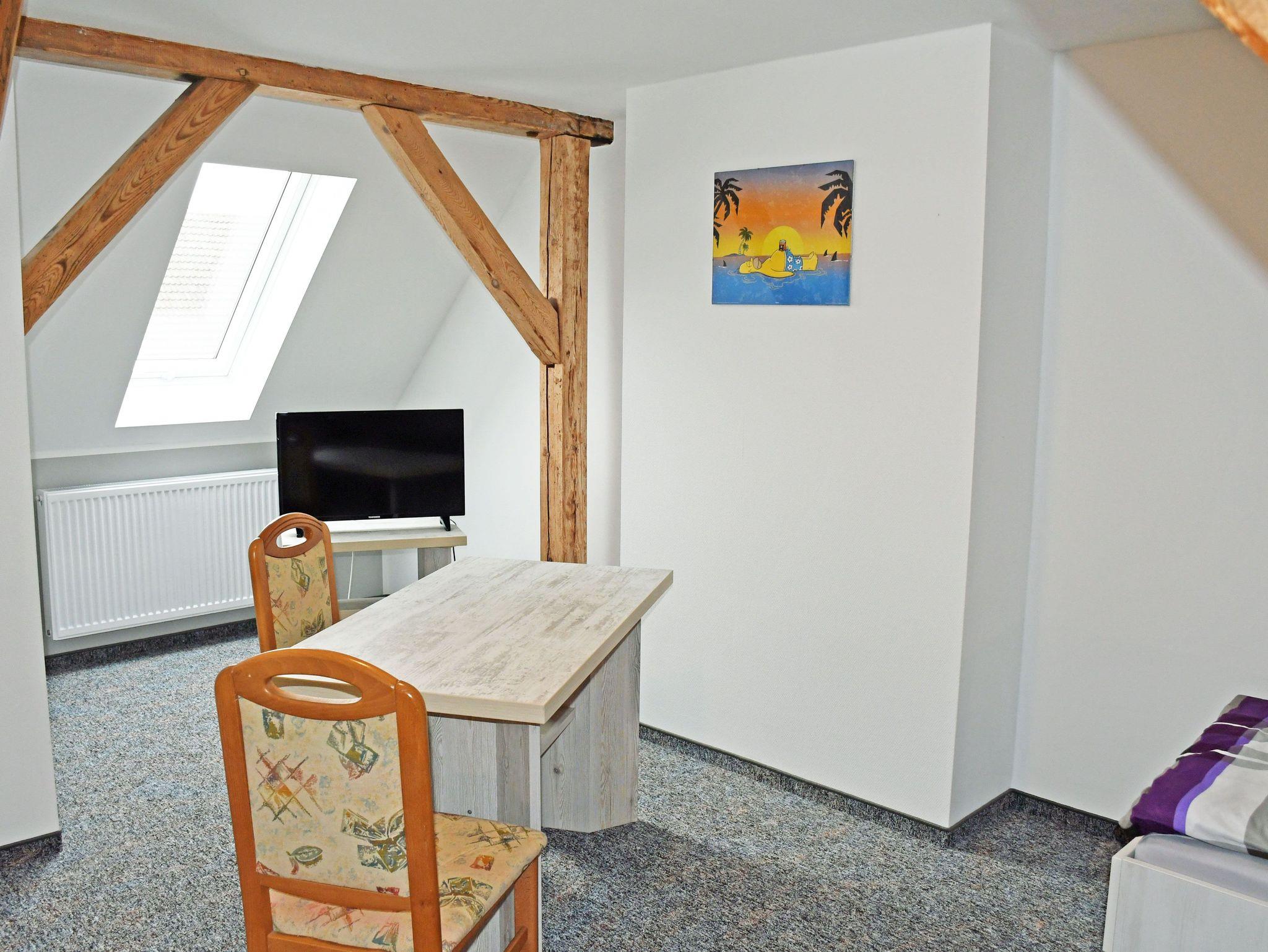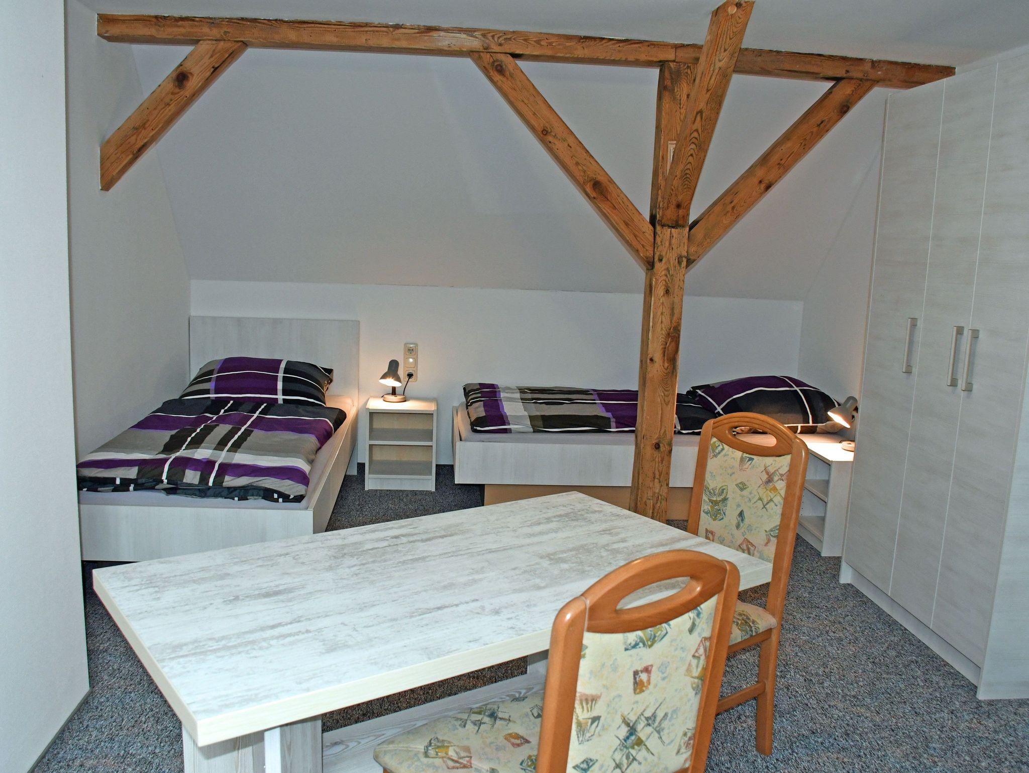 Im zweiten, über eine Treppe im Obergeschoss erreichbaren Schlafzimmer stehen zwei Einzelbetten, Tisch und Stühle sowie ein Flachbild-TV). Ein kleines Kinderreisebett kann auf Wunsch kostenlos bereitgestellt werden.