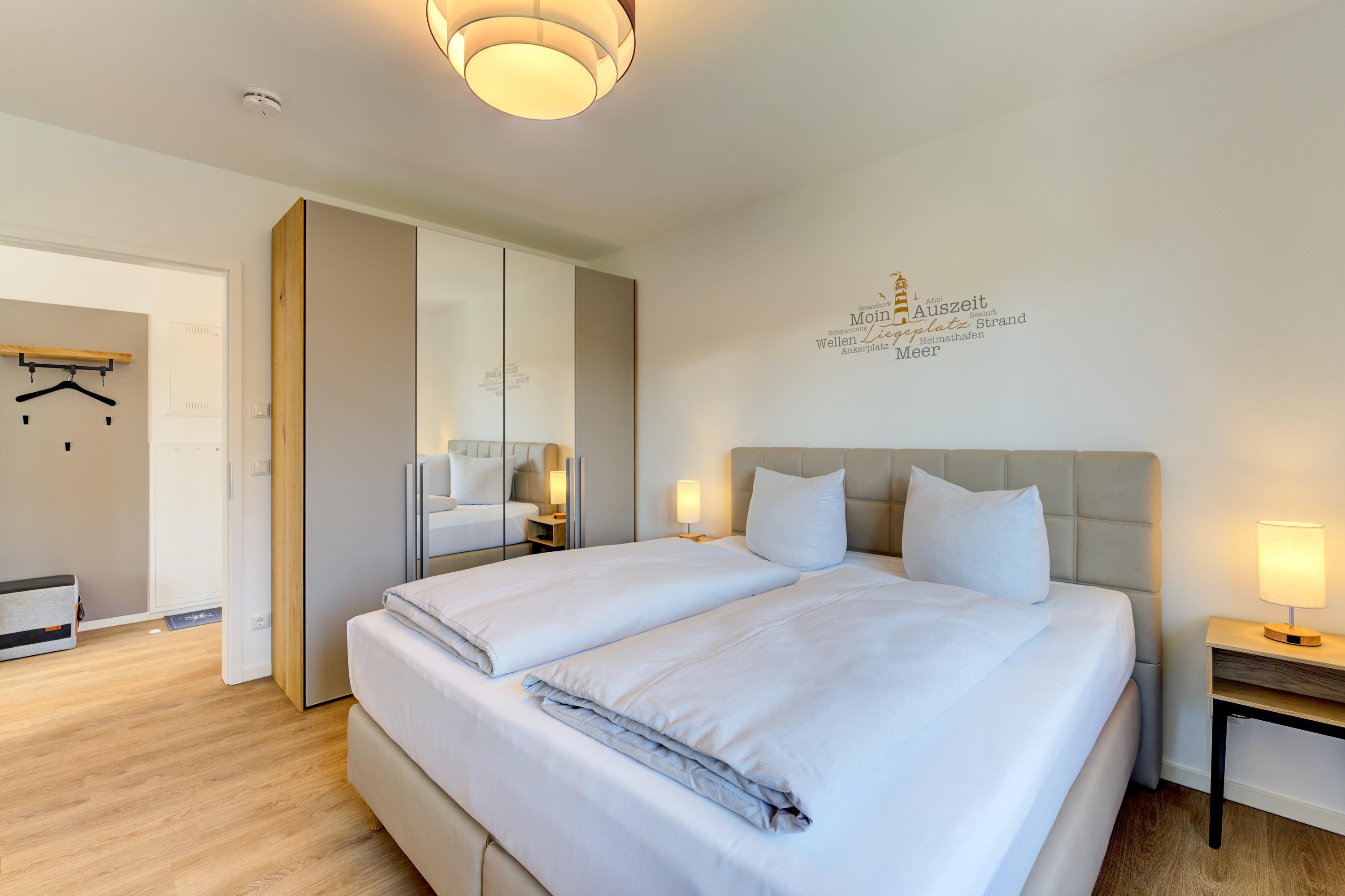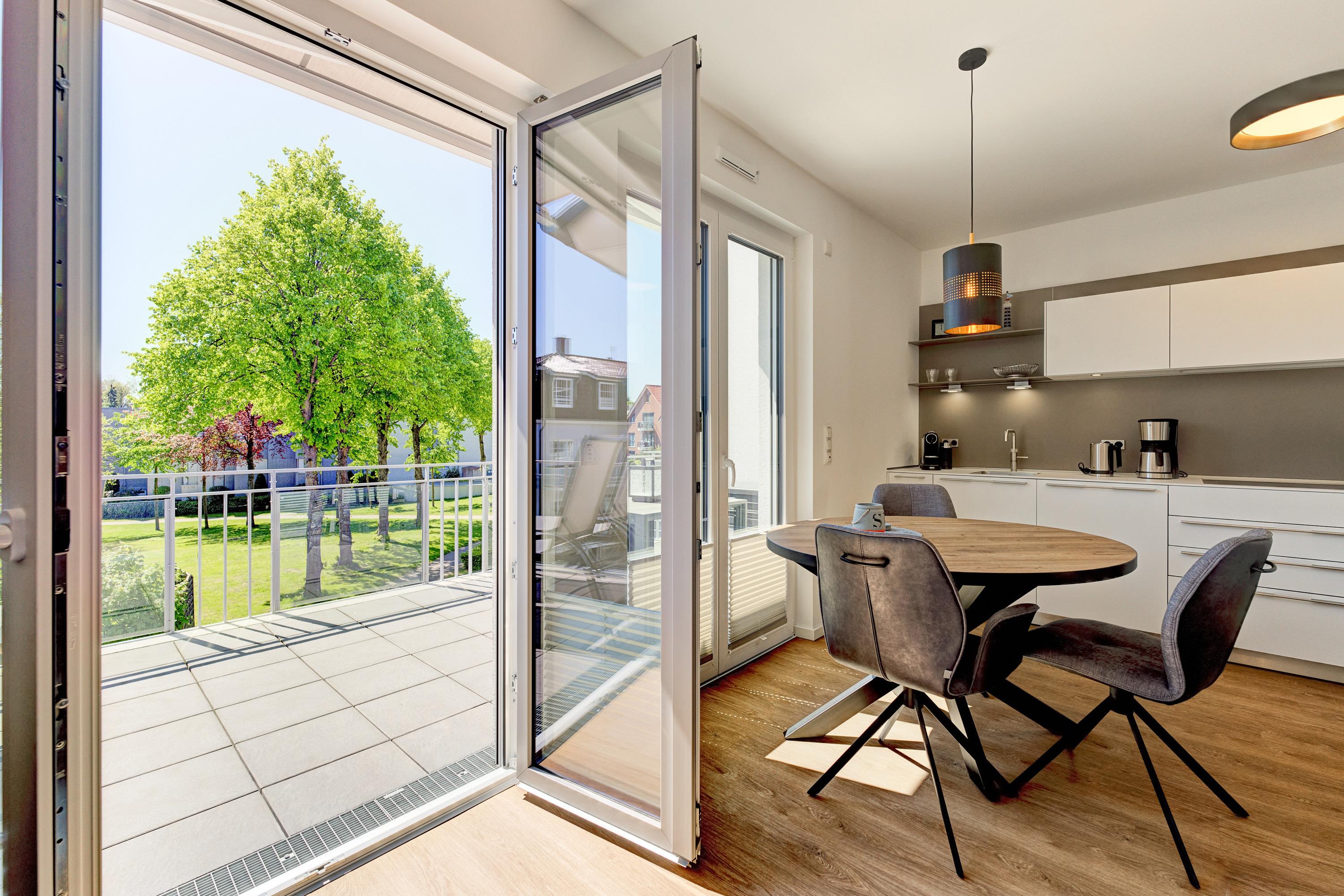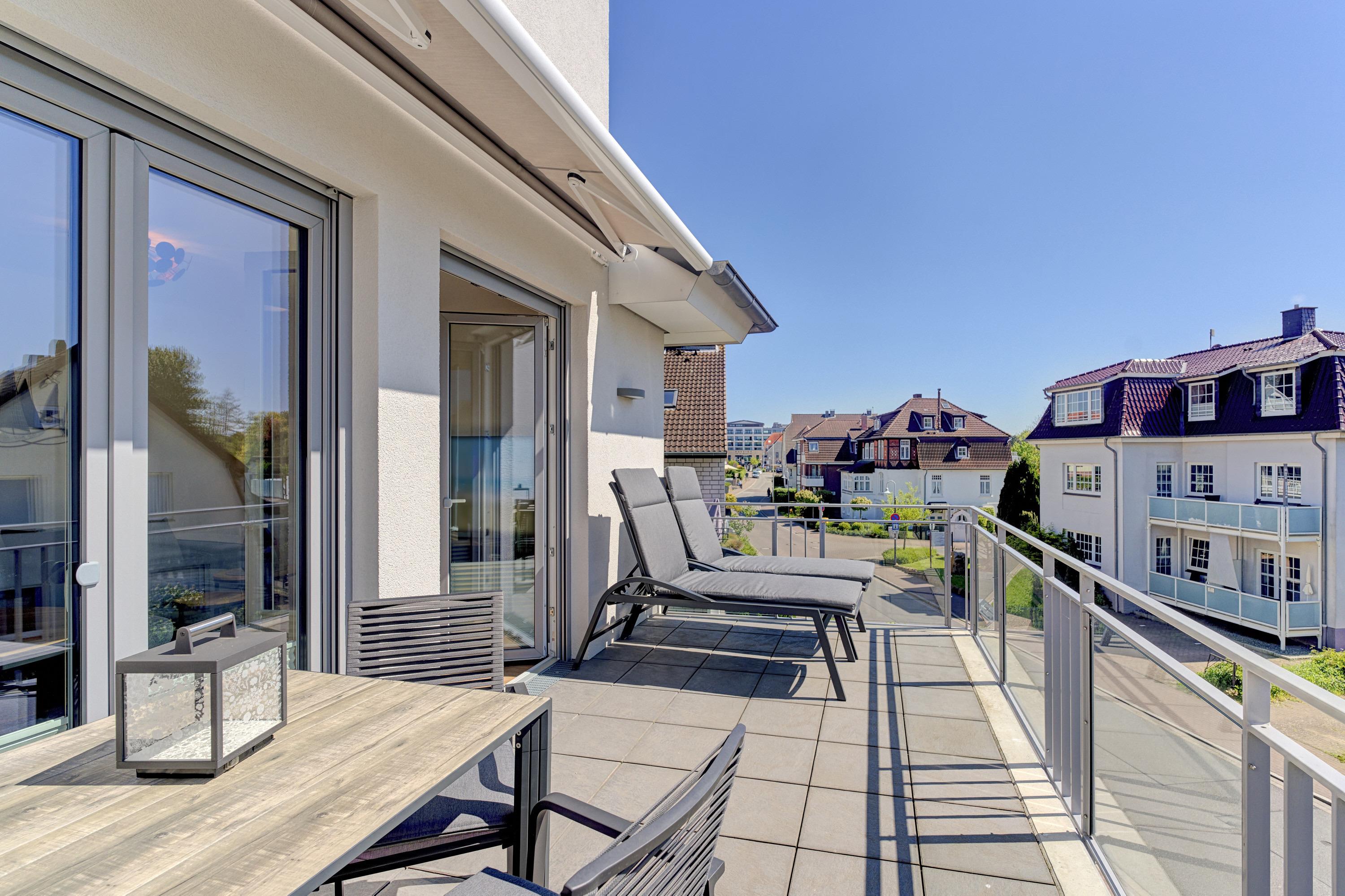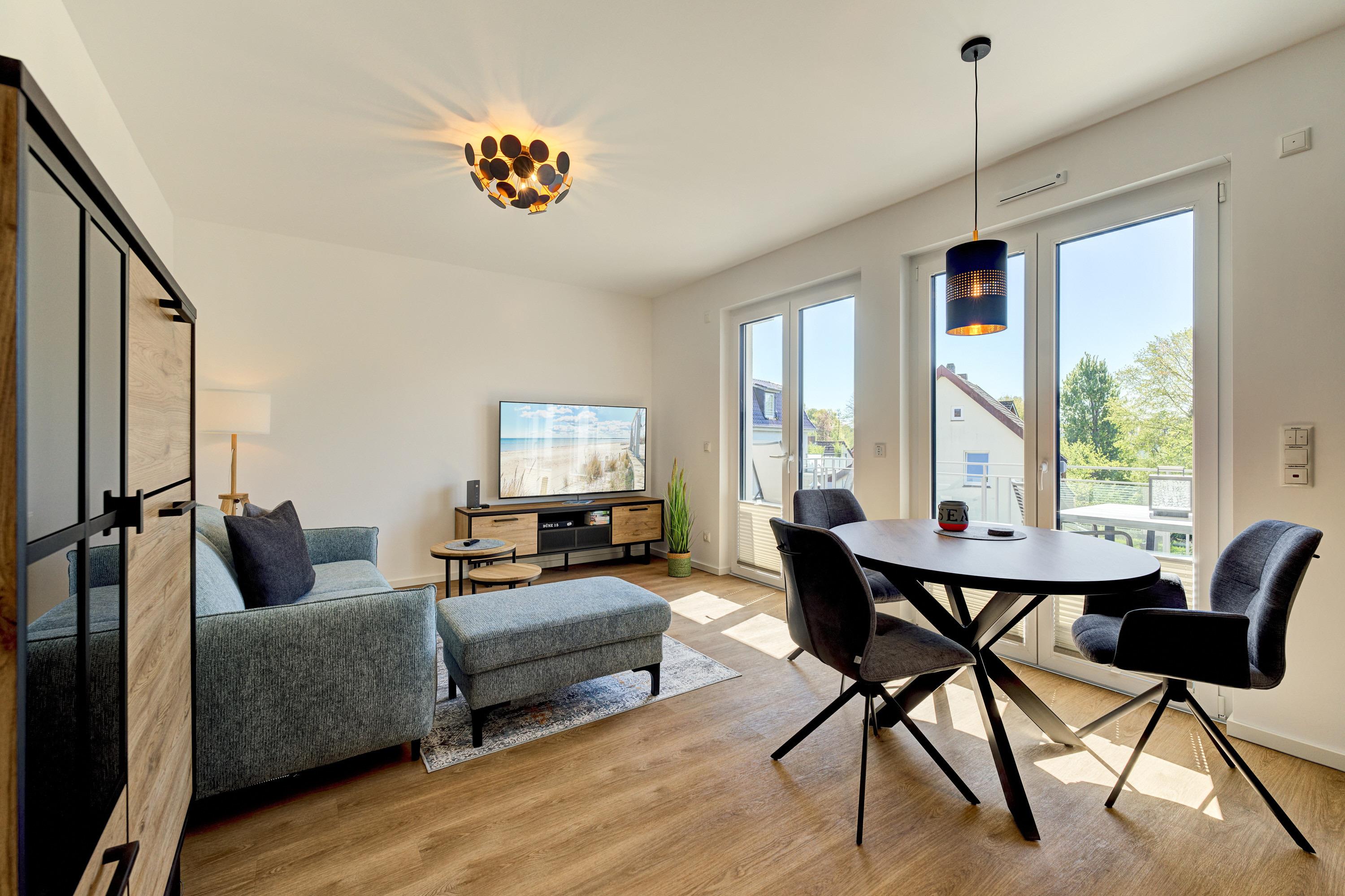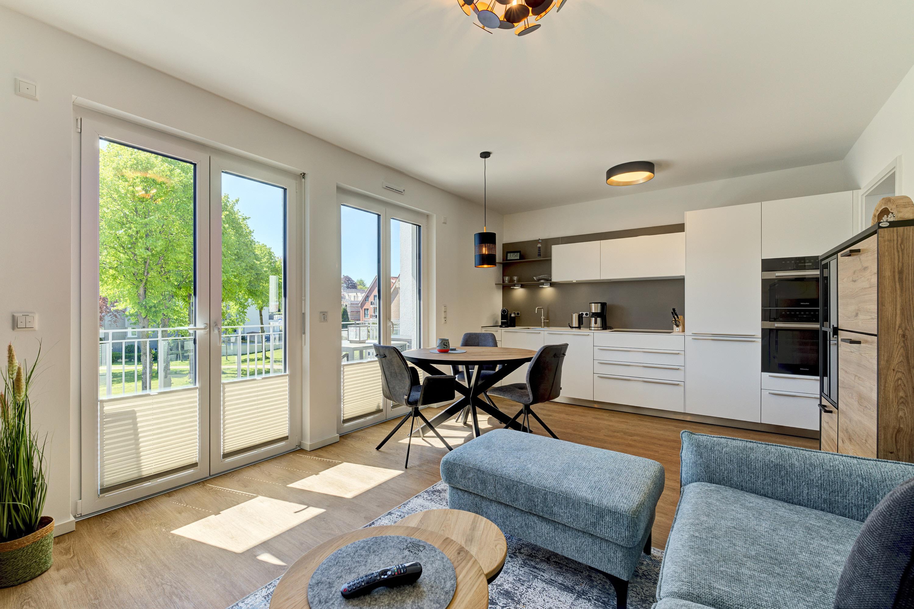 Die 2-Zimmer-Ferienwohnung ist durch ihre bodentiefen Fenster freundlich und hell. Alle Fenster sind mit Licht- und Sichtschutz sowie elektrischen Außenrollläden ausgestattet. Die hochwertige, voll bestückte Bulthaupt-Einbauküche, im Wohn-Essbereich, lässt keine Wünsche offen. Neben der Küchenzeile mit erhöhtem Backofen, Induktions-Kochfeld, Mikrowelle, Geschirrspüler, Kühlschrank und Gefrierschrank der Marke Miele, erwarten Sie eine Filterkaffeemaschine mit Thermoskanne sowie eine Nespresso-Kaffeemaschine, ein Milchaufschäumer, eine Teekanne, ein Toaster, ein Eierkocher, ein Mixer und ein Wasserkocher. Der Wohnbereich ist mit einem qualitativen Sofa ( Schlafcouch) mit Hockerbank, Couchtisch, schwenkbarem Smart-TV (65 Zoll) sowie einem gemütlichen Essbereich eingerichtet. Vorhanden sind Gesellschaftsspiele und Bücher. Von dem Wohnbereich aus gelangen Sie auf den herrlichen großen Süd-Ost-Balkon mit elektrischer Markise, wo Ihnen ein Tisch mit Stühlen und zwei Sonnenliegen zur Verfügung stehen. Das Schlafzimmer lädt mit seinem hochwertigen Boxspringbett der Größe 1,80mx2,00m und seinen zwei Matratzen in H3 zu einem gemütlichen Ausklang des Tages ein. Zudem verfügt es über einen Kleiderschrank, zwei Nachttische inkl. Nachttischlampen mit USB-Ladefunktion sowie einen Smart-TV (55 Zoll). Die bodentiefen Fenster sind auch hier mit elektrischen Außenrollläden ergänzt. Das Badezimmer besticht mit seinem hellen Duschbad mit bodengleicher Dusche, Handtuchheizkörper, Fön und Kosmetikspiegel. Die gesamte Wohnung ist mit einer Fußbodenheizung ausgestattet.