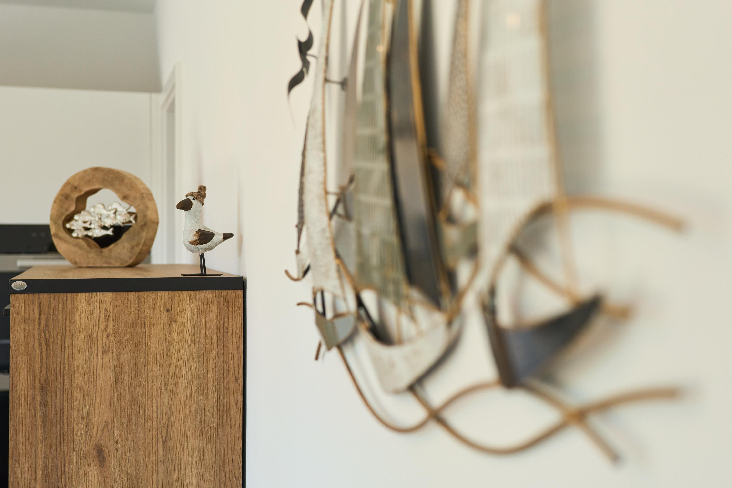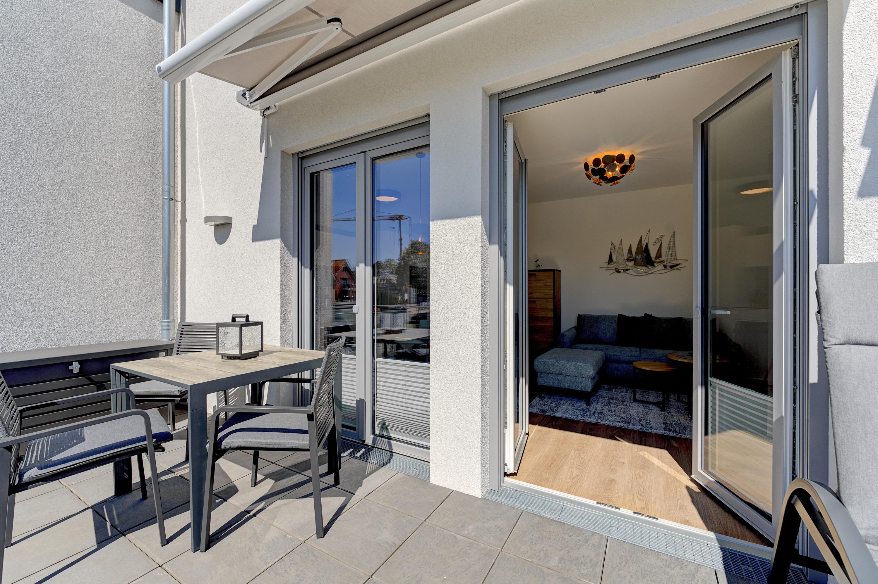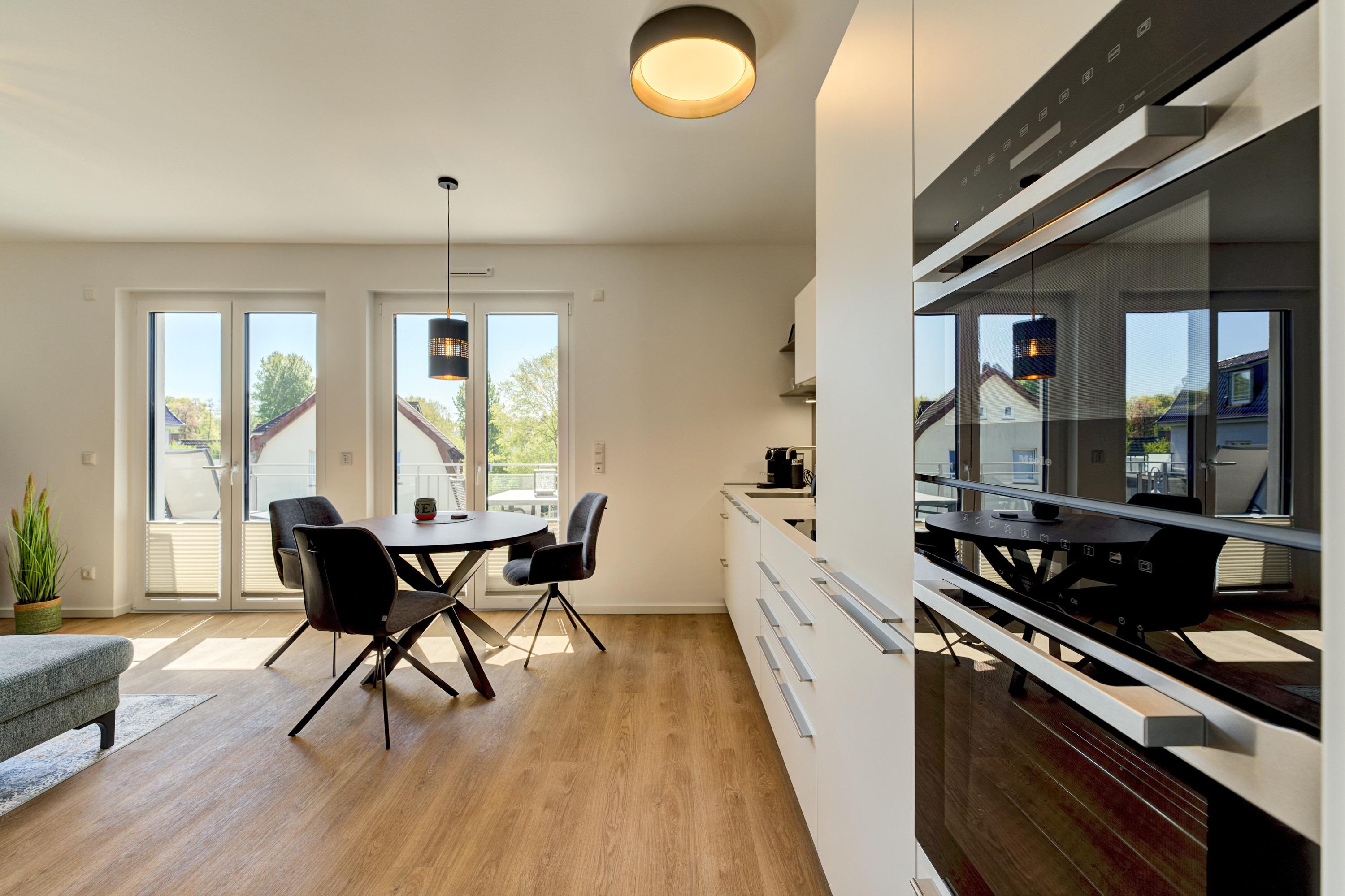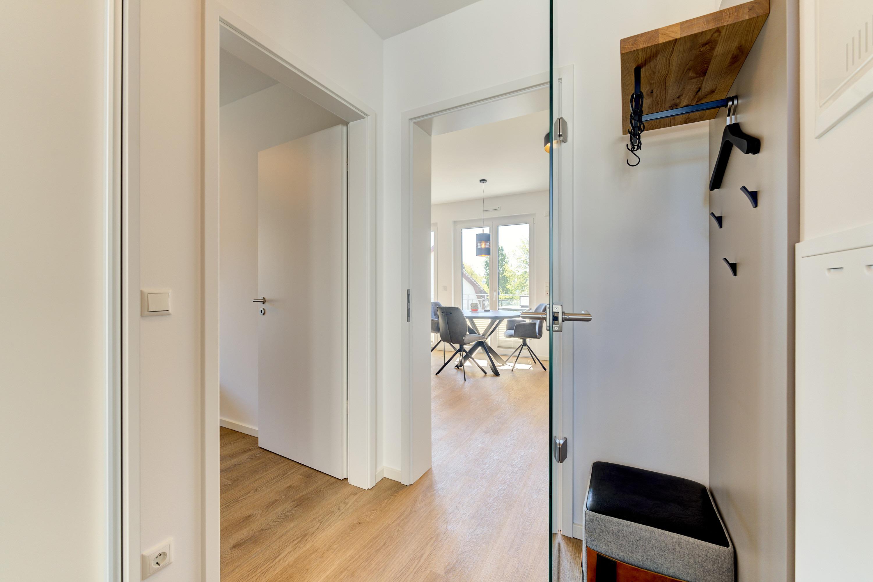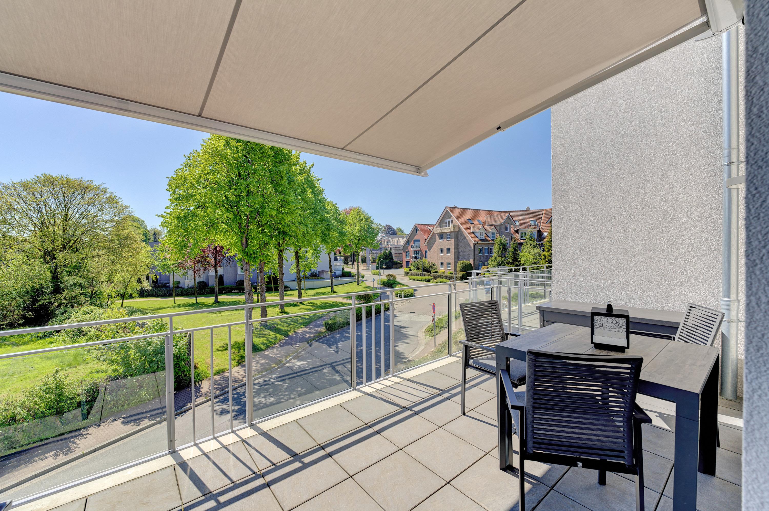 Die 2-Zimmer-Ferienwohnung ist durch ihre bodentiefen Fenster freundlich und hell. Alle Fenster sind mit Licht- und Sichtschutz sowie elektrischen Außenrollläden ausgestattet. Die hochwertige, voll bestückte Bulthaupt-Einbauküche, im Wohn-Essbereich, lässt keine Wünsche offen. Neben der Küchenzeile mit erhöhtem Backofen, Induktions-Kochfeld, Mikrowelle, Geschirrspüler, Kühlschrank und Gefrierschrank der Marke Miele, erwarten Sie eine Filterkaffeemaschine mit Thermoskanne sowie eine Nespresso-Kaffeemaschine, ein Milchaufschäumer, eine Teekanne, ein Toaster, ein Eierkocher, ein Mixer und ein Wasserkocher. Der Wohnbereich ist mit einem qualitativen Sofa ( Schlafcouch) mit Hockerbank, Couchtisch, schwenkbarem Smart-TV (65 Zoll) sowie einem gemütlichen Essbereich eingerichtet. Vorhanden sind Gesellschaftsspiele und Bücher. Von dem Wohnbereich aus gelangen Sie auf den herrlichen großen Süd-Ost-Balkon mit elektrischer Markise, wo Ihnen ein Tisch mit Stühlen und zwei Sonnenliegen zur Verfügung stehen. Das Schlafzimmer lädt mit seinem hochwertigen Boxspringbett der Größe 1,80mx2,00m und seinen zwei Matratzen in H3 zu einem gemütlichen Ausklang des Tages ein. Zudem verfügt es über einen Kleiderschrank, zwei Nachttische inkl. Nachttischlampen mit USB-Ladefunktion sowie einen Smart-TV (55 Zoll). Die bodentiefen Fenster sind auch hier mit elektrischen Außenrollläden ergänzt. Das Badezimmer besticht mit seinem hellen Duschbad mit bodengleicher Dusche, Handtuchheizkörper, Fön und Kosmetikspiegel. Die gesamte Wohnung ist mit einer Fußbodenheizung ausgestattet.