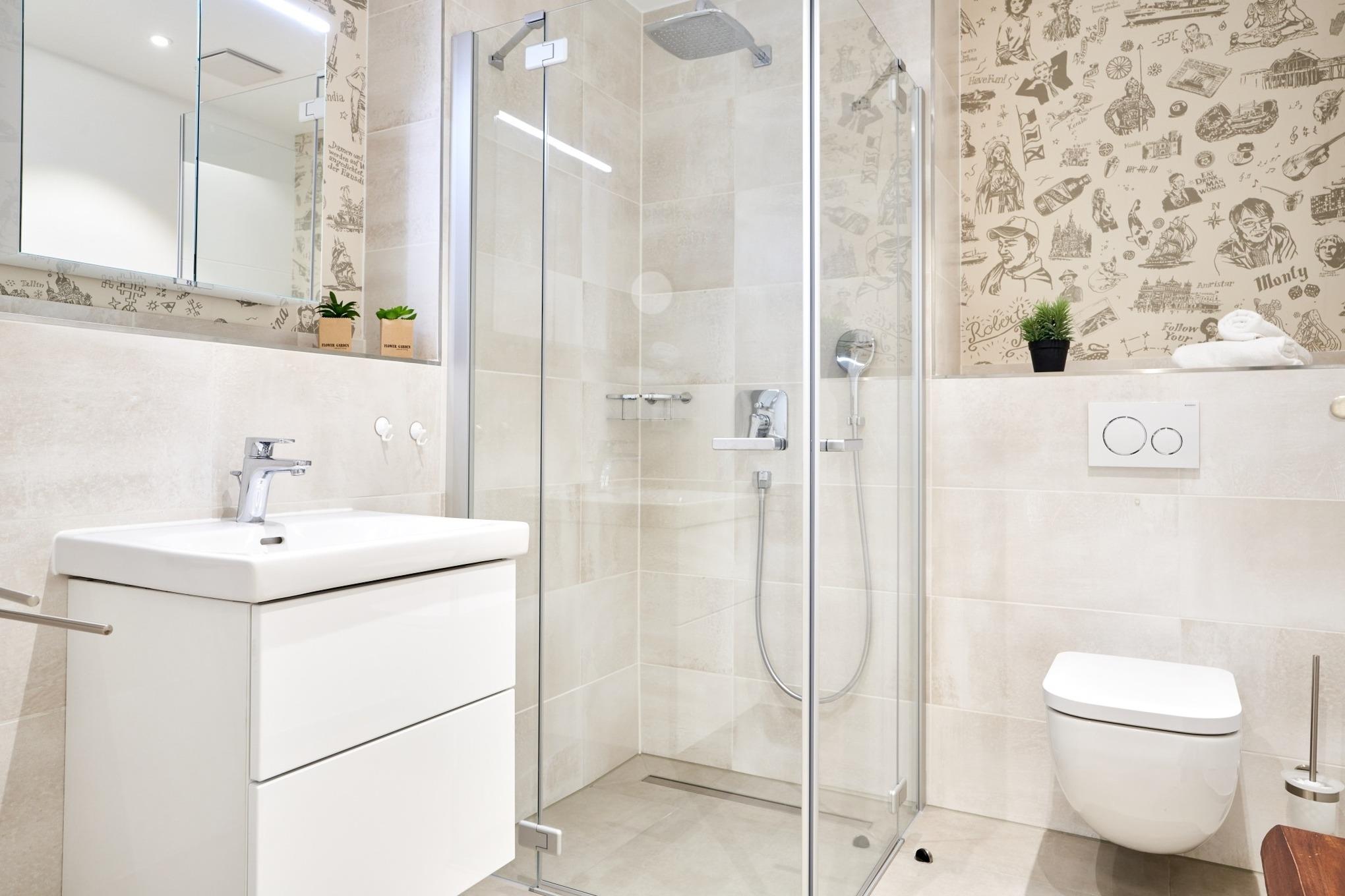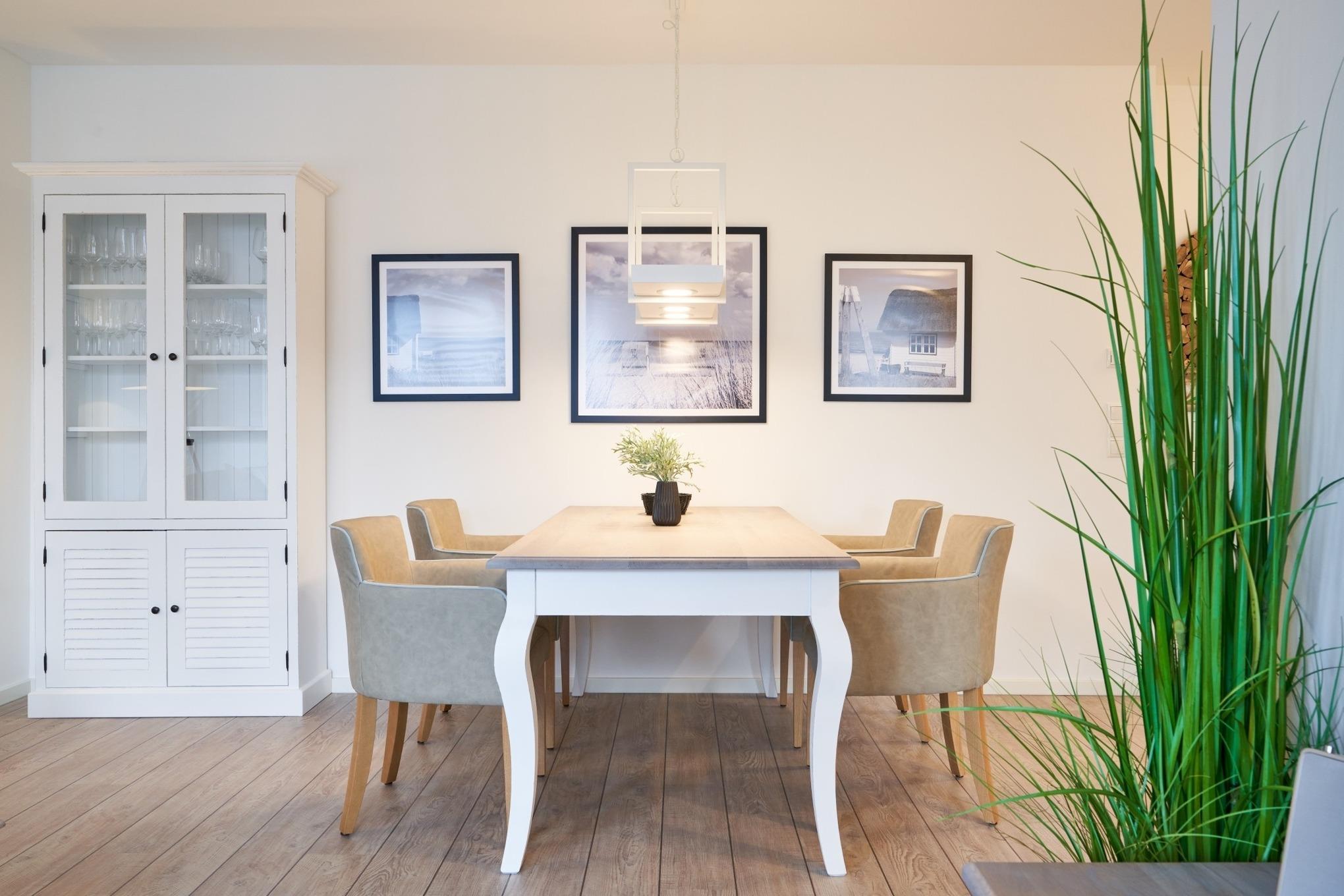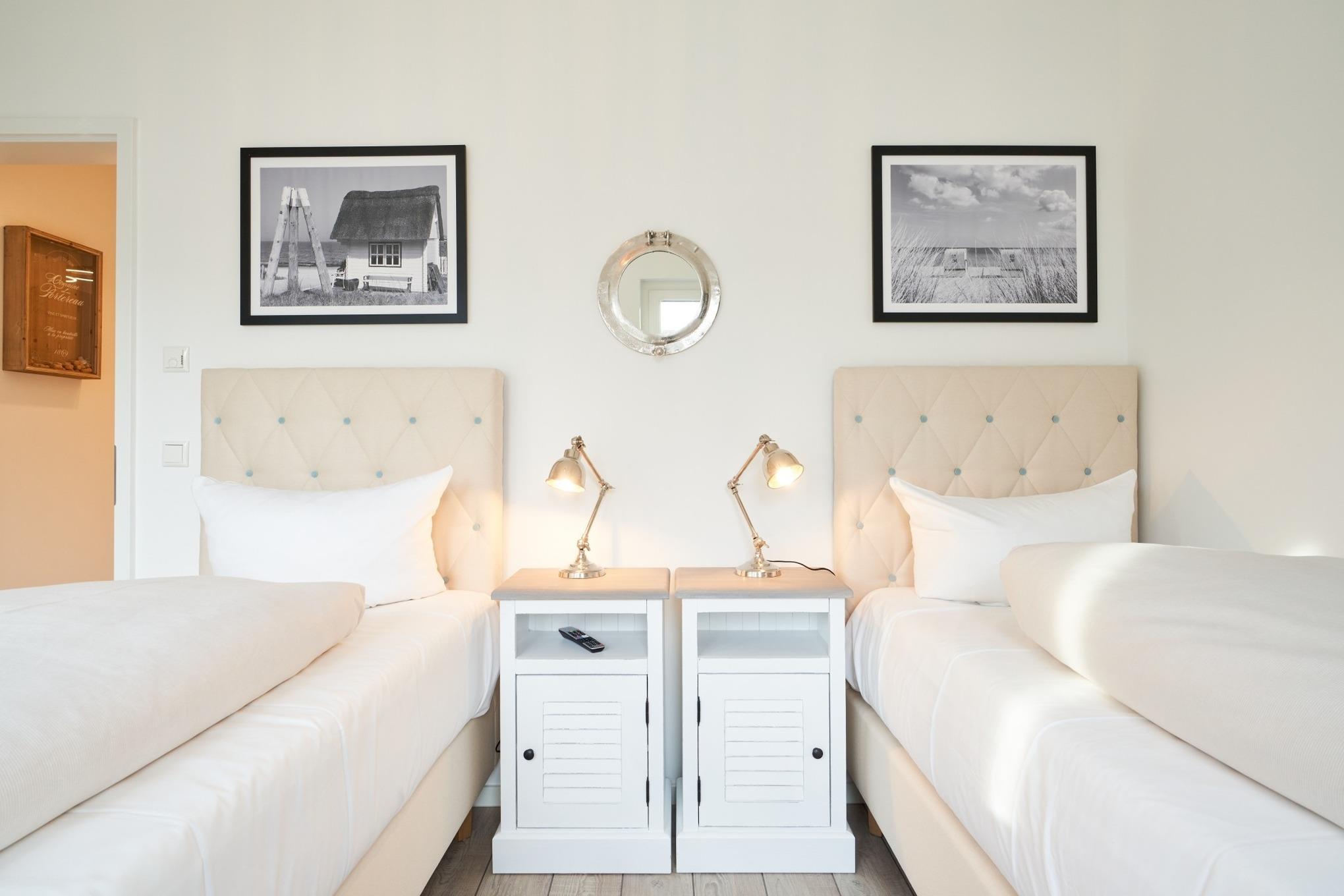 Die 3-Zimmer-Ferienwohnung ist mit bodentiefen Fenstern ausgestattet. An allen Fenstern befinden sich Licht- und Sichtschutz sowie Außenrollläden. Die Einbauküche im Wohn-Essbereich ist komplett ausgestattet. Backofen, Ceran-Kochfeld, Mikrowelle, Geschirrspüler, Kühlschrank mit Gefrierfach, Filterkaffeemaschine, Tassimo Kapselmaschinen, Eierkocher, Mixer, Toaster und Wasserkocher. Der Wohnbereich ist mit einem hochwertigen Sofa, einem Wohnzimmertisch, einem TV (55 Zoll) sowie einem Essbereich ausgestattet. Aus dem Wohnbereich gelangen Sie auf den überdachten Westbalkon. Hier stehen Ihnen Tisch und Stühle zur Verfügung. Das 1. Schlafzimmer ist mit einem Boxspringbett ( 2,00m x 2,00m), einem großen Kleiderschrank, 2 Nachttischen sowie einem Wand-TV (43 Zoll) ausgestattet. Das 2. Schlafzimmer hat zwei Einzel-Boxspringbetten (0,90m x 2,00m), 2 Nachttische, einen Kleiderschrank sowie einen Wand-TV (43 Zoll). Alle Fenster haben elektrische Außenrollläden. Das Duschbad in heller Optik mit bodengleicher Dusche / Regendusche, mit separater Handbrause, Handtuchheizkörper, Fön, Kosmetikspiegel. Die gesamte Wohnung ist mit einer Fußbodenheizung ausgestattet.