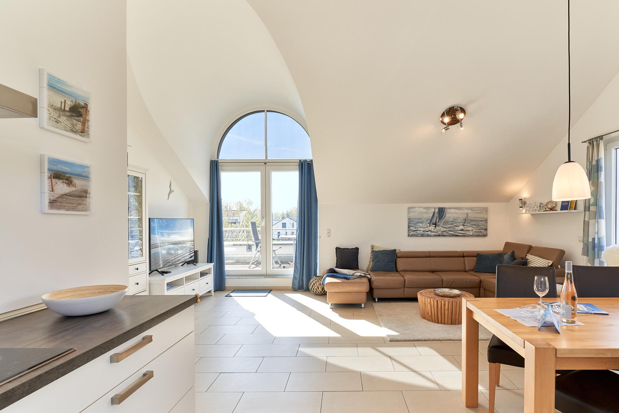 Genießen Sie Ihren Urlaub in dieser lichtdurchfluteten Ferienwohnung, die Ihnen mit ihren zwei Schlafzimmern und dem großen Wohnzimmer mit integrierter Küche, großem Esstisch, Relaxsessel und gemütlicher Fernsehecke, inklusive Musikanlage und Blu-ray-Player, viel Raum zum Entspannen bietet. WLAN steht Ihnen kostenlos zur Verfügung. Die nach Süden ausgerichtete, großzügige Sonnenterrasse ist vom Wohnzimmer und von beiden Schlafzimmern aus zu betreten. Hier stehen Tisch, Stühle, Liegen und ein Strandkorb für Sie bereit. Die Schlafzimmer sind mit Verdunklungsvorhängen und Flachbildfernsehern ausgestattet (Bettenbreite Einzelbetten 1,00 x 2,00m, Doppelbett 1,80x2,00m). Das helle Badezimmer mit Tageslicht verfügt über eine bodentiefe Dusche, Fußbodenheizung, Handtuchheizkörper, Waschmaschine und Wandwickeltisch.