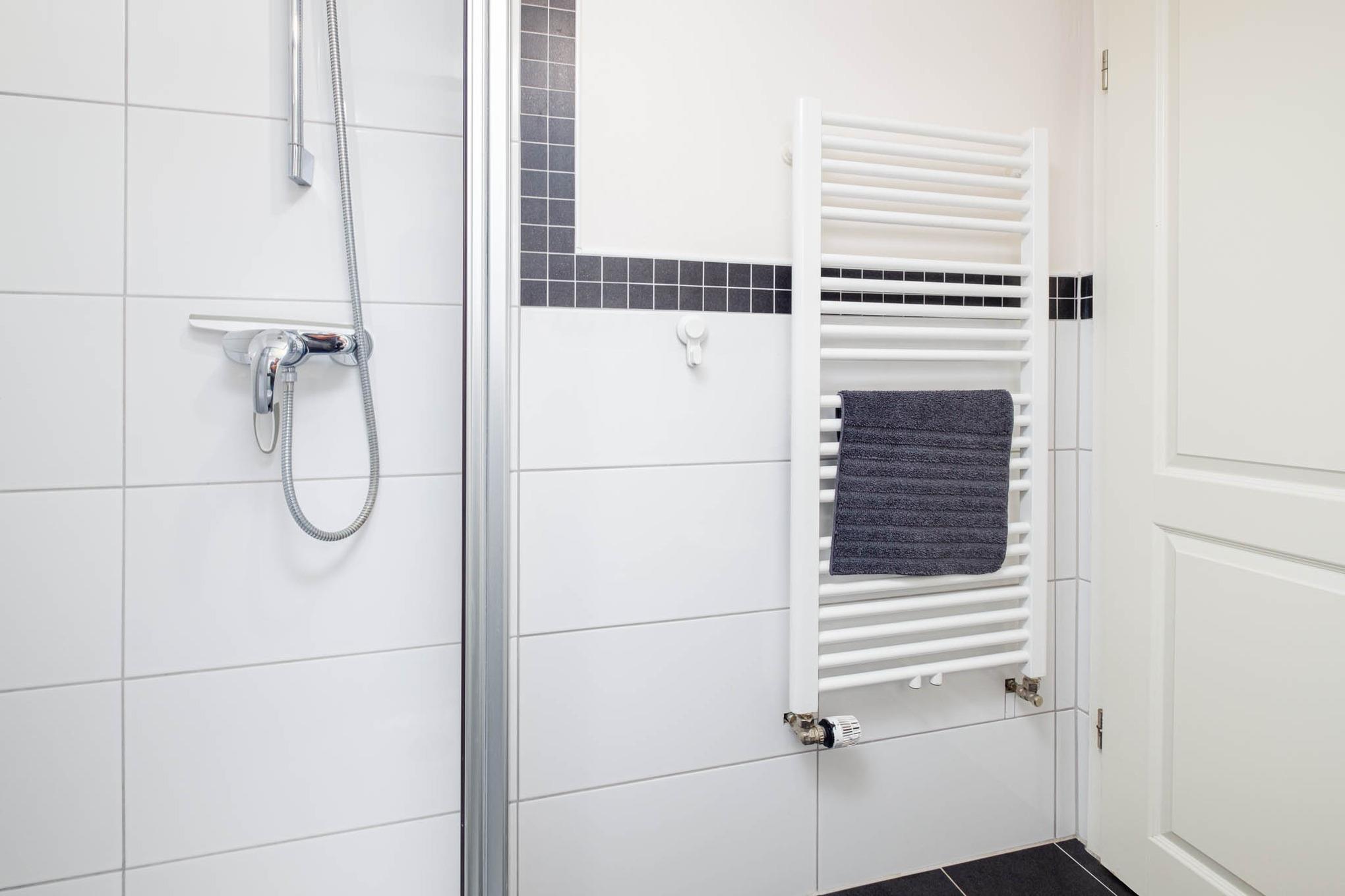 Vom Wohnbereich aus erreichen Sie das moderne Badezimmer mit WC und Dusche.