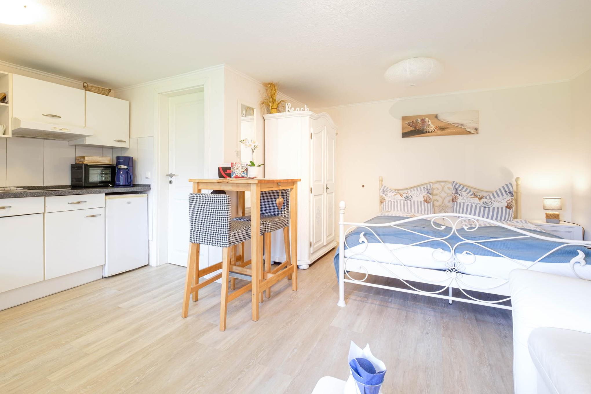 Die Scharbeutz Ferienwohnung Nr. 2 ist für maximal 2 Personen ausgelegt und befindet sich im Untergeschoss mit großzügiger Terrasse. Auf ca. 25qm erwartet Sie eine gemütlich und maritim eingerichtetes 1-Zimmer-Appartement.