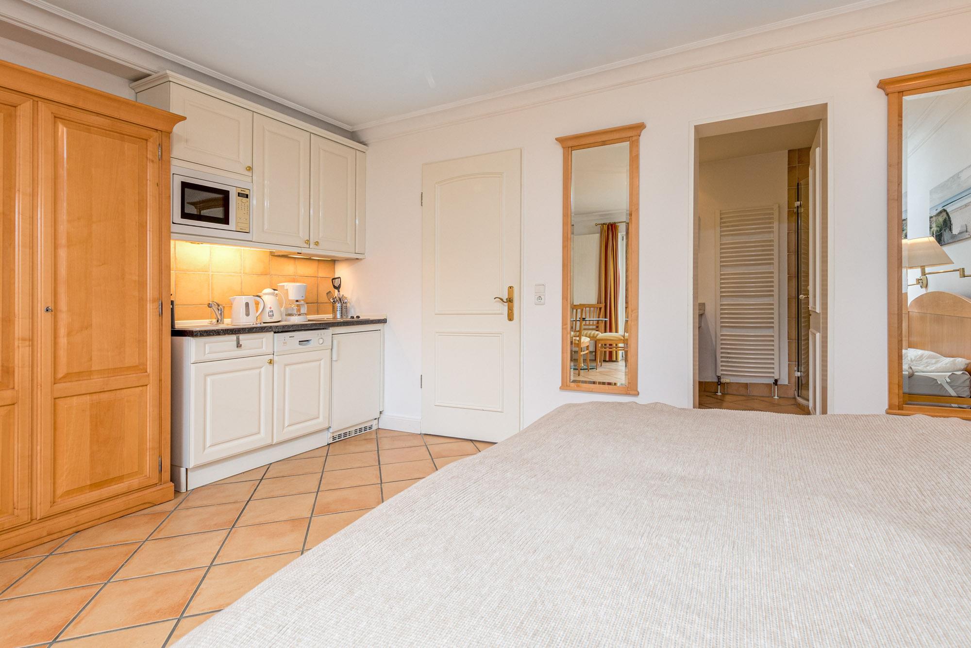 In der Scharbeutz Ferienwohnung Nr. 1 erwartet Sie ein kombiniertes Wohn-/Schlafzimmer mit Doppelbett (180x200 cm), einer Schlafcouch für die 3. Person (Liegefläche 140x200cm), Flatscreen-TV und Essecke. Die kleine Pantry Küche ist in den Wohnraum integriert und mit 2-Platten-Ceranfeld, Geschirrspüler und Mikrowelle ausgestattet. Das Badezimmer der Ferienwohnung Scharbeutz verfügt über eine Dusche, einen Doppelwaschtisch aus Granit, sowie ein Bidet. Um Ihnen einen erholsamen Schlaf zu garantieren, lassen sich die Schlafräume der Ferienwohnung verdunkeln.