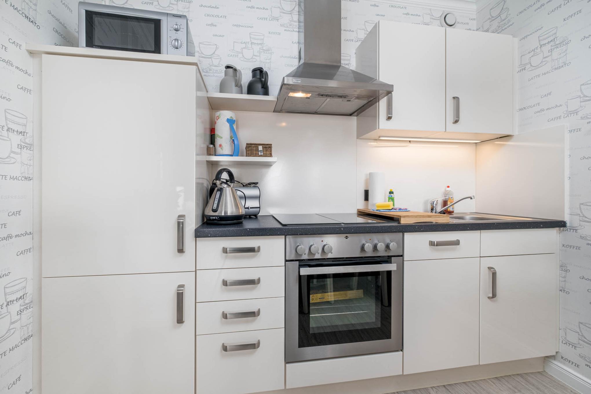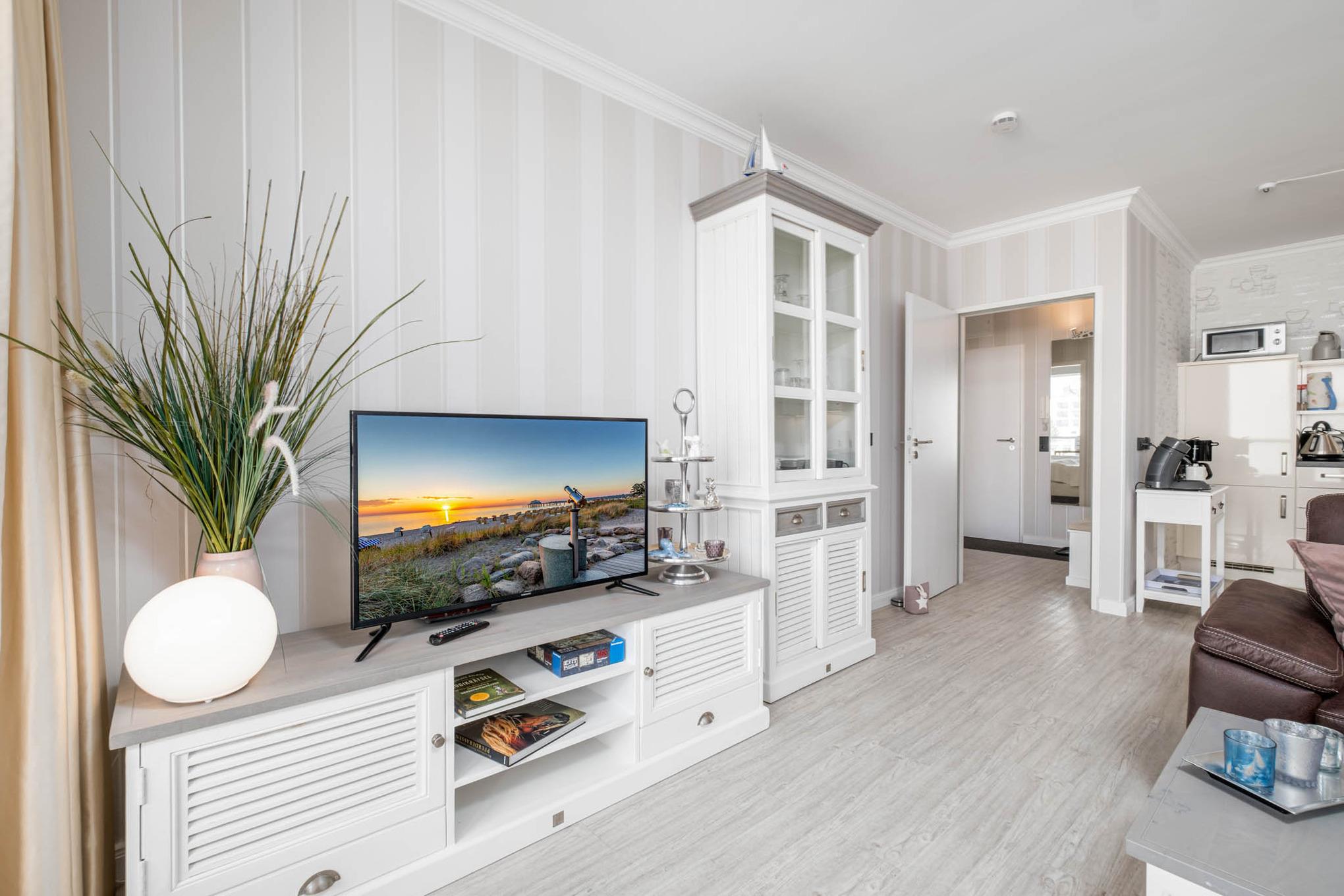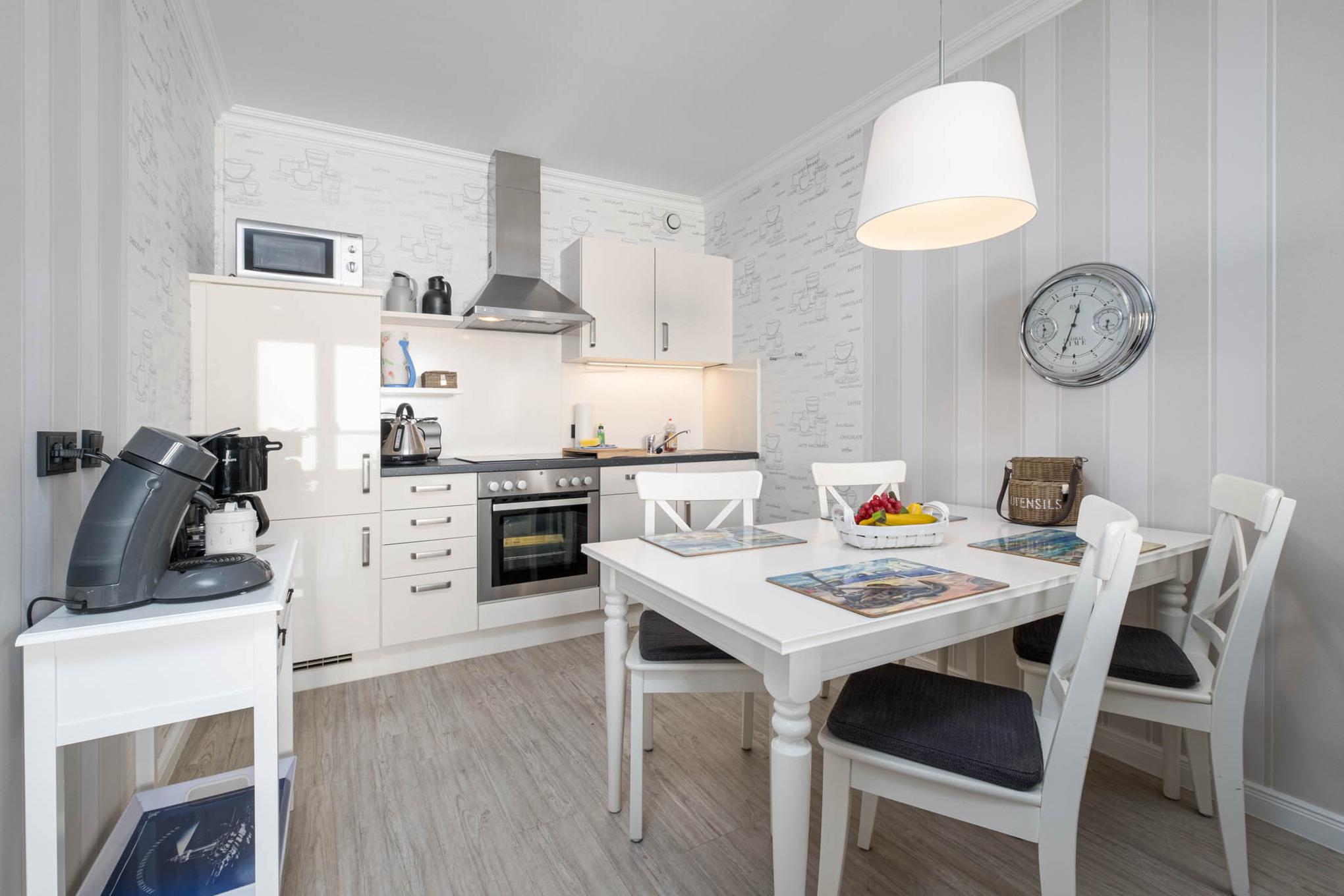 Das Wohnzimmer ist mit einem hochwertigen Schlafsofa, Flatscreen-TV, Radio mit CD-Player und Essbereich ausgestattet. Die offene Küche ist mit Ceranfeld, Kaffeefiltermaschine sowie eine Senseo-Padmaschine, Backofen, Geschirrspüler und Mikrowelle eingerichtet.