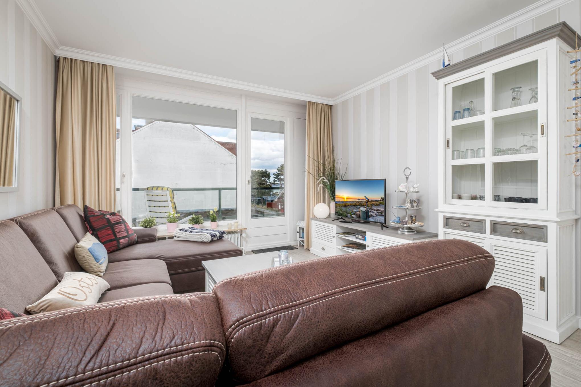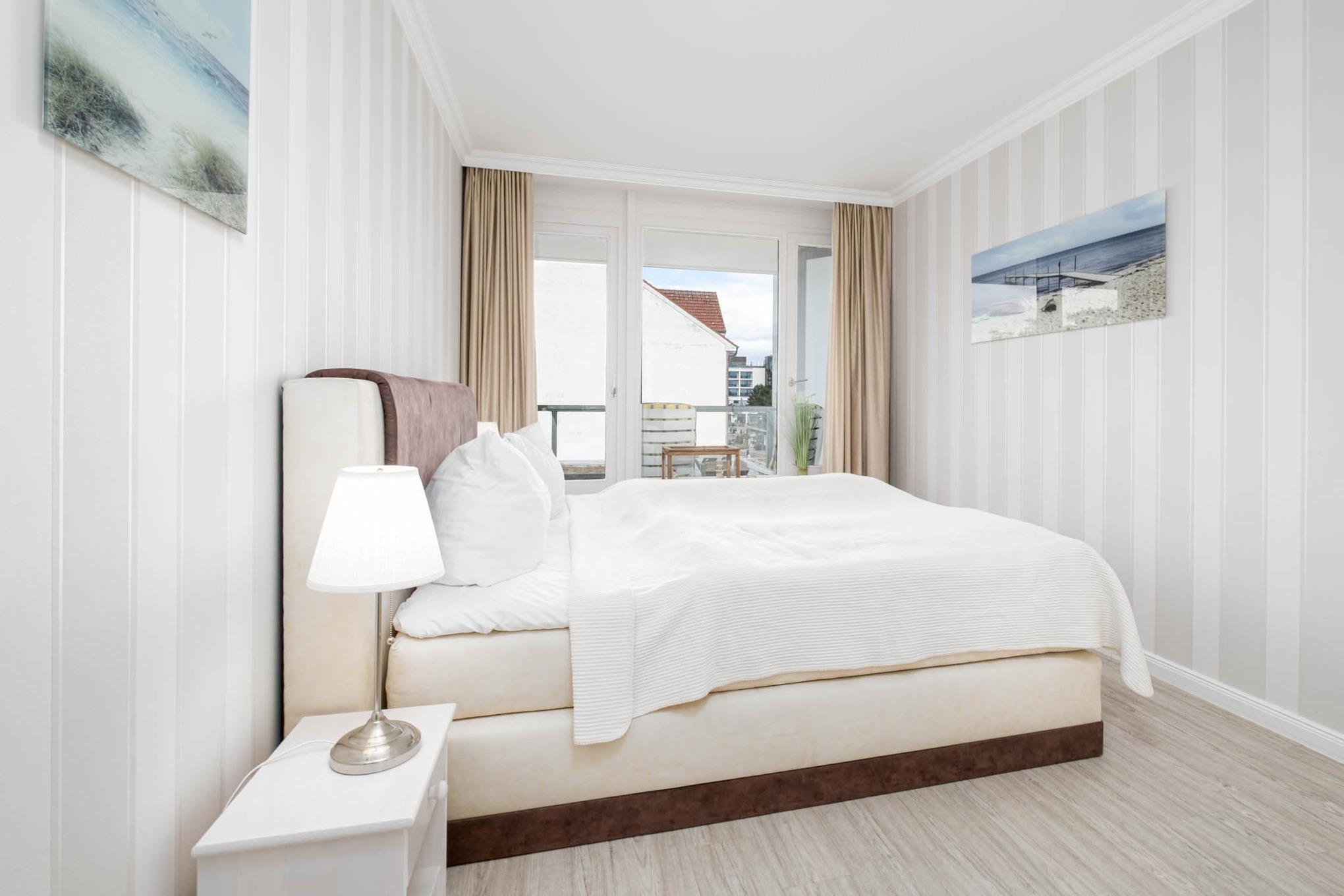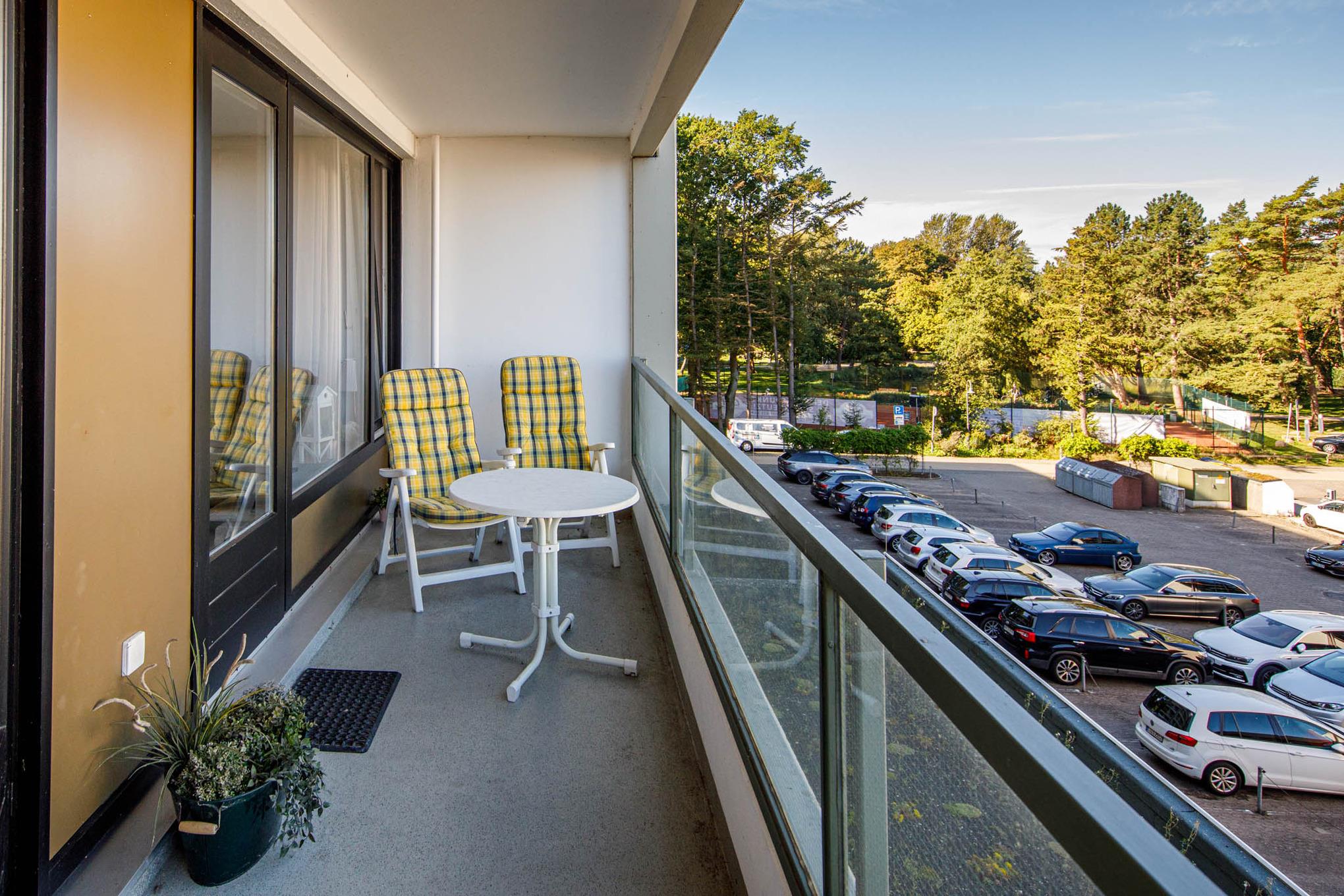 Vom Wohnzimmer und dem Schlafzimmer betritt man den großen Balkon. Von hier haben Sie zur einen Seite einen Blick über das Meer, zur anderen Seite schauen Sie auf den Kurpark.