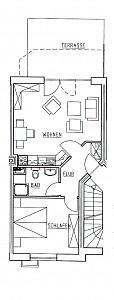 Das liebevoll ausgestattete, ca. 50 m² große 2-Zimmer-Komfort-Appartement befindet sich im Erdgeschoss, mit einer großen Sonnenterrasse und den dazugehörigen Möbeln.