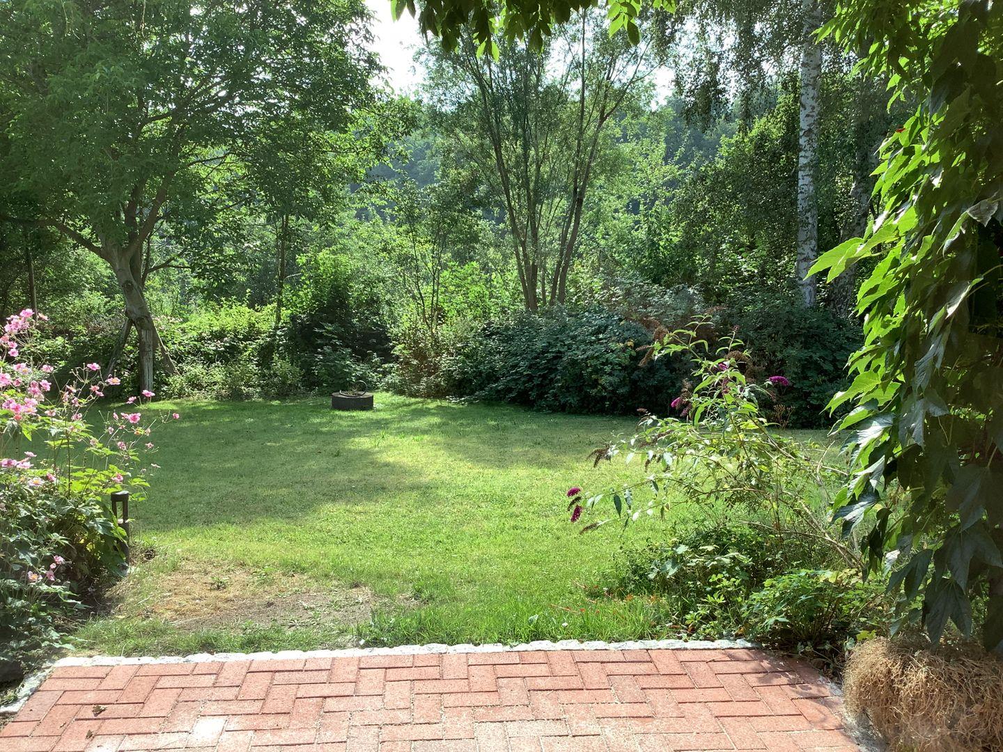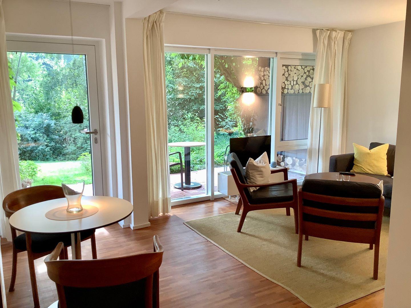 Erholung pur und absolute Ruhe mit direktem Gartenzugang zum Naturgarten. Das frische renovierte Zweizimmerapartment erwartet Sie mit einem neu eingerichteten Schlafzimmer mit neuem Polsterbett und hochwertigen Geltexmatratzen für einen erholsamen Schlaf. Ein Fernseher ist ebenfalls im Schlafzimmer vorhanden und Verdunklungsvorhänge sorgen für einen erholsamen Aufenthalt. Der Smart TV und ein AlexaEcho im Wohn-Essbereich lassen garantiert keine Langeweile aufkommen. Die komplett ausgestattete Küchenzeile, mit Backofen, Ceranfeld, großem Kühlschrank und Gefrierfach lässt keine Wünsche offen. Die kleine Terrasse mit Blick in den Garten gibt Ihnen die Gelegenheit morgens in der Natur zu frühstücken oder den Abend in Ruhe ausklingen zulassen. Gartenmöbel und eine Relaxliege stehen ebenfalls zur Verfügung.