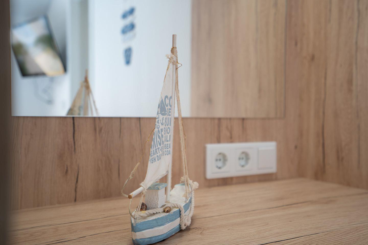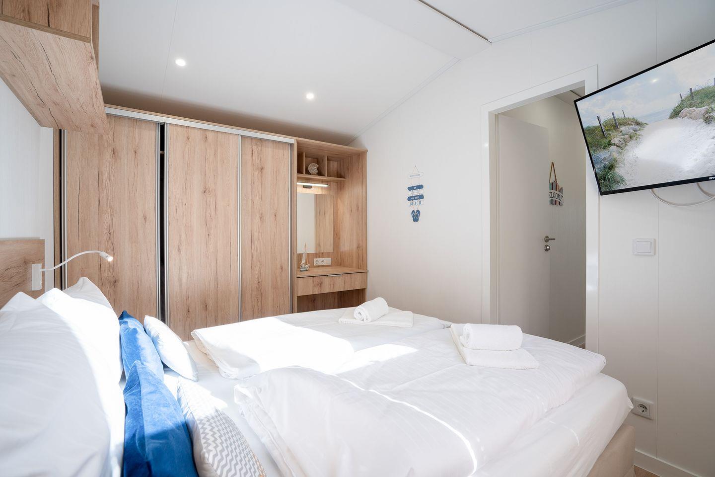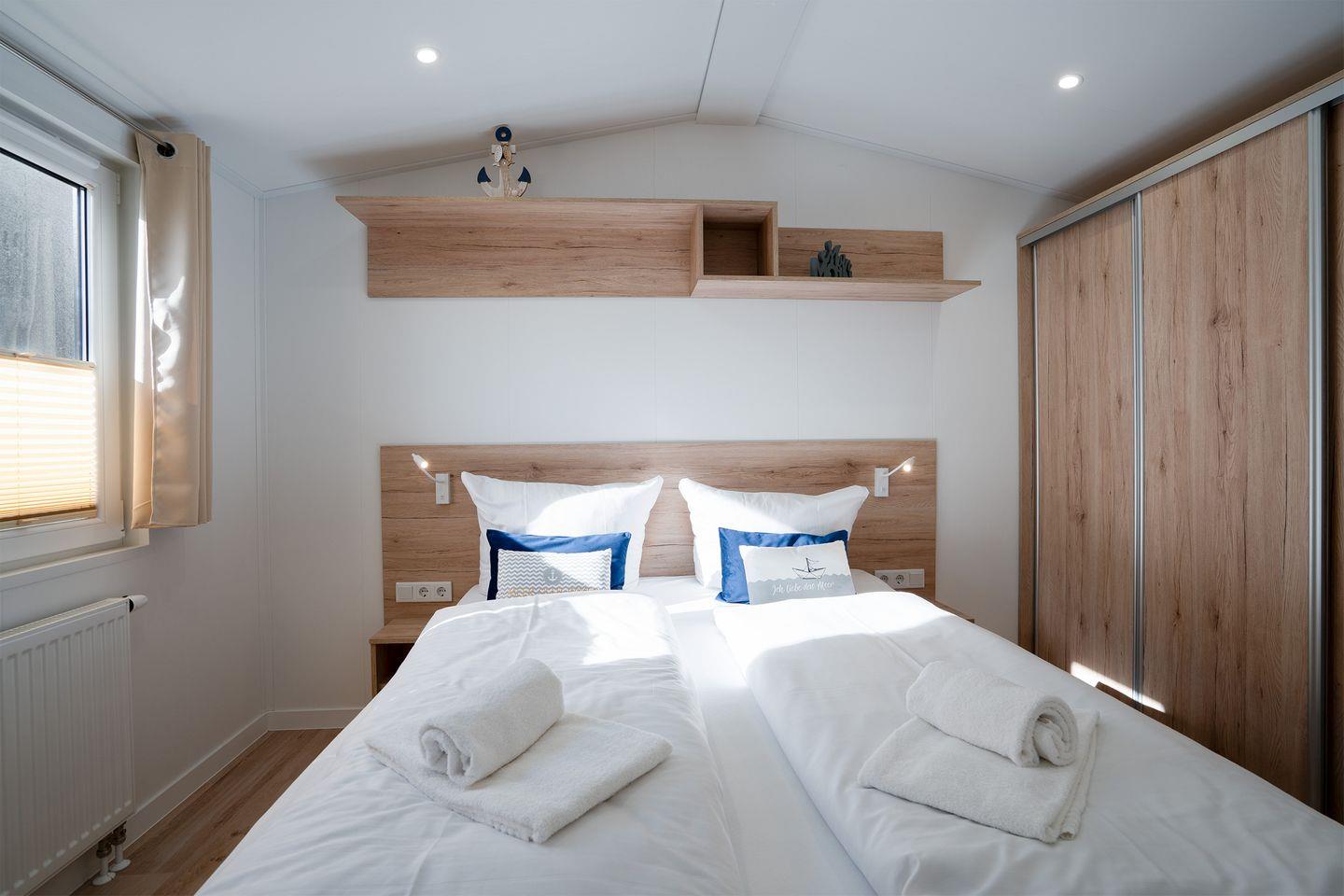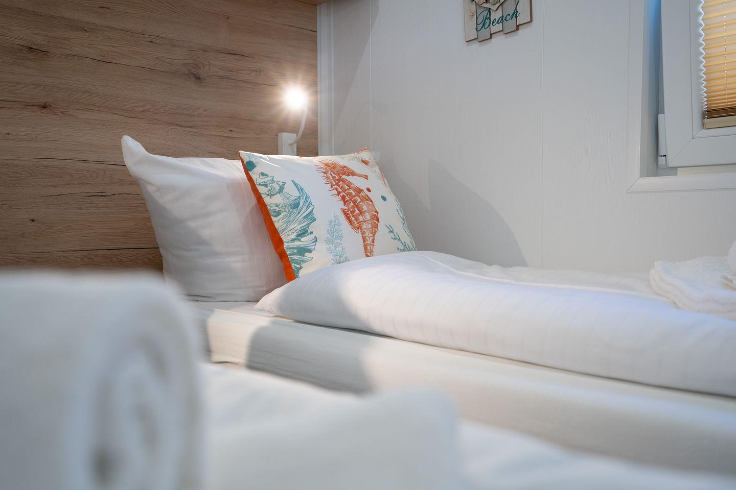 In einem Schlafzimmer befindet sich ein Doppelbett, im Zweiten gibt es zwei Einzelbetten. Für Familien mit mehr als 3 Kindern steht im Wohnbereich noch eine Schlafcouch zur Verfügung, sodass bei Maximalbelegung bis zu 4 Erwachsene und 2 Kinder Platz finden. Die Terrasse lädt zu einem gemütlichen Grillabend oder dem Frühstück in der Morgensonne ein.
