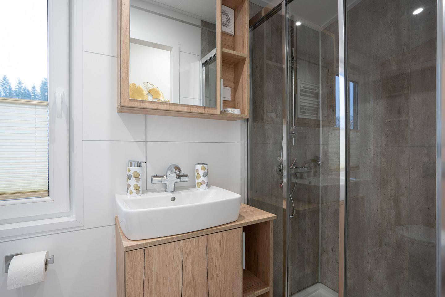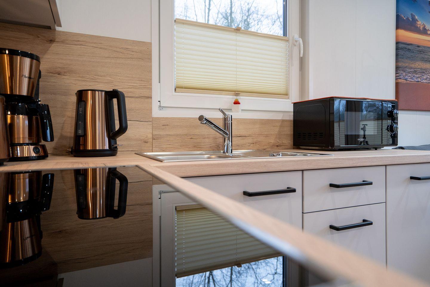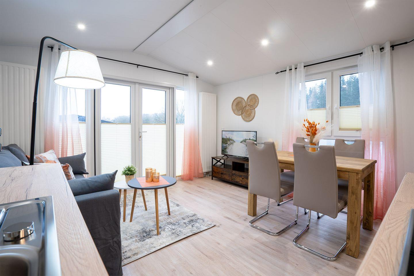 Im Inneren des Ferienhauses erwartet Sie ein gemütliches Ambiente. Das offene Wohn- und Esszimmer ist geschmackvoll eingerichtet und bietet eine entspannte Atmosphäre, ideal für gemeinsame Mahlzeiten und gesellige Abende. Die gut ausgestattete Küche ermöglicht es Ihnen, Ihre Lieblingsgerichte zuzubereiten, und das Badezimmer ist modern und komfortabel.