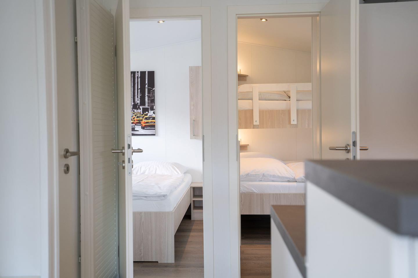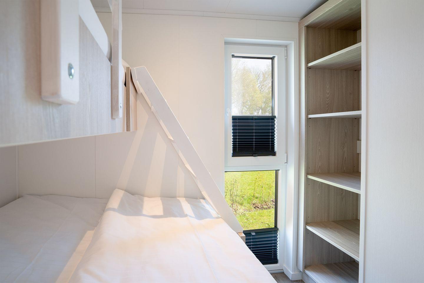 Das Chalet Haffkrug 59 bietet Ihnen einen offenen Wohn-Essbereich mit sehr gut ausgestatteter Küche, in der Sie an einem Esstisch mit der ganzen Familie sitzen können, einem Schlafzimmer mit einem 1,60 x 2,00m Bett und einem Schlafzimmer mit einem 1,40 x 2,00m Bett über dem sich ein 0,80 x 2,00m Hochbett (nur für Kinder) befindet. Sie finden hier Platz für bis zu 4 Erwachsene + 1 Kind mit allem Komfort, den Sie benötigen. In der Grundüberlegung ist das Objekt geplant für eine Familie mit bis zu 3 Kindern.