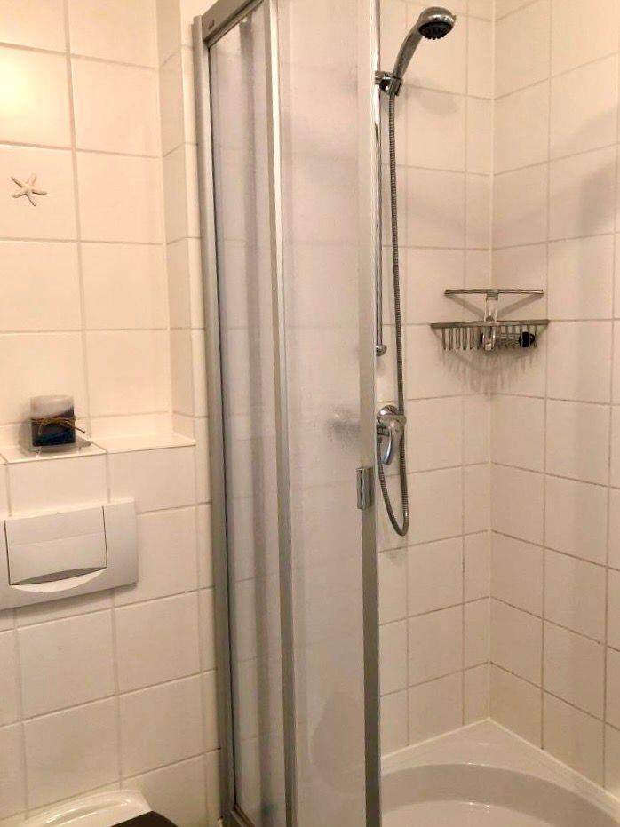 Das Duschbad besitzt einen extra großen Waschtisch mit Spiegel, eine verglaste Runddusche und einen Handtuchwärmekörper. Die Waschmaschine mit integriertem Trockner komplettiert dieses Duschbad, so dass Sie bei Bedarf Ihre Wäsche unkompliziert reinigen können. Selbstverständlich sind in der MeerZeit neben einem Wäschekorb, Handseife und Toilettenpapier für den Start auch ein Föhn und ein Kosmetikspiegel vorhanden.
