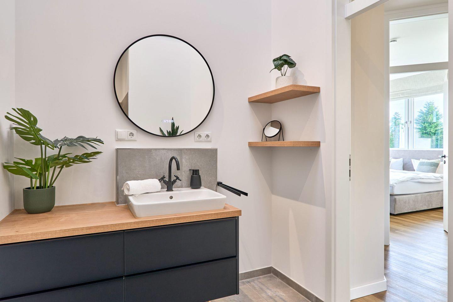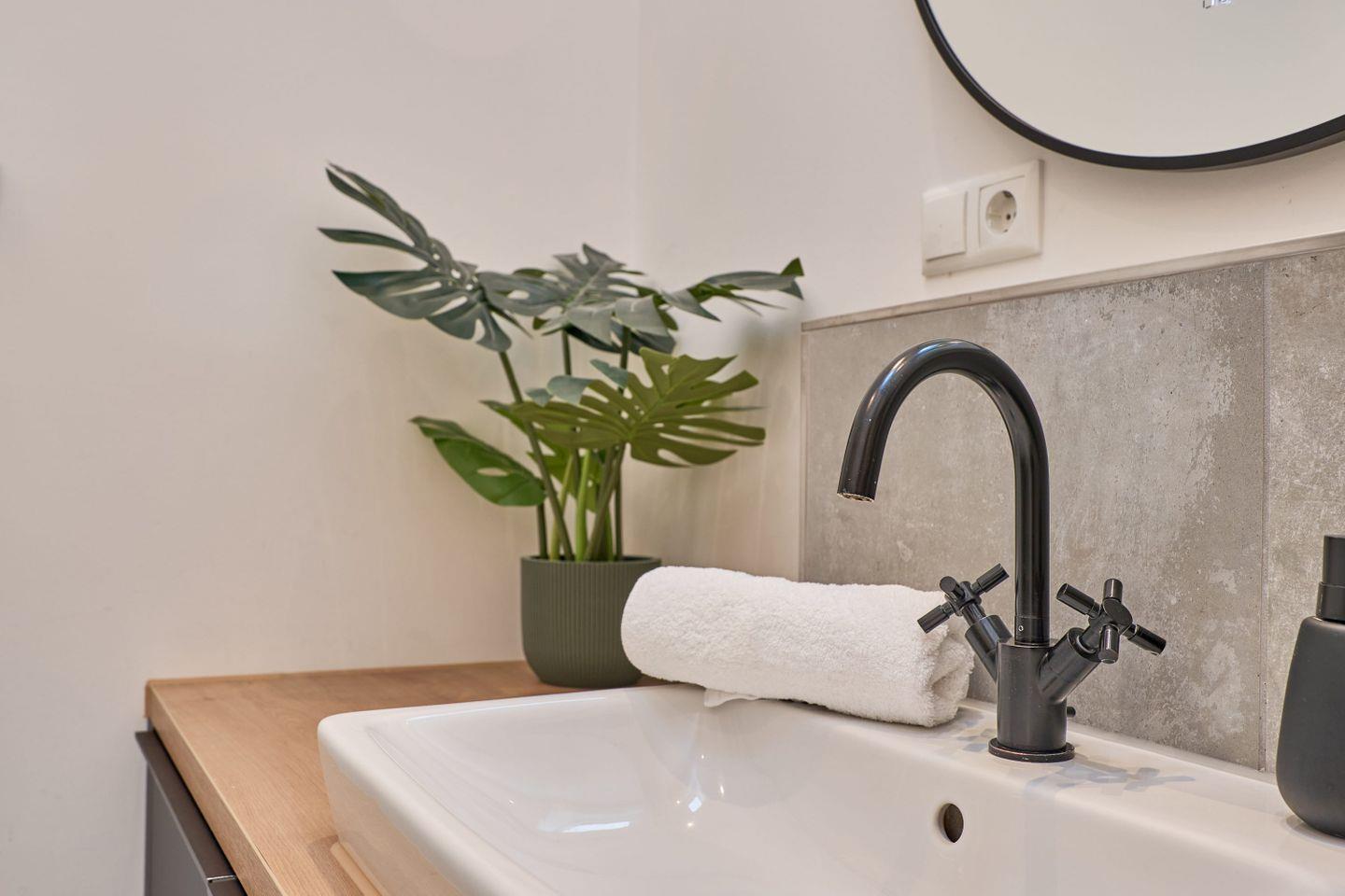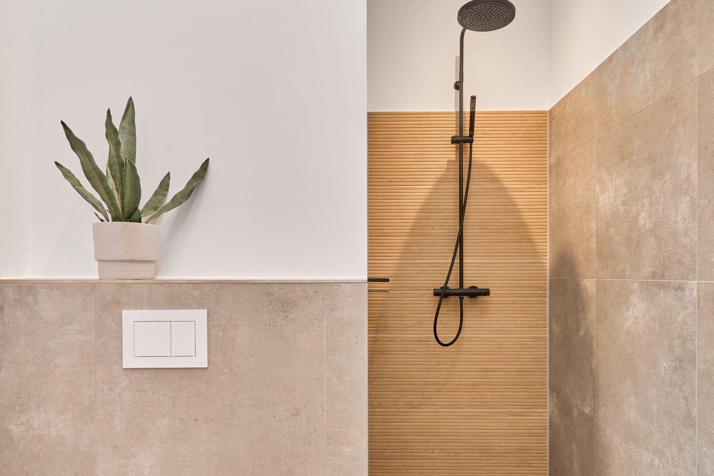 Für zusätzlichen Komfort gibt es zwei moderne Badezimmer. Eines bietet eine großzügige Badewanne und eine Dusche, während das zweite ebenfalls eine Dusche besitzt. Beide Bäder sind in neutralen Naturtönen gehalten und mit Pflanzen gestaltet, die eine angenehme Wohlfühlatmosphäre schaffen. Ein Föhn ist ebenfalls vorhanden.