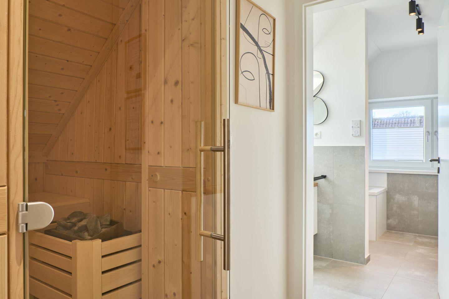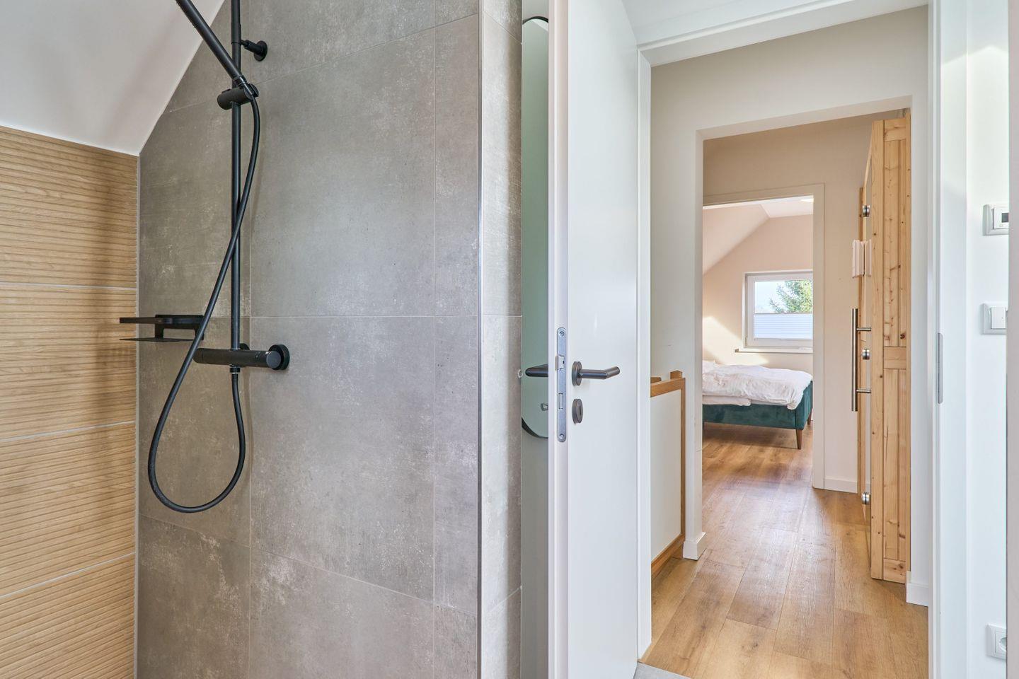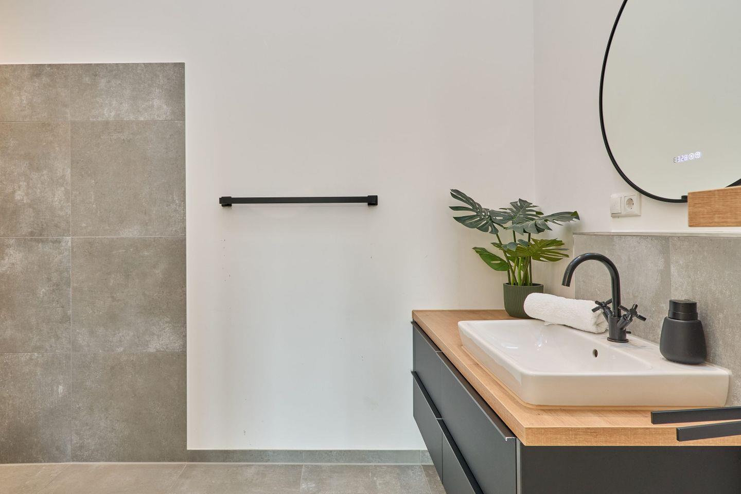 Für zusätzlichen Komfort gibt es zwei moderne Badezimmer. Eines bietet eine großzügige Badewanne und eine Dusche, während das zweite ebenfalls eine Dusche besitzt. Beide Bäder sind in neutralen Naturtönen gehalten und mit Pflanzen gestaltet, die eine angenehme Wohlfühlatmosphäre schaffen. Ein Föhn ist ebenfalls vorhanden.