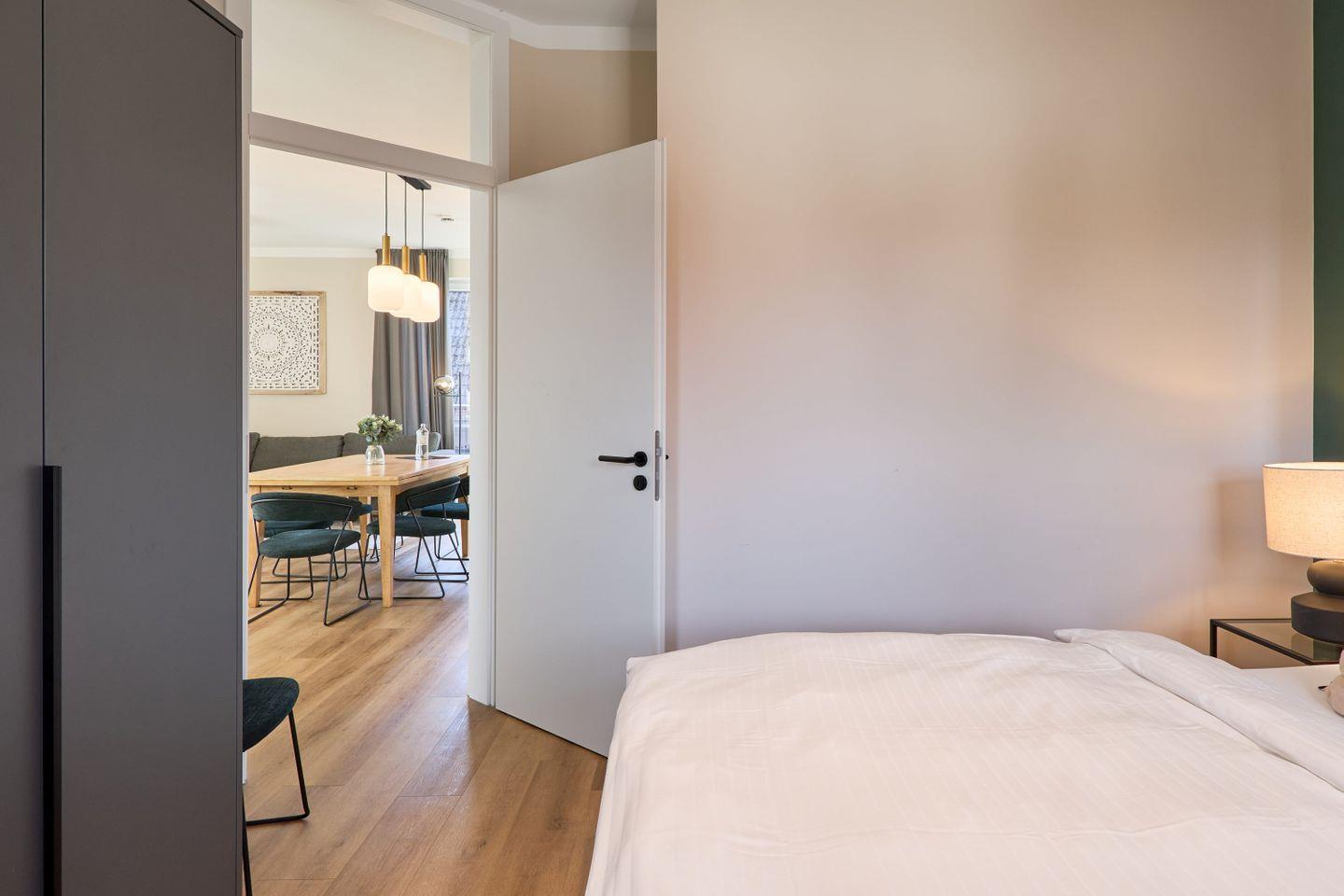 Die Wohnung umfasst drei stilvoll eingerichtete Schlafzimmer. Zwei Zimmer sind mit einem komfortablen Boxspringbett (180x200 cm), einem 32-Zoll-Flachbildfernseher und geräumigen Kleiderschränken ausgestattet. Im dritten Schlafzimmer findet Ihr ein Boxspringbett (160x200 cm), ebenfalls mit Kleiderschrank und zudem einem Schreibtisch, der auch als Rückzugsort oder Arbeitsplatz dient.