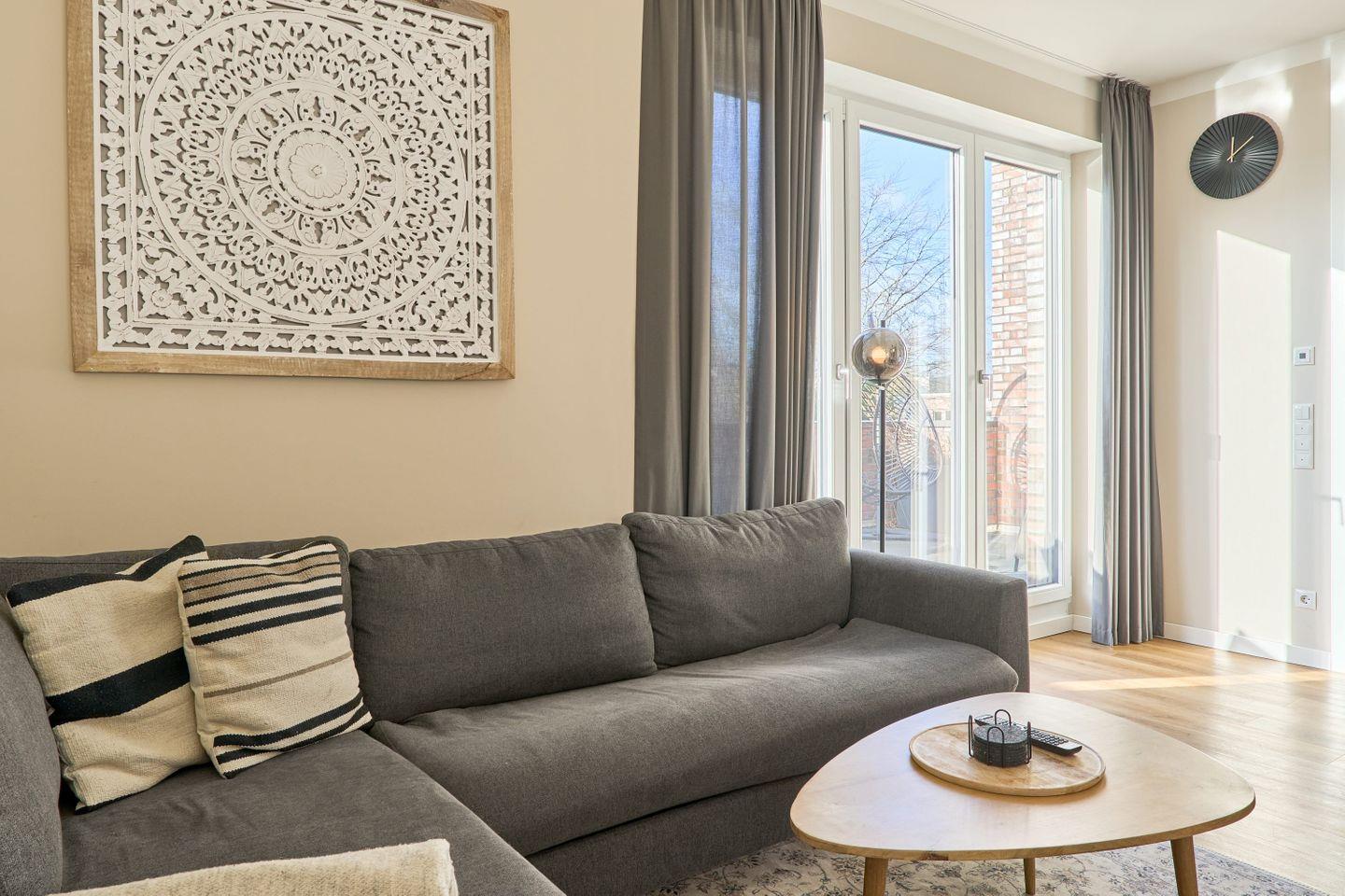 Die Ferienwohnung Sun Deck in Scharbeutz bietet auf 100 qm viel Platz und eine exklusive Ausstattung für bis zu 8 Personen – ideal für Familien und Freundesgruppen, die Wert auf Komfort und Erholung legen. Der großzügige geschmackvoll eingerichtete Wohnbereich mit einer großen, bequemen Schlafcouch (140x200 cm) lädt zum Entspannen ein und lässt sich leicht in ein zusätzliches Bett verwandeln. Ein 50-Zoll-Smart-TV sorgt für Unterhaltung. Der angrenzende Essbereich mit einem großen Tisch bietet viel Platz für gemeinsame Mahlzeiten und gemütliche Abende.