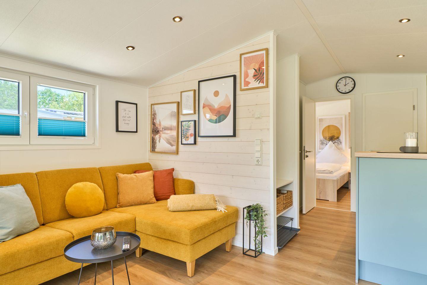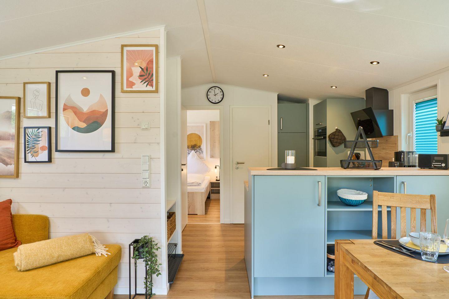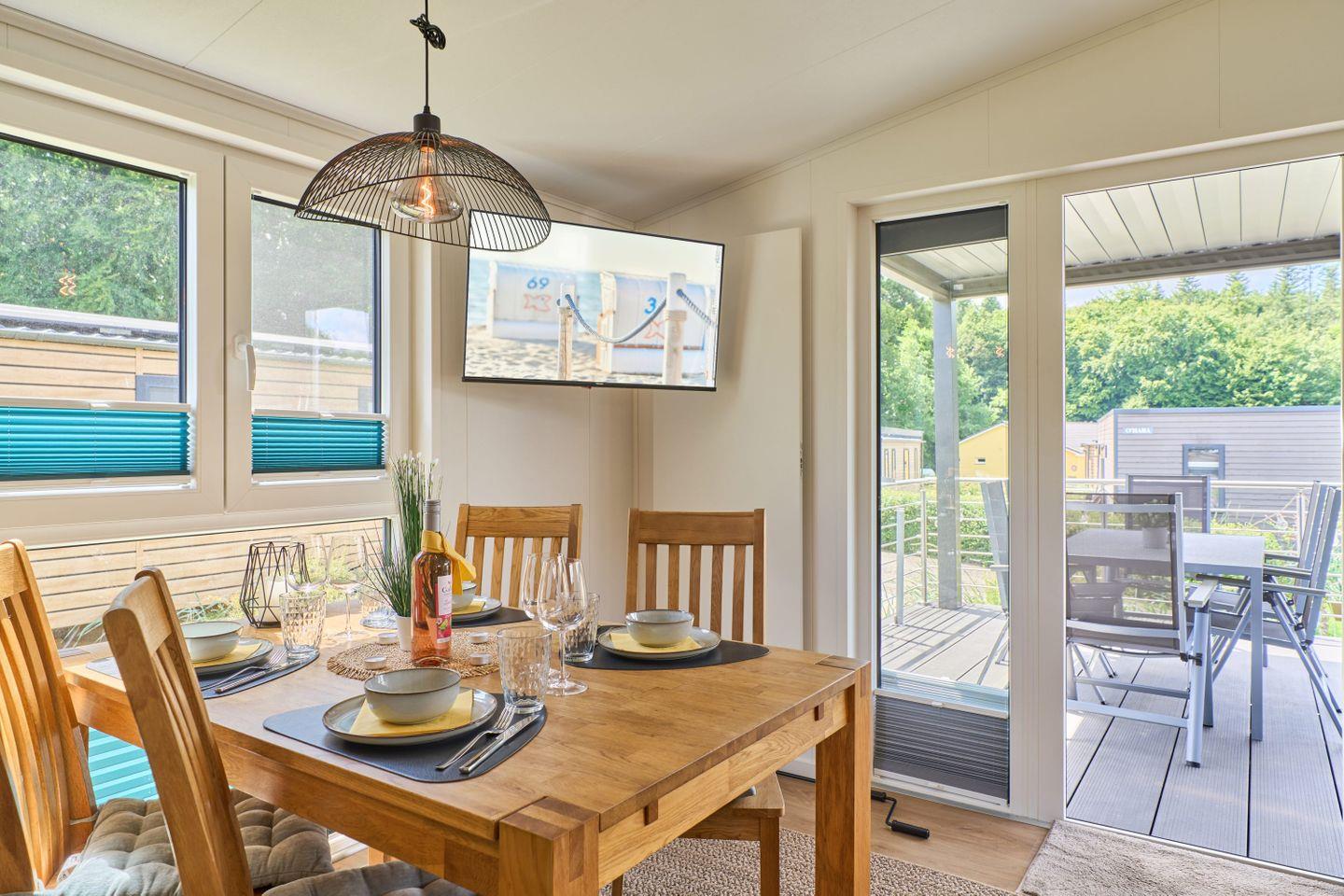 Der offene Wohn- und Essbereich ist mit einem gemütlichen Sofa, einem Esstisch und einem Fernseher ausgestattet, der für entspannte Abende sorgt. Die Küche lässt keine Wünsche offen: Egal ob Sie ein schnelles Frühstück zaubern oder ein aufwendiges Abendessen zubereiten möchten – Herd, Geschirrspüler, Backofen und Kühlschrank sind bereit, Ihre kulinarischen Ideen umzusetzen.