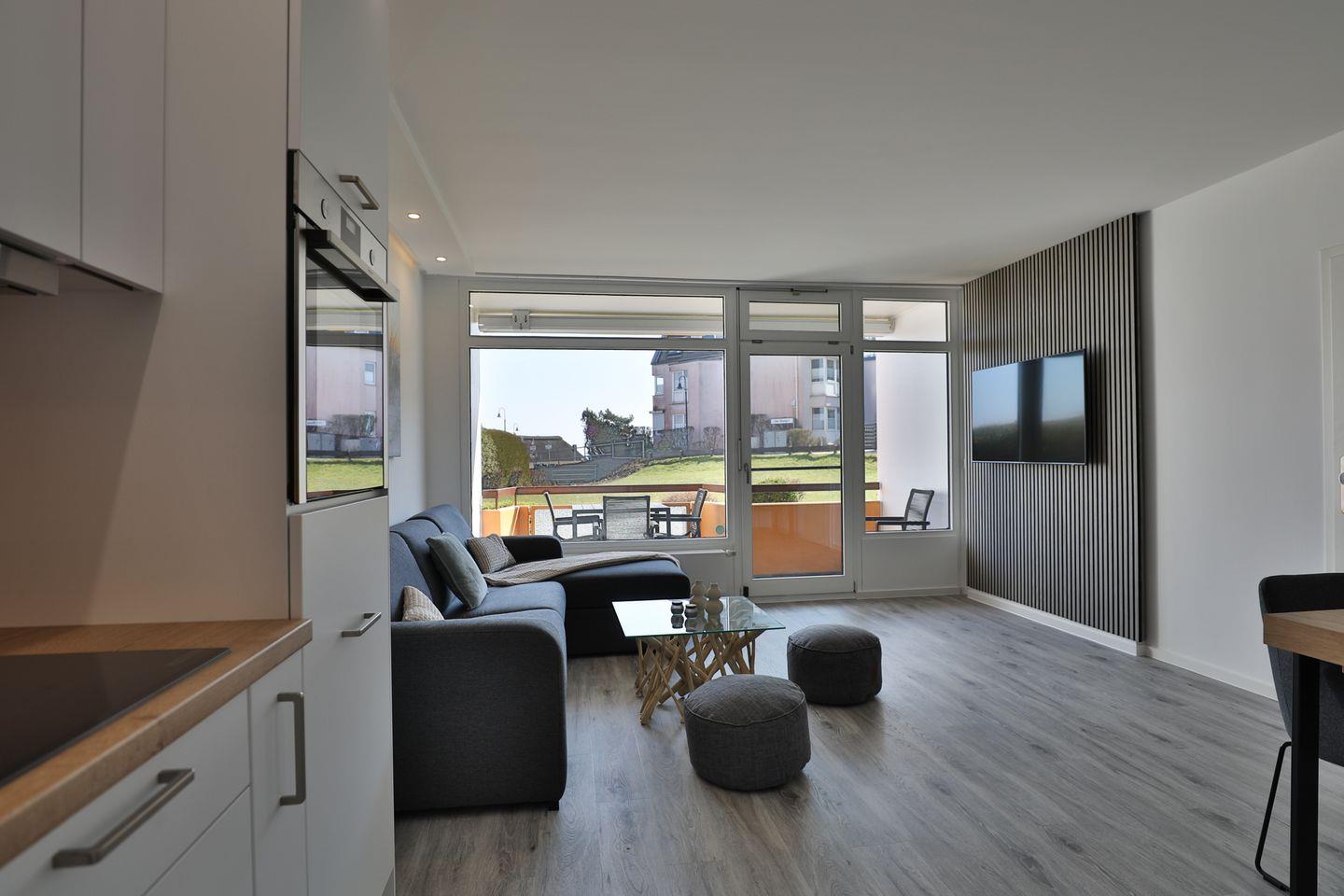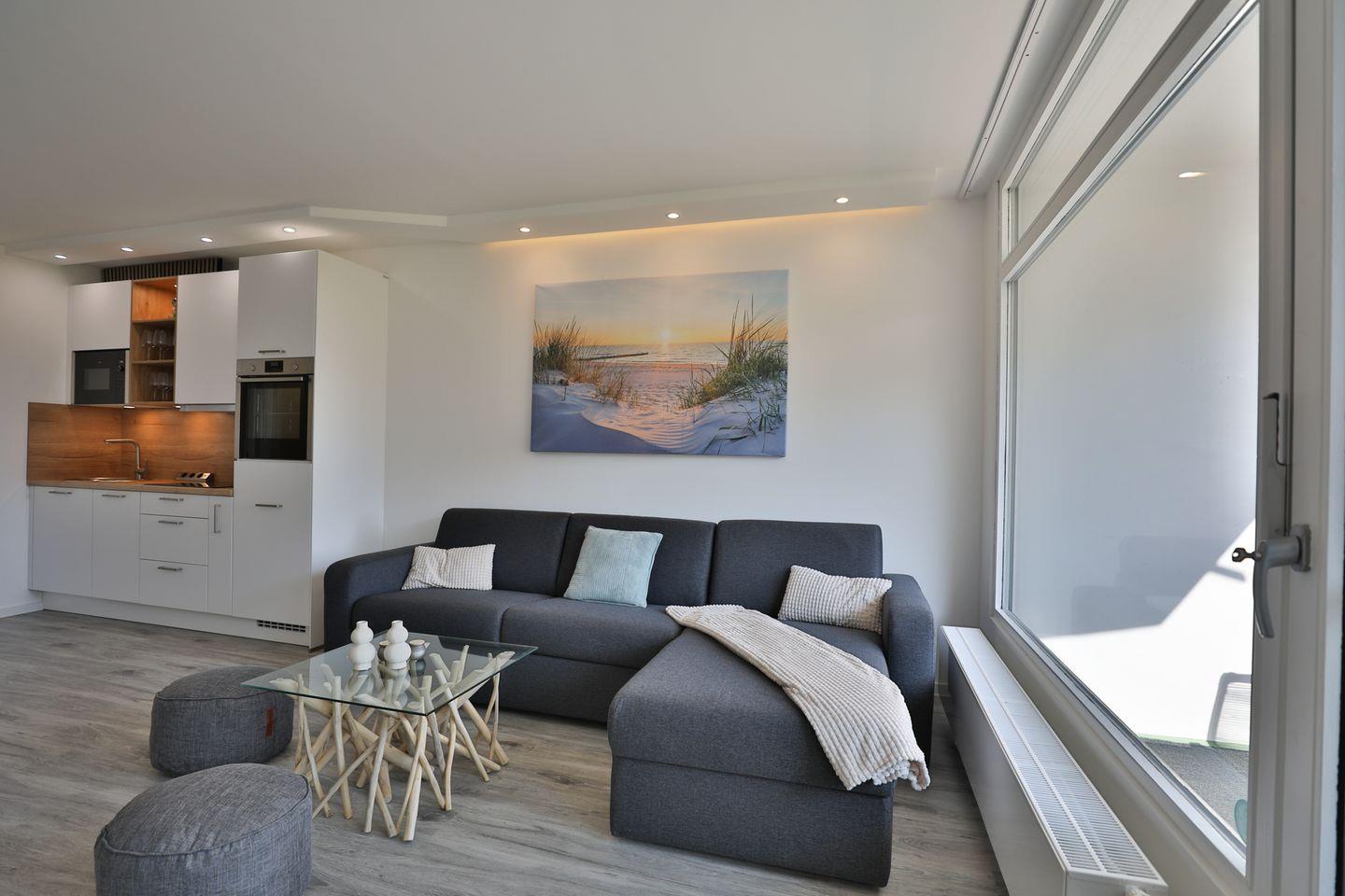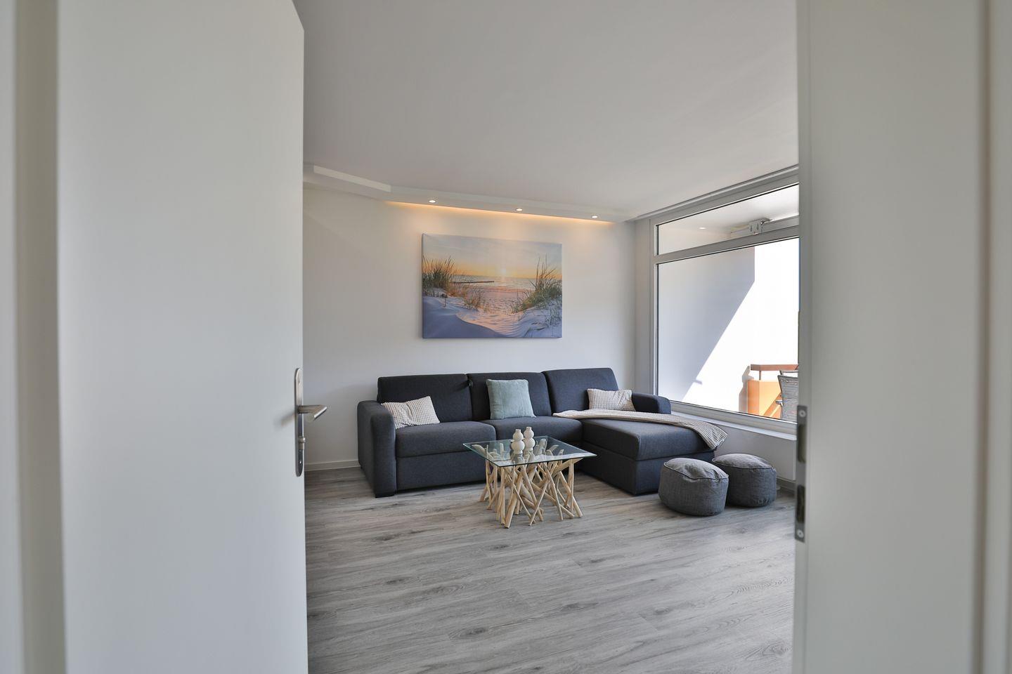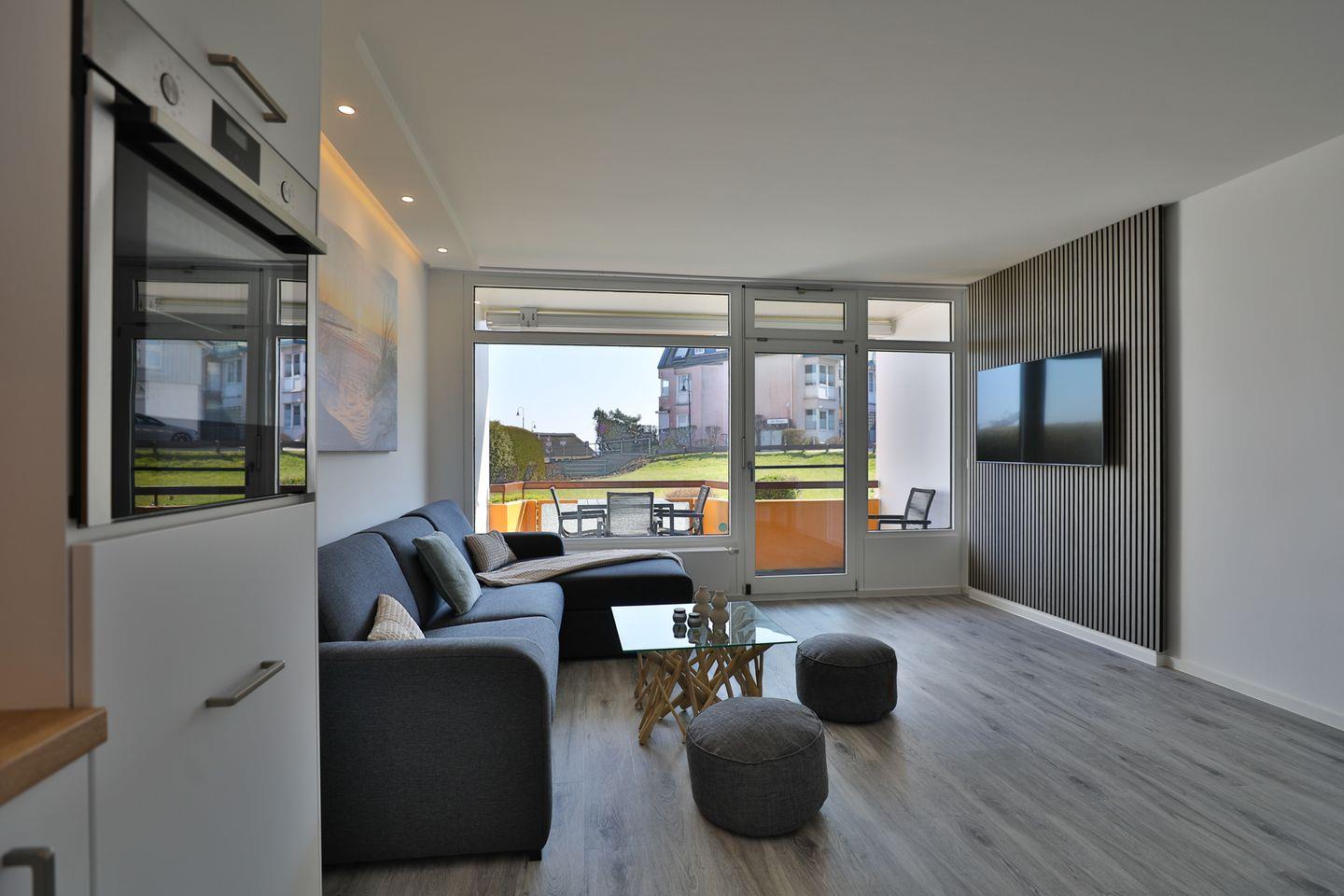 Der helle Wohn-Essbereich mit offener Küche lädt zum gemeinsamen Kochen und Entspannen ein. Eine große Schlafcouch bietet eine zusätzliche Schlafmöglichkeit, sodass die Wohnung flexibel genutzt werden kann. Der nach Süden ausgerichtete Balkon verspricht ganztägig Sonne und bietet einen Teilmeerblick, der zum Verweilen einlädt.