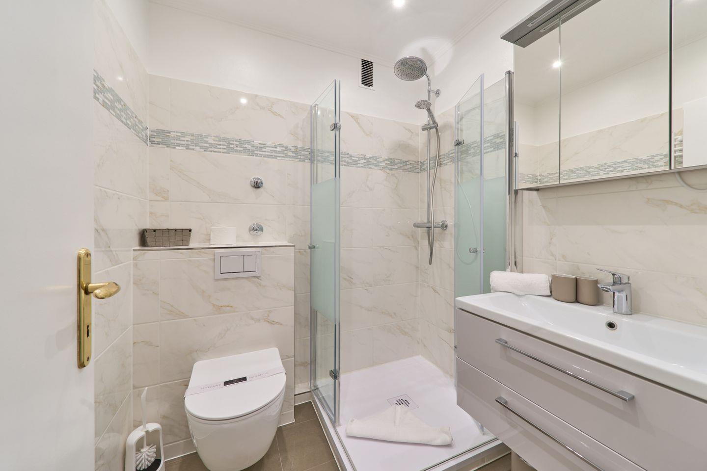 Das moderne Badezimmer bietet eine hochwertige Ausstattung mit Dusche, Waschbecken und WC. Helle Fliesen und stilvolle Akzente verleihen dem Raum eine angenehme Frische, die zu einem gelungenen Start in den Tag beiträgt.