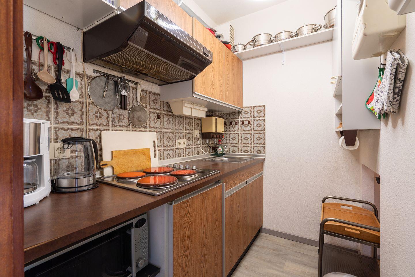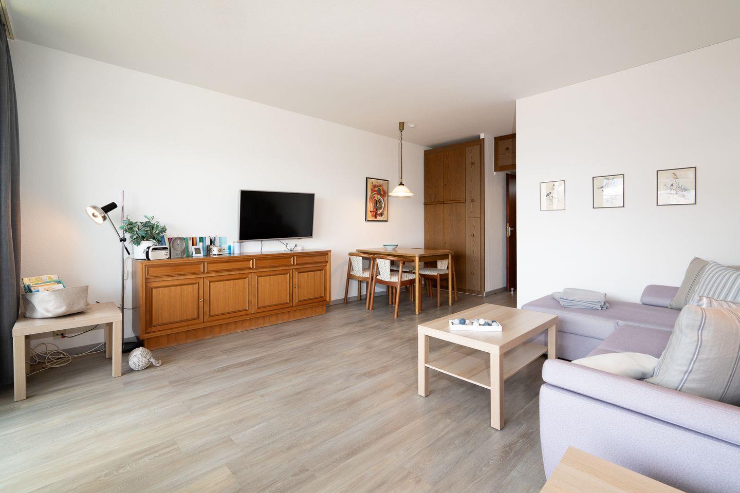Das Apartment ist hell und einladend gestaltet, der Wohnbereich verfügt über ein gemütliches Sofa mit Schlaffunktion sowie einen Essbereich, wo Sie entspannte Mahlzeiten genießen können. Ein Fernseher mit einer Bildschirmgröße von 35-44 Zoll sorgt für Unterhaltung an ruhigen Abenden. Die Küche ist ausgestattet mit einem Herd, Kühlschrank, Geschirr und Besteck sowie Küchengeräten wie einem Wasserkocher, Toaster und einer Kaffeemaschine.