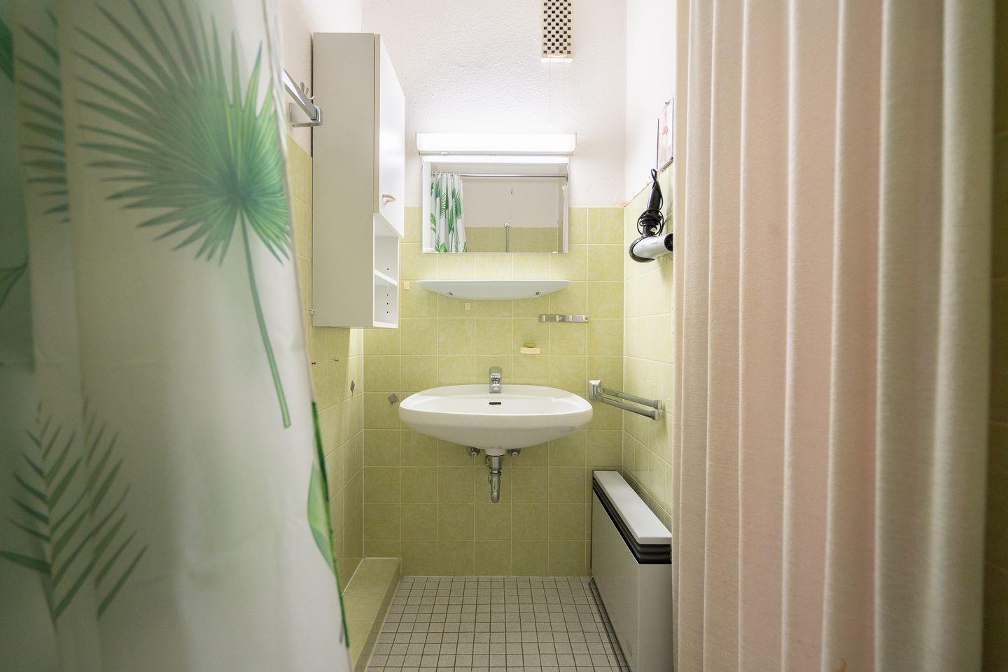Das Schlafzimmer bietet einen komfortablen Rückzugsort mit ausreichend Platz für Ihre persönlichen Gegenstände. Es ist mit einem hochwertigen Bett ausgestattet (140 cm x 200 cm), das erholsame Nächte garantiert. Das Schlafsofa im Wohnbereich (140 cm x 200 cm) bietet Platz für zwei weitere Personen. Das innenliegende Badezimmer verfügt über eine Dusche. Für zusätzlichen Komfort stehen Ihnen ein gemeinschaftlich genutzter Trockner und Waschmaschine zur Verfügung.