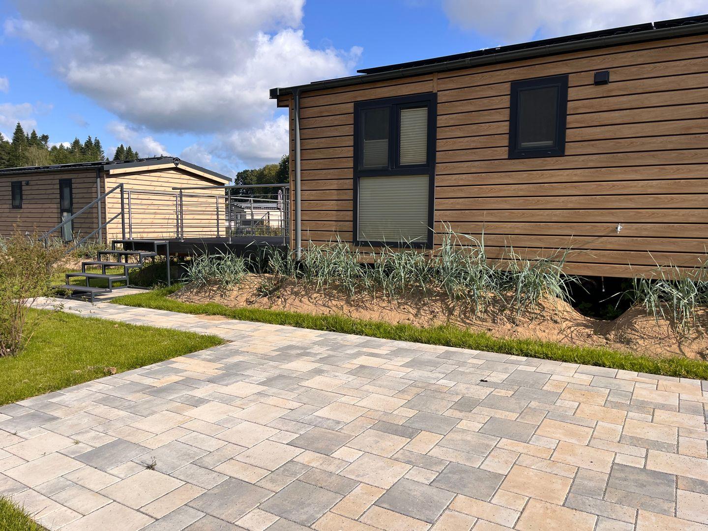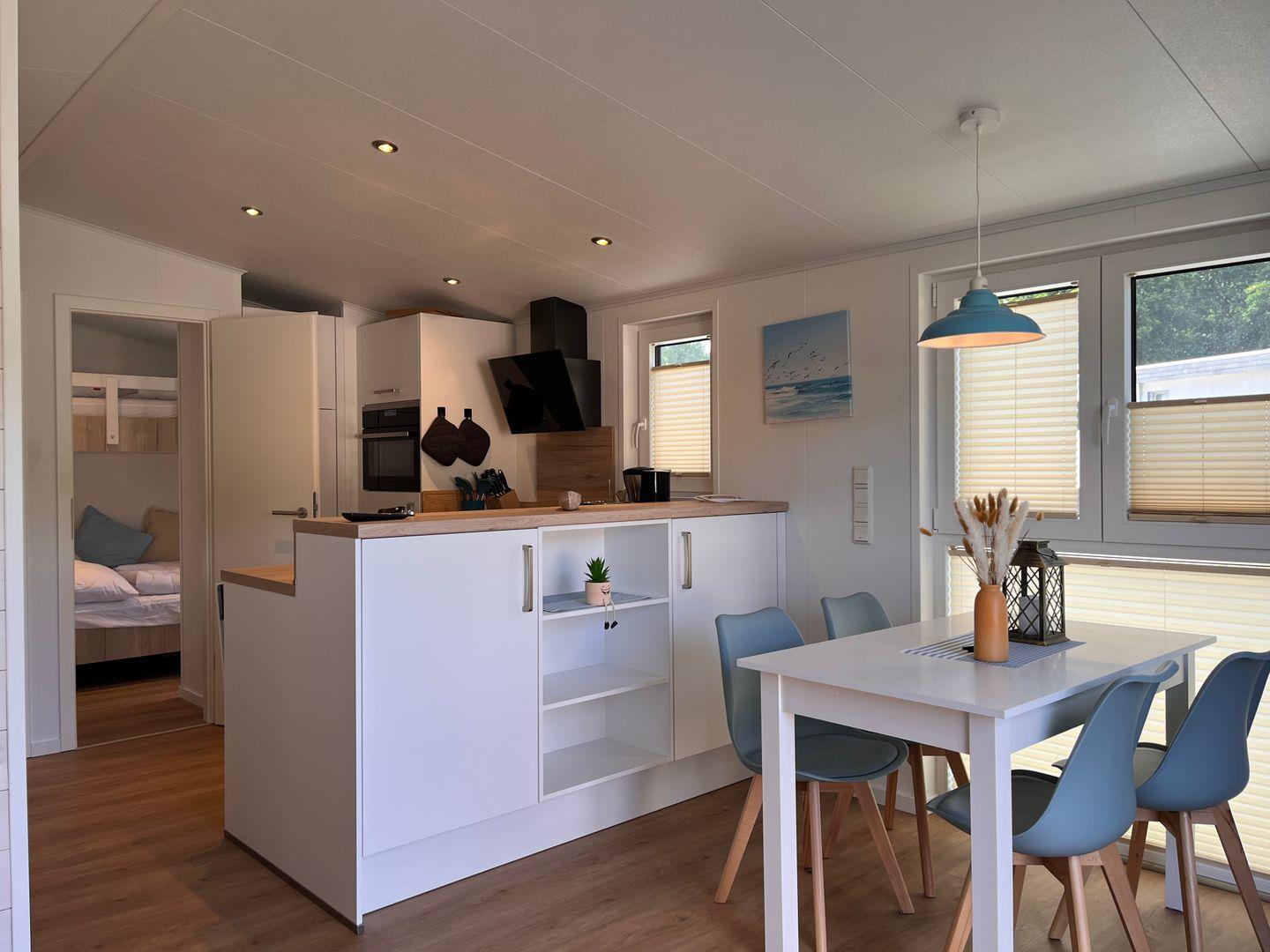 Das Ferienhaus verfügt über insgesamt drei Zimmer, darunter zwei Schlafzimmer mit Vinylbodenbelag, die für erholsamen Schlaf sorgen. Im Wohnzimmer mit ebenfalls vinylverlegtem Boden können Sie sich in einer gemütlichen Sofaecke entspannen. Die offene Küche ist zum Wohnzimmer hin gestaltet und komplett ausgestattet, unter anderem mit einem Ceran-Herd, Backofen, Geschirrspüler, Kühlschrank mit integriertem Gefrierfach, Kaffeemaschine, Wasserkocher, Toaster sowie einer Küchenmaschine. Essbereich und Esstisch sind ebenfalls vorhanden, sodass Mahlzeiten bequem eingenommen werden können.