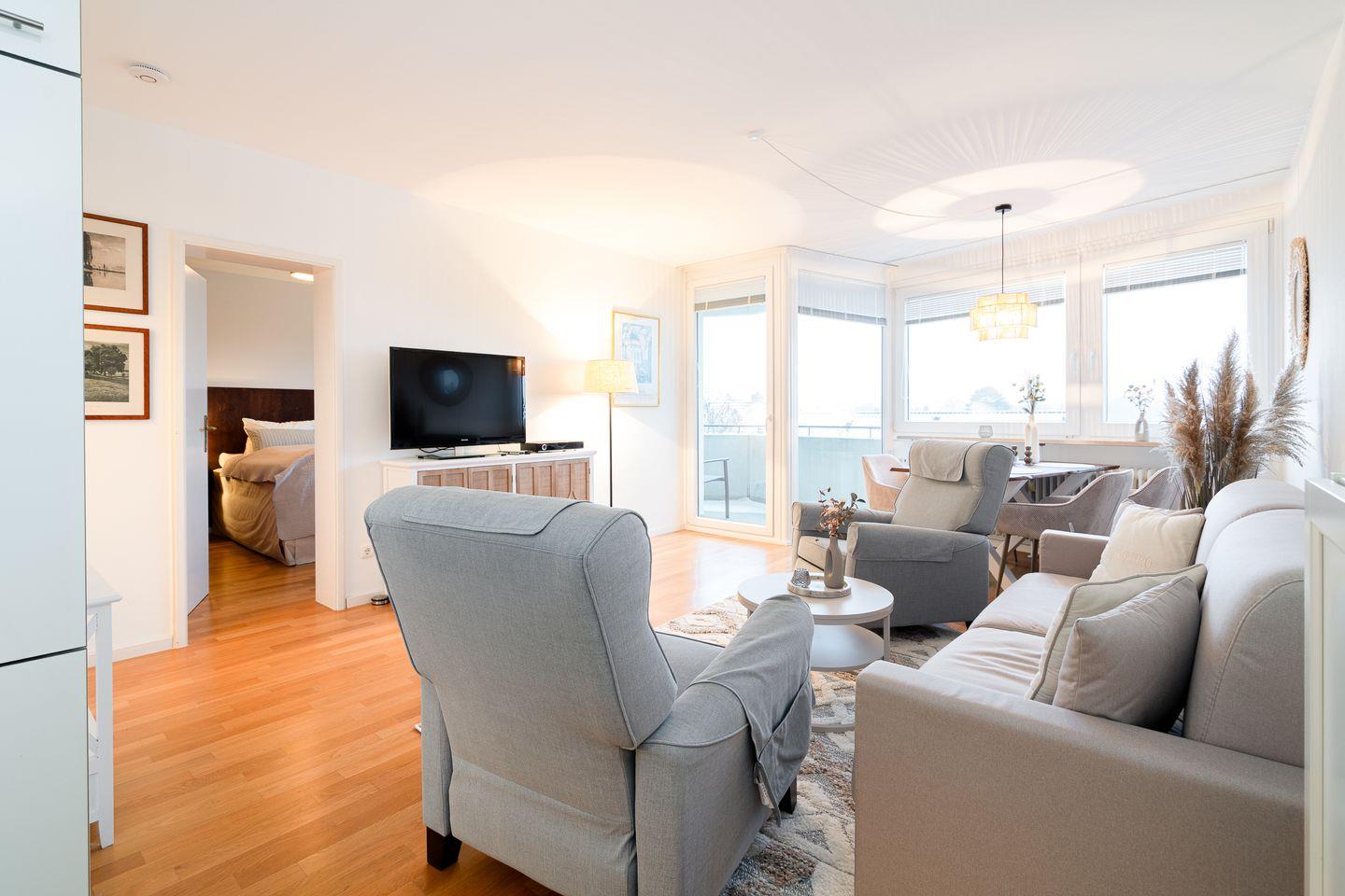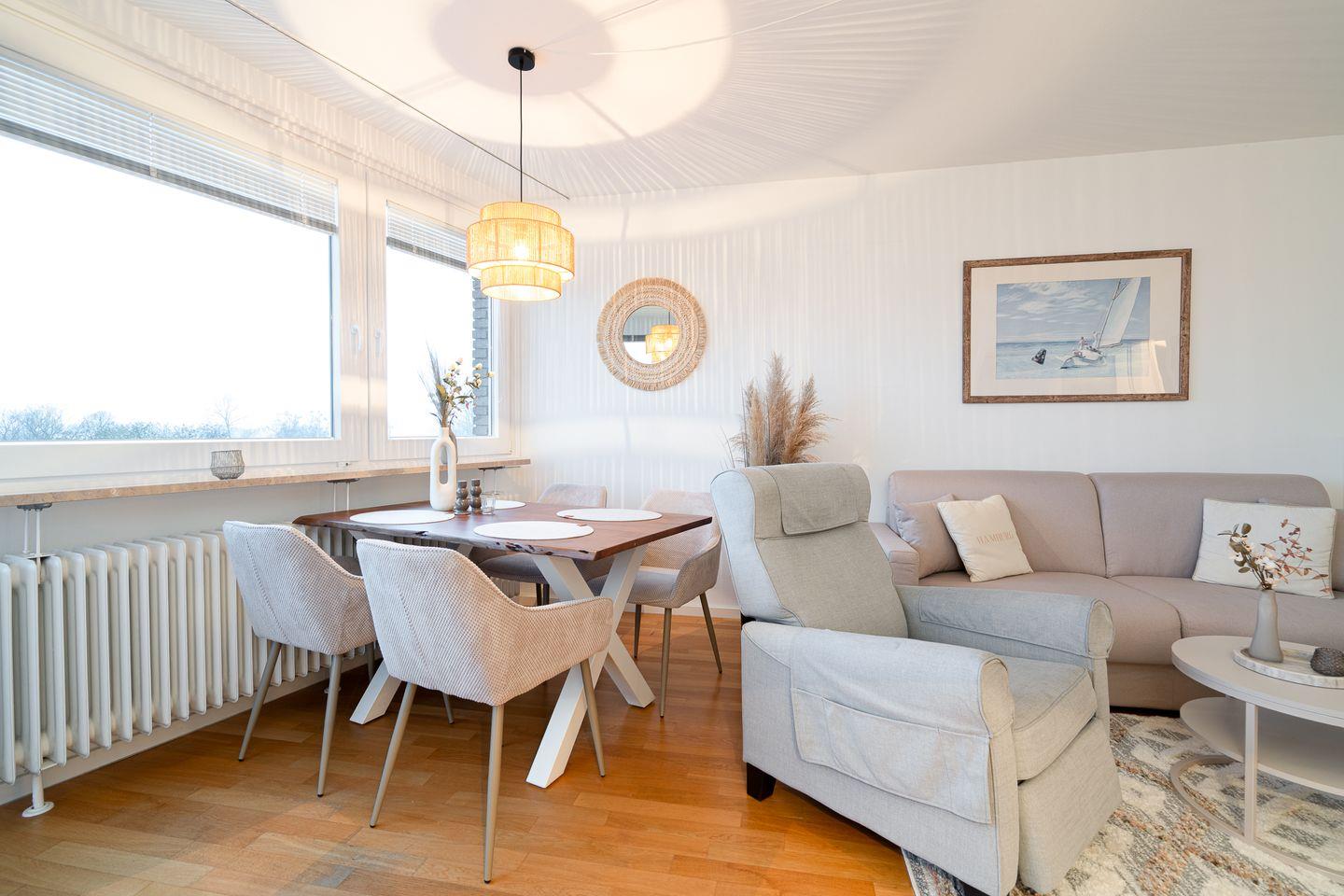 Das separate Schlafzimmer ist mit einem bequemen Doppelbett ausgestattet (2x 90 cm x 200 cm) und sorgt für erholsame Nächte. Im Wohnraum erwartet Sie eine komfortable Sofaecke mit TV, sowie ein moderner Essbereich mit Esstisch und Stühlen. Das Sofa mit Schlaffunktion bietet Platz zum Schlafen für zwei Personen. Alle Schlafräume verfügen über Sichtschutz an den Fenstern, sodass Verdunklung für erholsame Nächste gewährleistet ist.