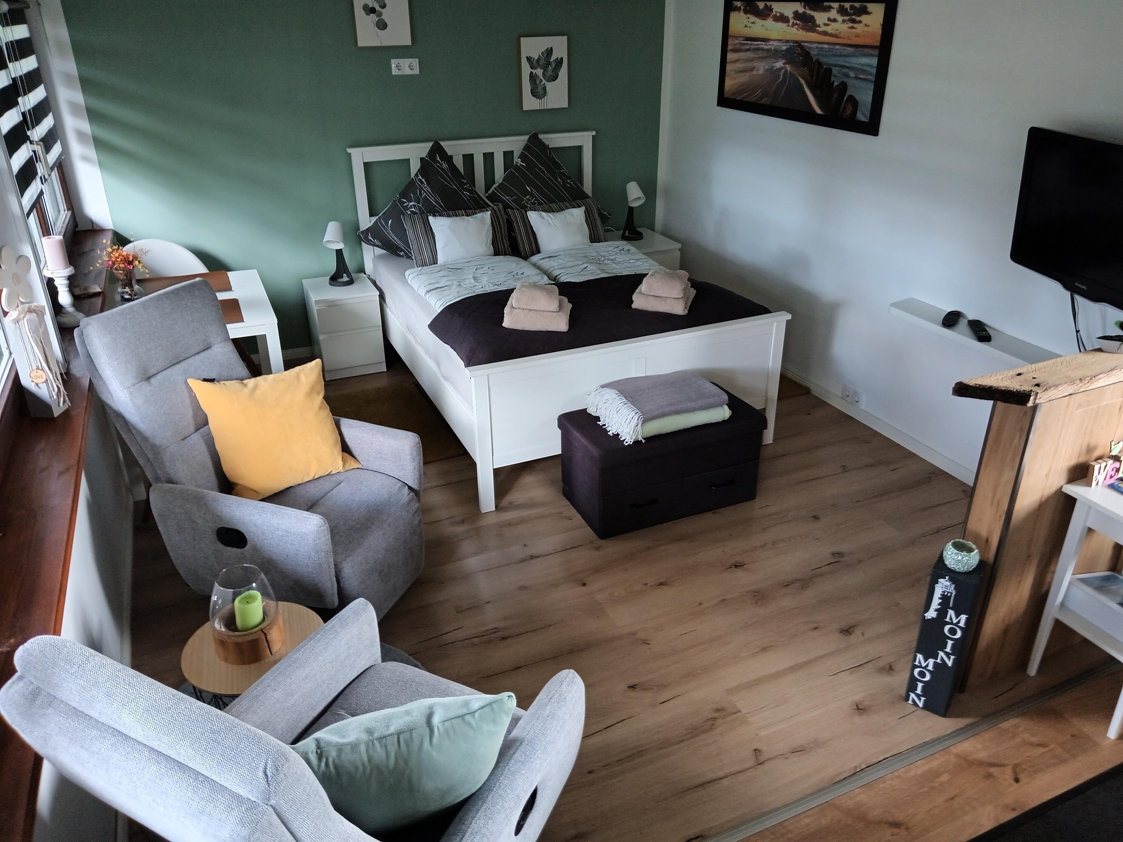 Die Ferienwohnung verfügt über einen kombinierten Wohn- und Schlafraum mit einem Doppelbett aus einem warmen Korbgeflecht. Die Couch ist ausziehbar, sodass hier ein weiterer Gast schlafen kann.