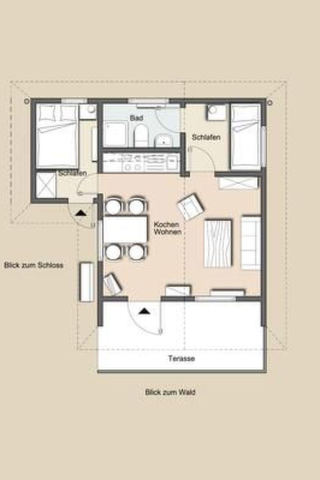 The house is 40 square metres in size and offers space for 2 people. It is divided into two bedrooms (the second bedroom is a connecting room to the bathroom), a living room with an integrated kitchen and a bathroom as well as a terrace with a view of Waldeck Castle. You can also see Lake Edersee through the trees of the national park. The living room, with a view of the lake and the castle, is accessed directly from the terrace. It is furnished with a dining table for up to four people. The antique living room cupboard has enough space for hanging laundry. A cosy sofa and an armchair are grouped around a small table. There is also a radio with CD player, various books, board games and other accessories. The TV has a satellite receiver and radio connection... . The kitchenette with 2-plate ceramic hob, oven, kettle, toaster, dishwasher and sink is fully equipped with cutlery, crockery and the necessary cooking utensils. The bedroom has a double bed with book shelf. There is plenty of space for laundry in the chest of drawers. The window, like all other windows, is fitted with shutters. There is direct access to the garden from the bedroom. The second bedroom is furnished with a 1.00 metre wide bed. The bathroom is equipped as standard with a washbasin, WC and shower with cubicle. The bathroom can be heated via underfloor heating. Overall, the house is characterised by its individual furnishings and cosy atmosphere throughout. The house is heated by a gas stove in the living room