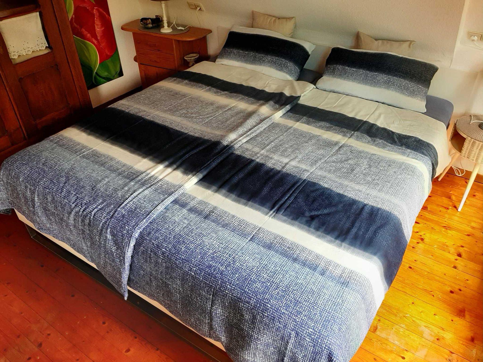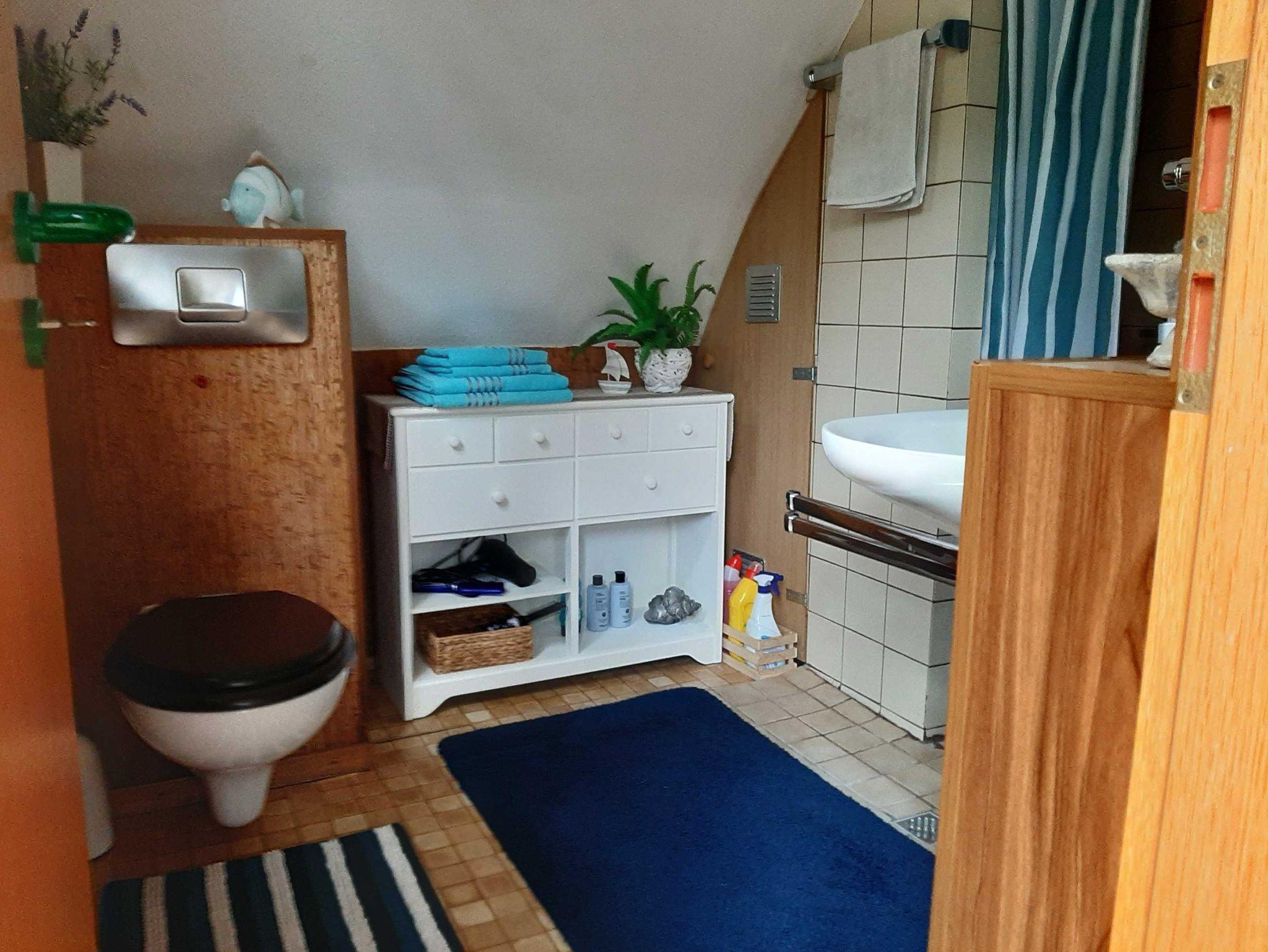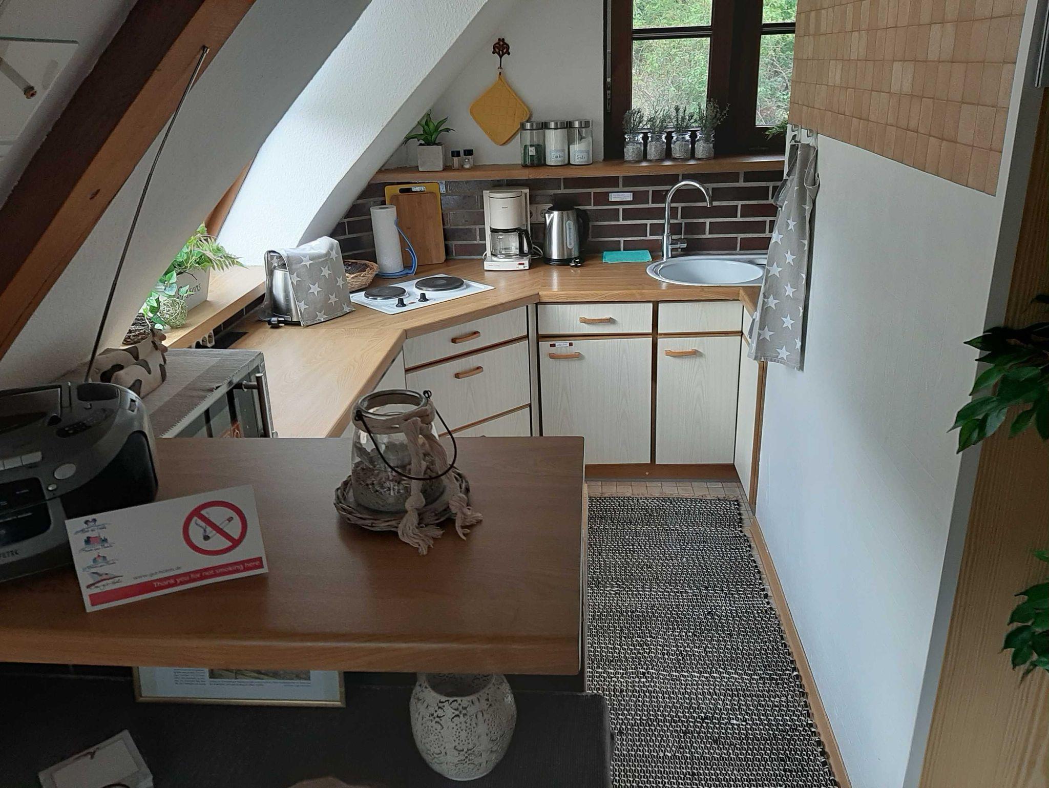 Das Studio verfügt über ein seperates Bad mit ebenerdiger Dusche. Der Wohn/- Schlafraum ist gemütlich eingerichtet und verfügt über ein Doppelbett mit Blick zum Teich, einer kleinen Sitz- und Essecke, sowie einer offenen Küche. Das Highlight ist der Balkon mit Blick in den parkähnlichen Garten. Dieser darf ebenfalls mit genutzt werden. Eine Grillmöglichkeit findet sich dort ebenfalls vor.