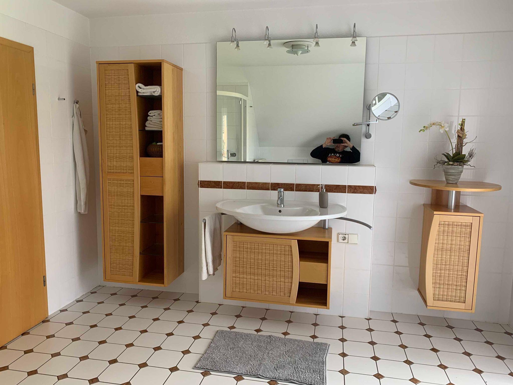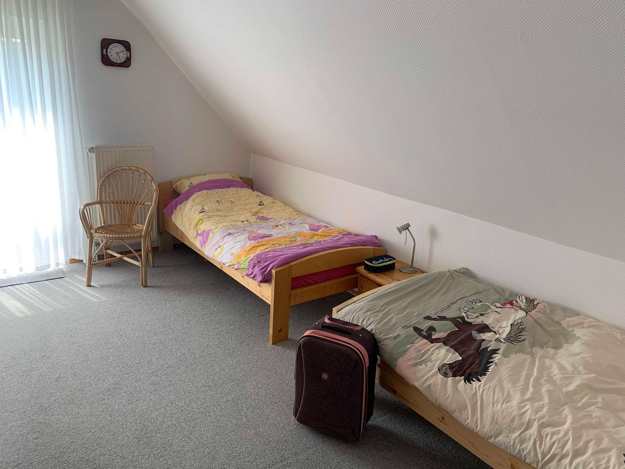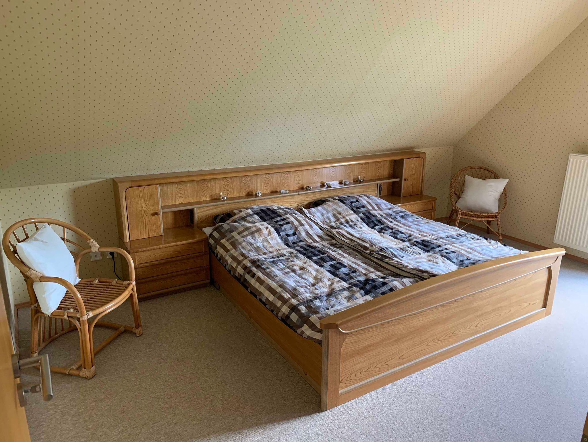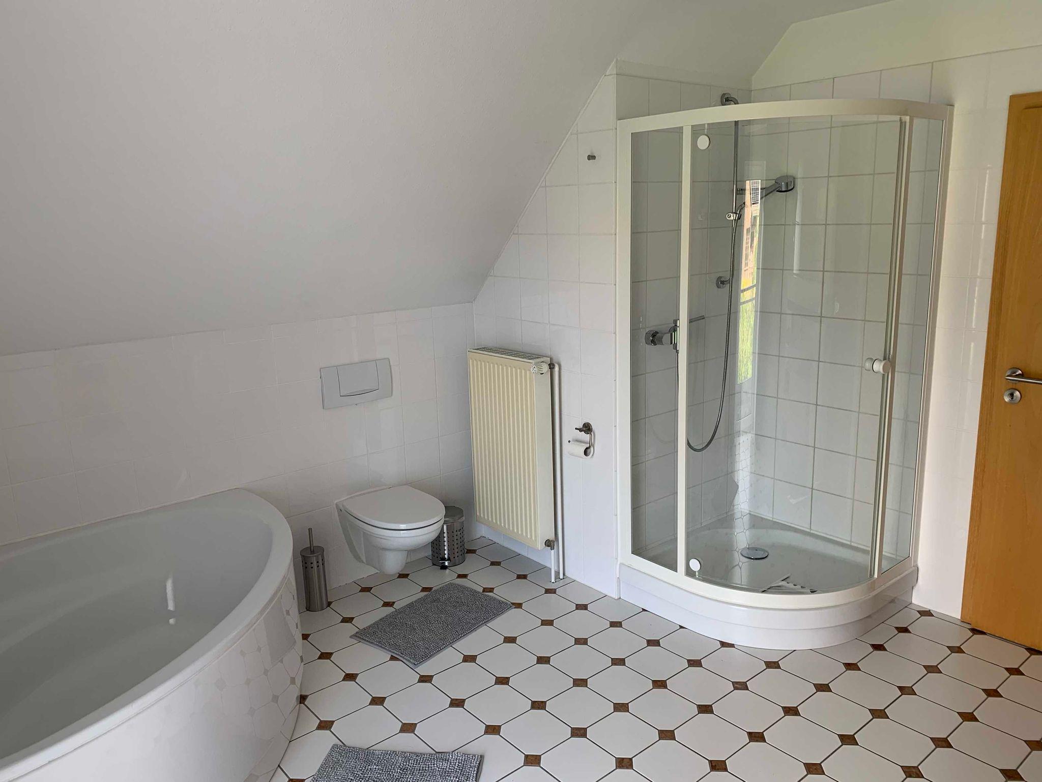 Das Haus bietet somit Platz für 6 Personen, wobei zwei Schlafzimmer mit Doppelbetten ausgestattet sind und eines mit zwei Einzelbetten. Beide Bäder verfügen über eine Dusche. Im Bad im OG gibt es eine riesige Eckbadewanne zur Entspannung.