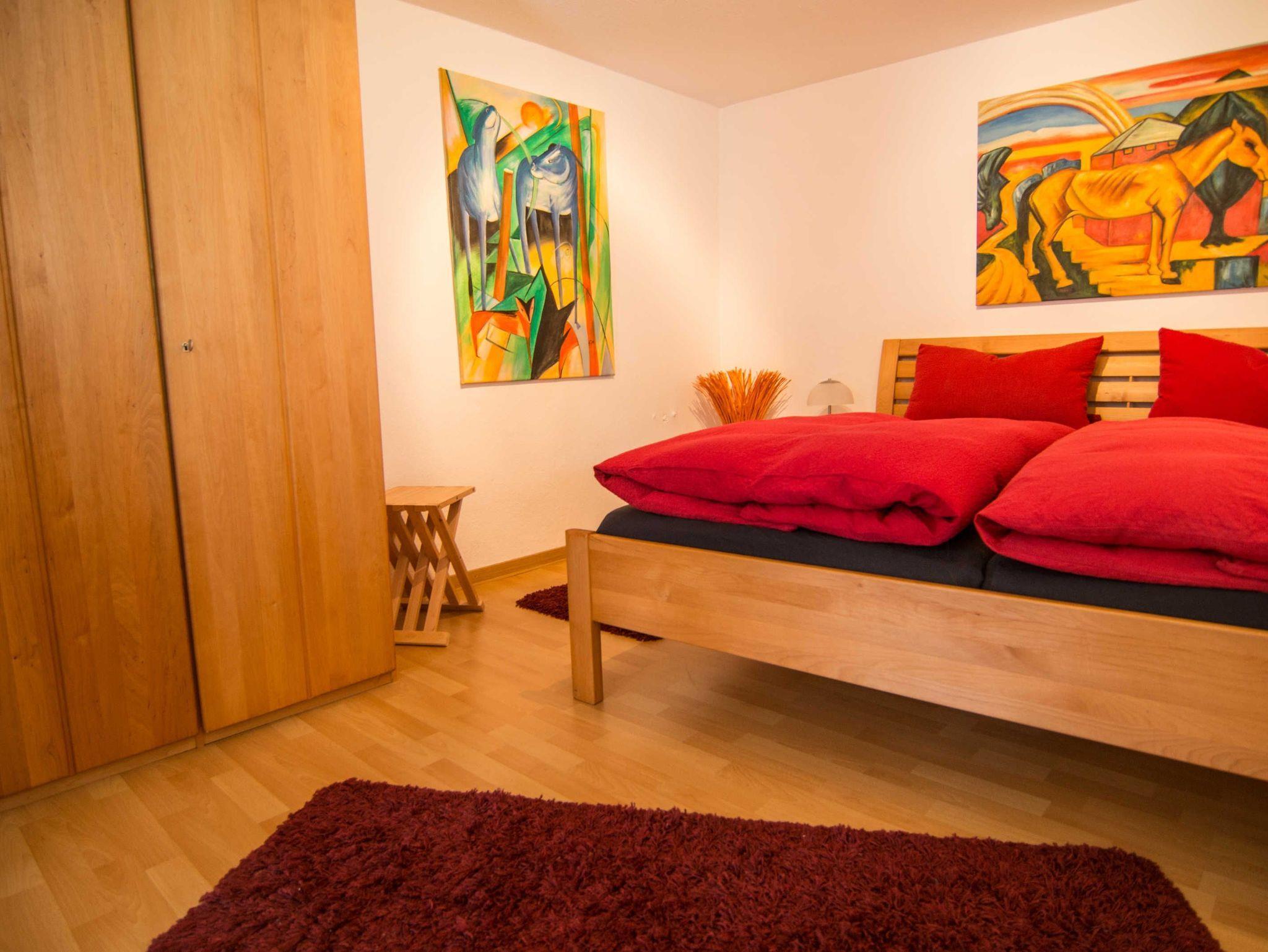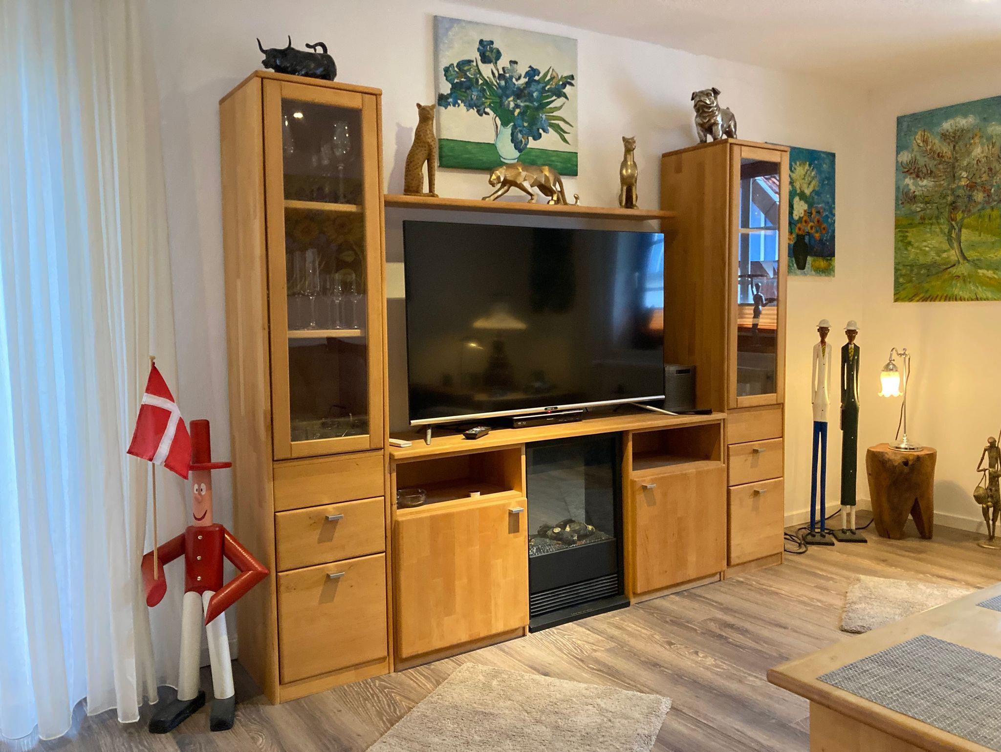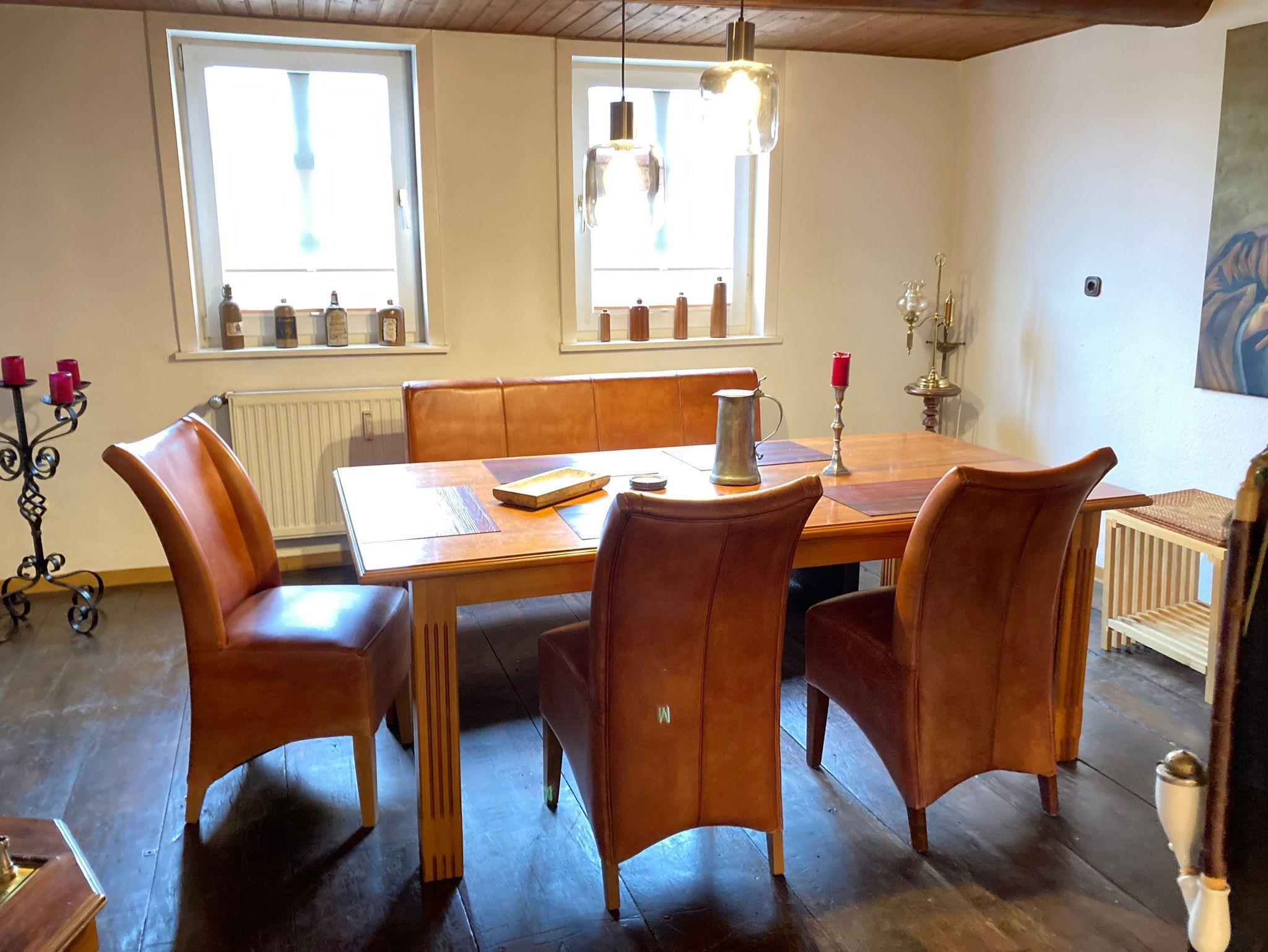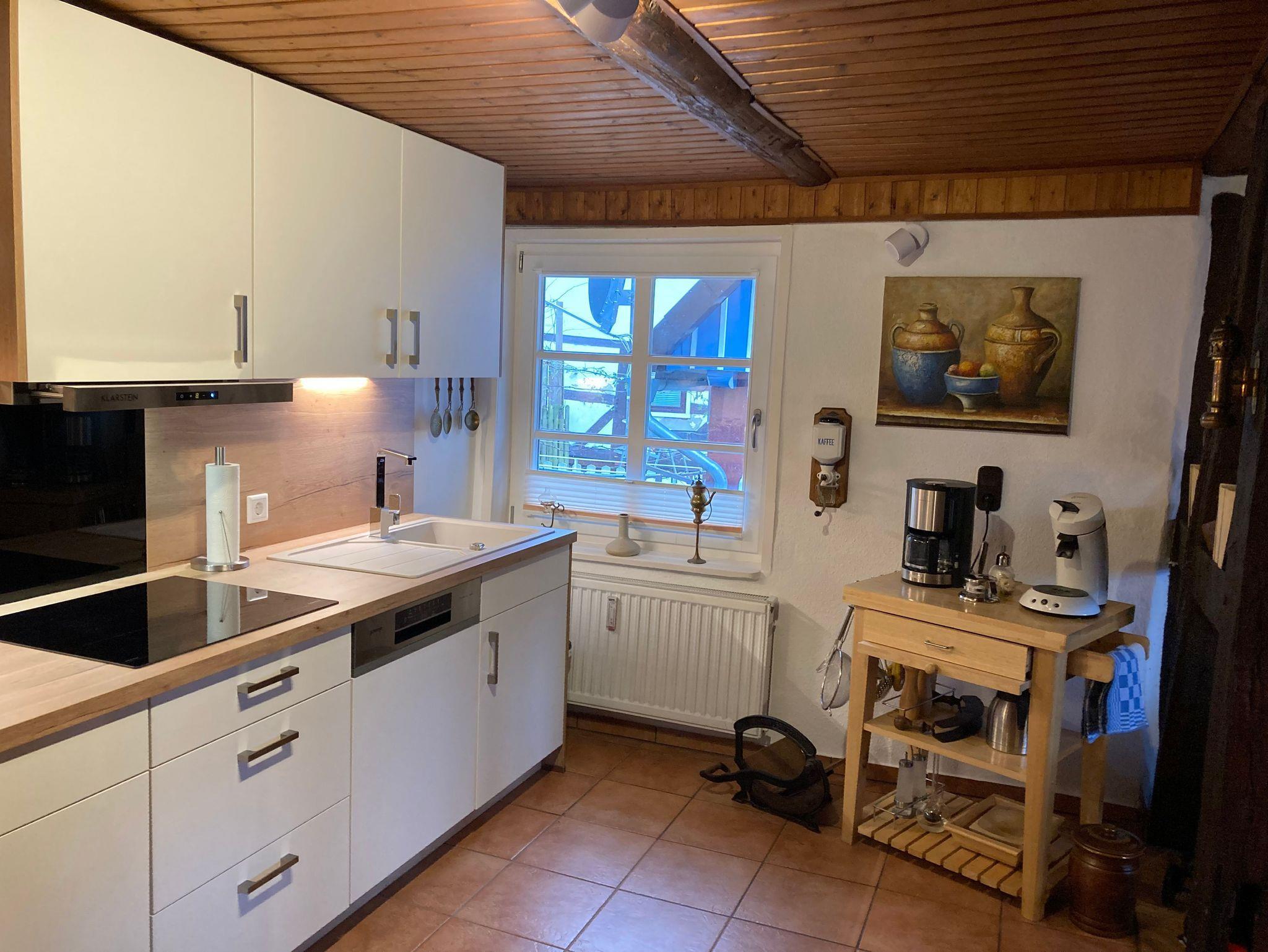 3-Zimmer-Wohnung 100 m² in der 1. Etage. Komfortabel und geschmackvoll eingerichtet: Wohnzimmer 25 m² mit Sat-TV (Flachbildschirm), CD und DVD. 2 Zimmer 16 m², jedes Zimmer mit 1 Doppelbett (180 cm, Länge 200 cm). Offene Küche 30 m² (Backofen, Geschirrspüler, 4 Glaskeramikherd Platten, Mikrowelle, elektrische Kaffeemaschine) mit Esstisch. Bad/Dusche/WC, Doppelwaschbecken. Balkon. Balkonmöbel, Gartengrill (mobil). Zur Verfügung: Waschmaschine, Wäschetrockner. Internet (Wireless LAN, gratis). Bitte beachten: Nichtraucher-Unterkunft. Maximal 1 Haustier/Hund erlaubt. Rauchmelder. Elektrokamin im Wohnzimmer. Zusätzliche Pad-Kaffeemaschine (Pads extra). Küche und Essbereich sind durch offenes Fachwerk optisch getrennt. Modern gestaltete Wohnung mit künstlerischem Ambiente.