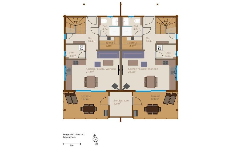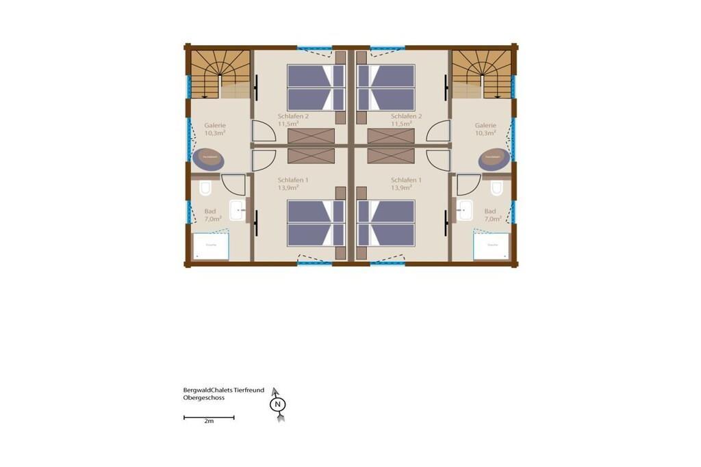 Våre to Bergwald Tierfreund (dyrevennlige) hytter tilbyr god plass til opptil fire personer og, om nødvendig, en hund. Fra gangen fører en bred massiv tretrapp til øverste etasje. I første etasje finner du stue/spisestue med peis, et romslig, fullt utstyrt L-formet kjøkken og et dusjrom med en integrert finsk tømmerhytte-badstue. Ovenpå er det to soverom med superkomfortable boksmadrass-senger, store skyvedørsgarderober, en smart-TV og lydplanke, et stort dusjrom med en stor Glade-dusj og et galleri med god plass, selv for din beste venn. Hver hytte har sin egen elektriske ladestasjon/Walbox