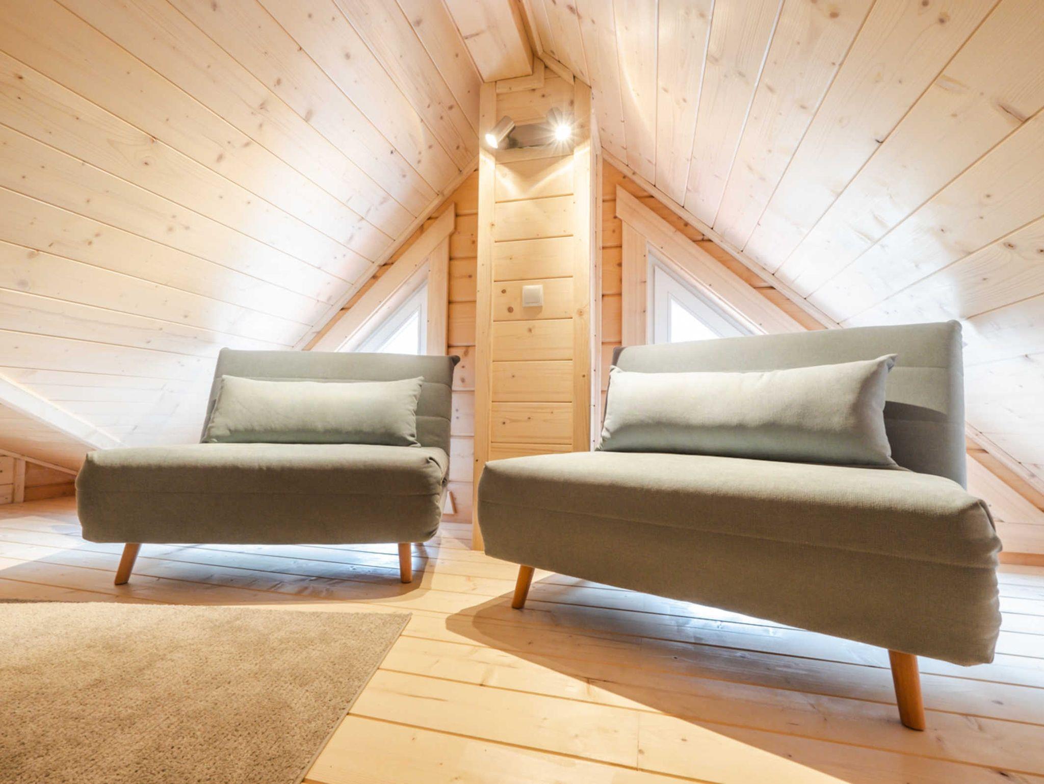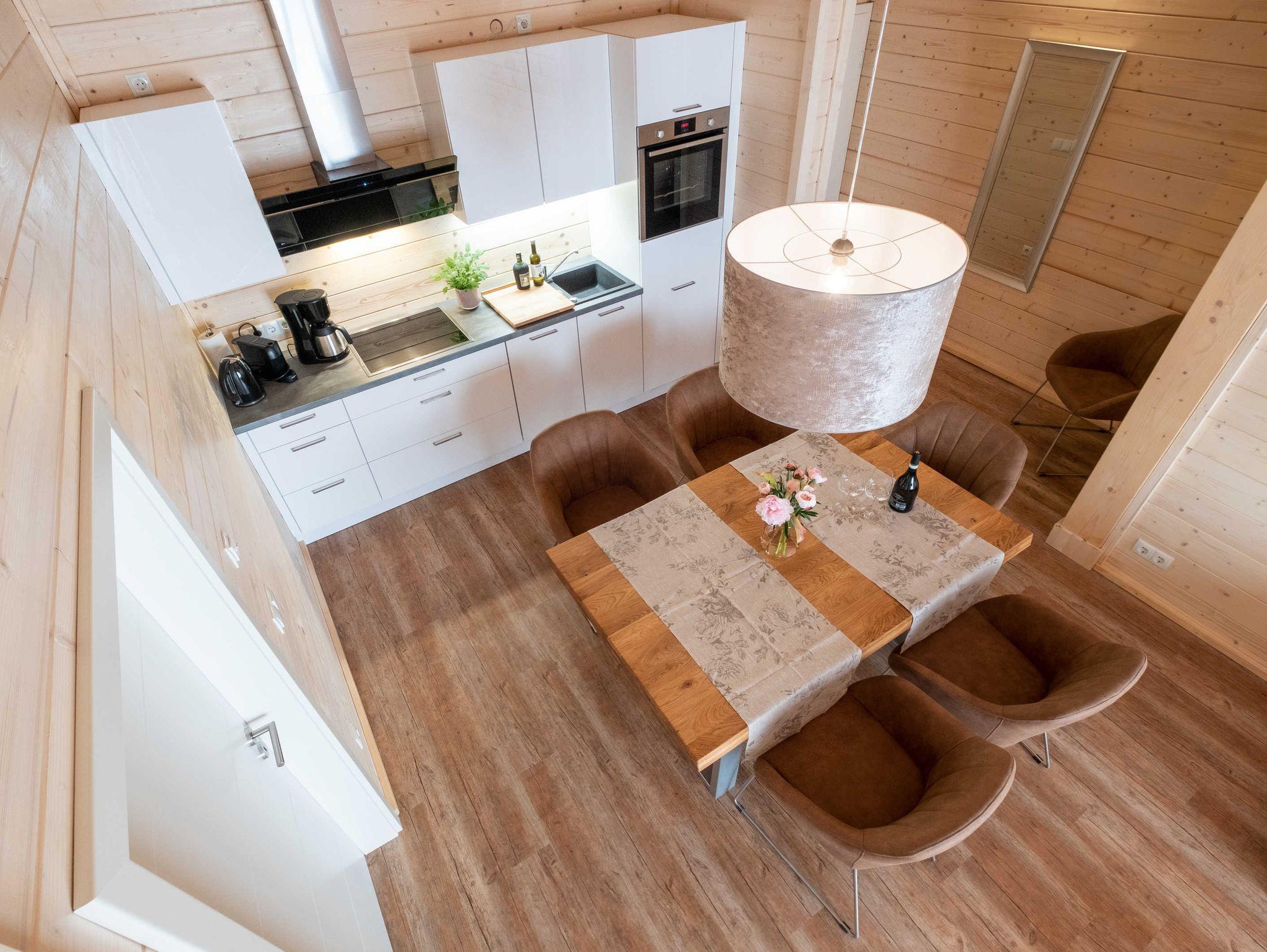 Hell und offen bis ins Dach präsentieren sich die 4 Suiten im Obergeschoss. Beim Betreten steigt der Holzduft in die Nase und vermittelt ein Gefühl von Wohnlichkeit. Das Ambiente ist im angesagten Stilmix gehalten. Alle Suiten verfügen über einen Wohn-/ Ess- /Schlafraum mit einer hochwertigen sehr gut ausgestatteten Lack-Einbauküche, ein Schlafzimmer mit Boxspringbett, geräumigem Schrank und einem Smart-TV sowie ein Badezimmer mit Glas- / Regendusche und Waschtisch. Die Fußbodenheizung in allen Räumen sorgt für wohlige Wärme. Über eine Stiege gelangen insbesondere die Kinder auf den geräumigen und gegen Absturz geschützten Spiel-/ und Schlafboden, denn dort befinden sich auch 2 Schlafgelegenheiten, entweder auf 1,40 m breite oder zwei mal 80 cm. Alle Suiten im Obergeschoss verfügen über einen großen Balkon, auf dem sich je nach Ausrichtung die Morgen-/ Mittags- oder Abendsonne genießen lässt. (Weitere Ausstattungsmerkmale weiter unten)