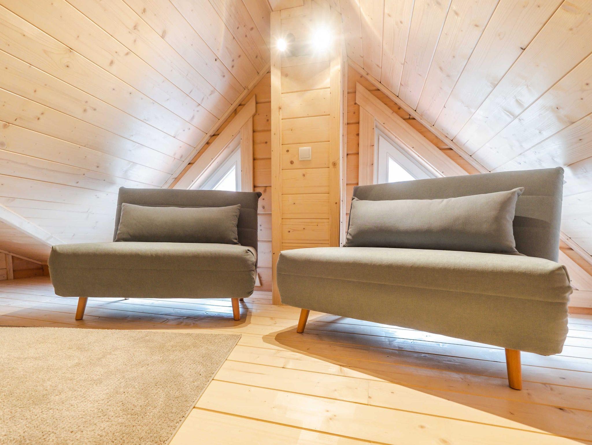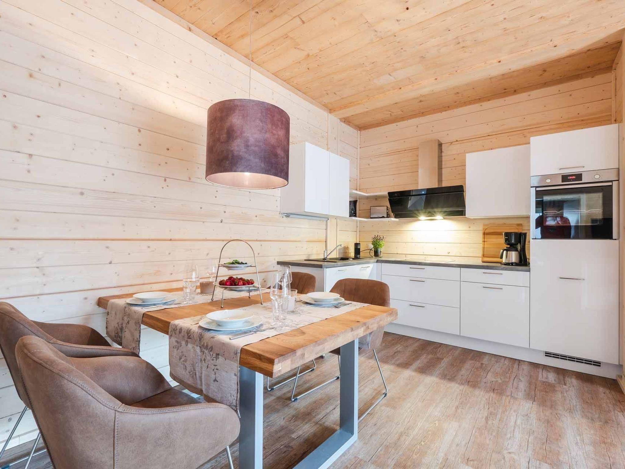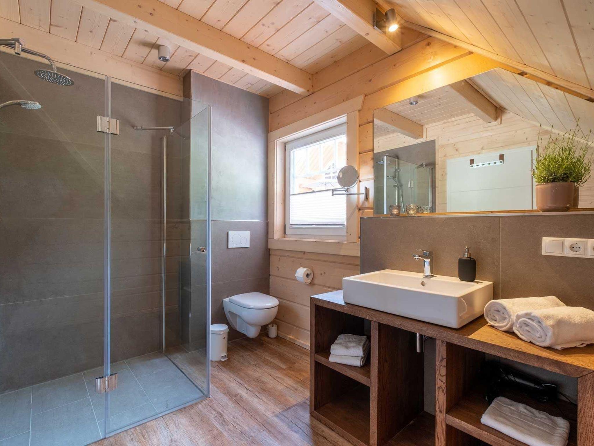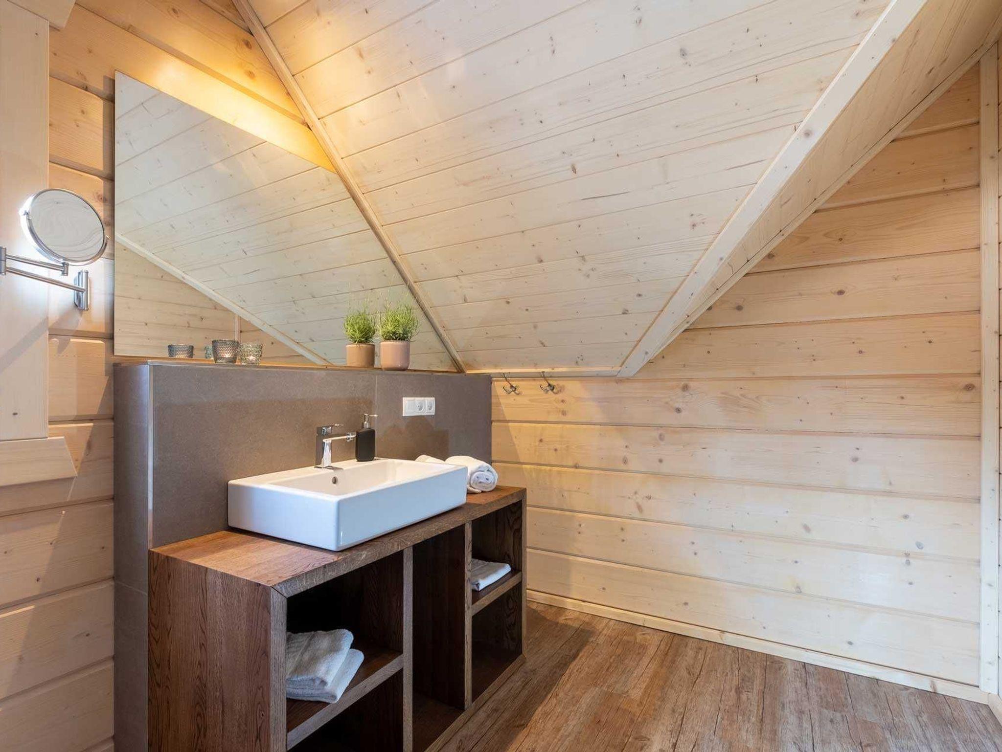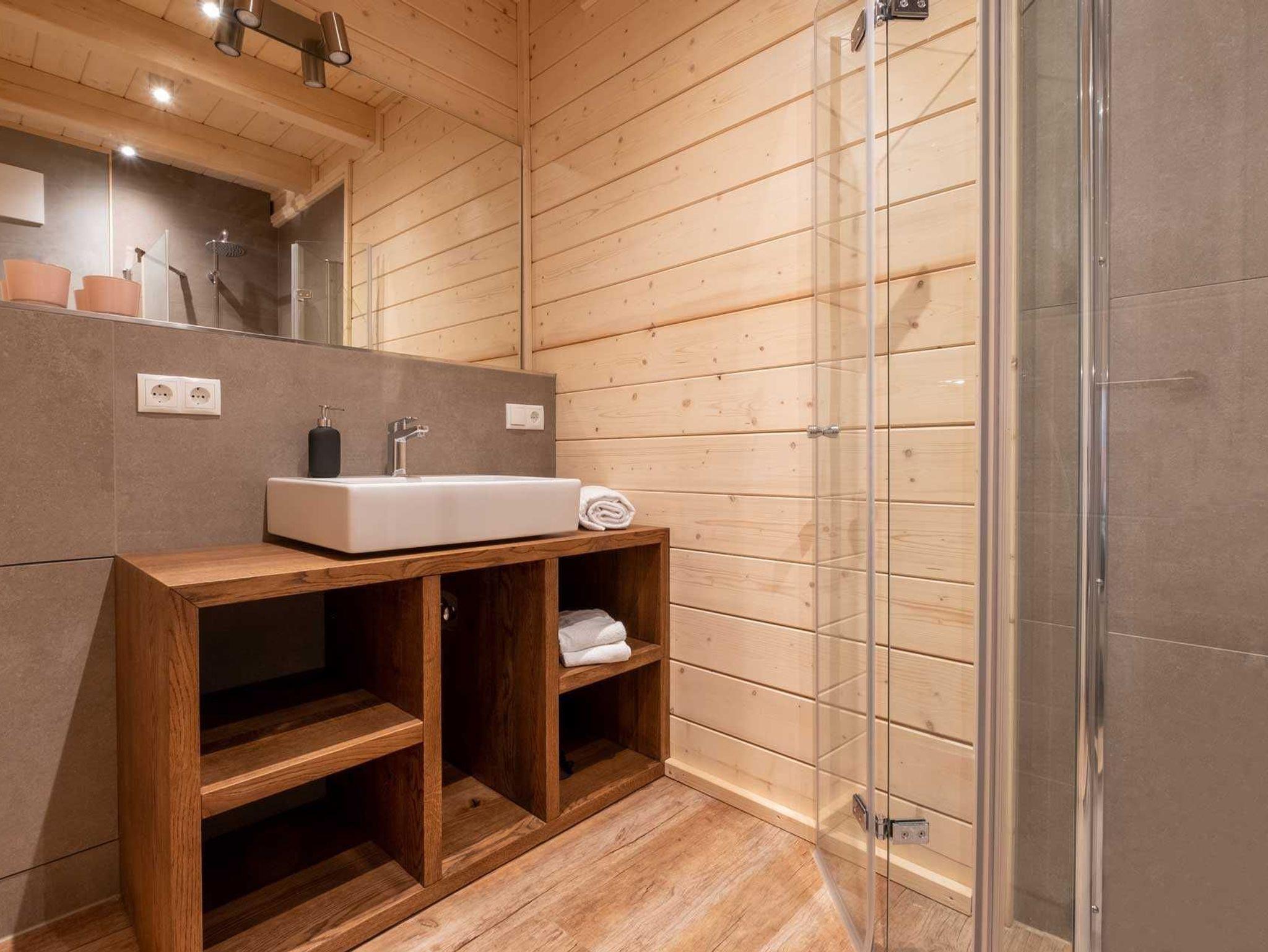 Hell und offen bis ins Dach präsentieren sich die 4 Suiten im Obergeschoss. Beim Betreten steigt der Holzduft in die Nase und vermittelt ein Gefühl von Wohnlichkeit. Das Ambiente ist im angesagten Stilmix gehalten. Alle Suiten verfügen über einen Wohn-/ Ess- /Schlafraum mit einer hochwertigen sehr gut ausgestatteten Lack-Einbauküche, ein Schlafzimmer mit Boxspringbett, geräumigem Schrank und einem Smart-TV sowie ein Badezimmer mit Glas- / Regendusche und Waschtisch. Die Fußbodenheizung in allen Räumen sorgt für wohlige Wärme. Über eine Stiege gelangen insbesondere die Kinder auf den geräumigen und gegen Absturz geschützten Spiel-/ und Schlafboden, denn dort befinden sich auch 2 Schlafgelegenheiten, entweder auf 1,40 m breite oder zwei mal 80 cm. Alle Suiten im Obergeschoss verfügen über einen großen Balkon, auf dem sich je nach Ausrichtung die Morgen-/ Mittags- oder Abendsonne genießen lässt. (Weitere Ausstattungsmerkmale weiter unten)