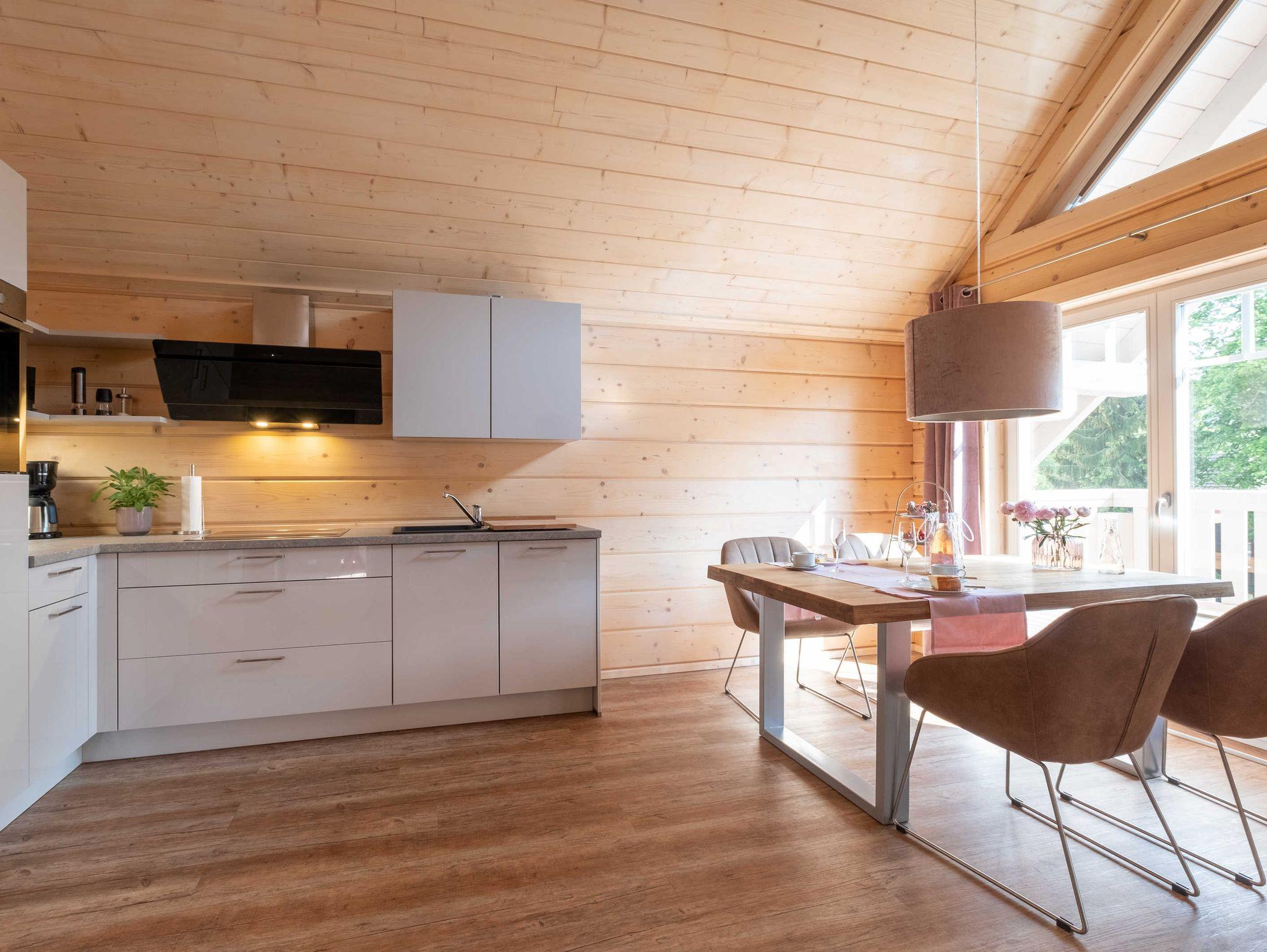 Hell und offen bis ins Dach präsentieren sich die 4 Suiten im Obergeschoss. Beim Betreten steigt der Holzduft in die Nase und vermittelt ein Gefühl von Wohnlichkeit. Das Ambiente ist im angesagten Stilmix gehalten. Alle Suiten verfügen über einen Wohn-/ Ess- /Schlafraum mit einer hochwertigen sehr gut ausgestatteten Lack-Einbauküche, ein Schlafzimmer mit Boxspringbett, geräumigem Schrank und einem Smart-TV sowie ein Badezimmer mit Glas- / Regendusche und Waschtisch. Die Fußbodenheizung in allen Räumen sorgt für wohlige Wärme. Über eine Stiege gelangen insbesondere die Kinder auf den geräumigen und gegen Absturz geschützten Spiel-/ und Schlafboden, denn dort befinden sich auch 2 Schlafgelegenheiten, entweder auf 1,40 m breite oder zwei mal 80 cm. Alle Suiten im Obergeschoss verfügen über einen großen Balkon, auf dem sich je nach Ausrichtung die Morgen-/ Mittags- oder Abendsonne genießen lässt. (Weitere Ausstattungsmerkmale weiter unten)