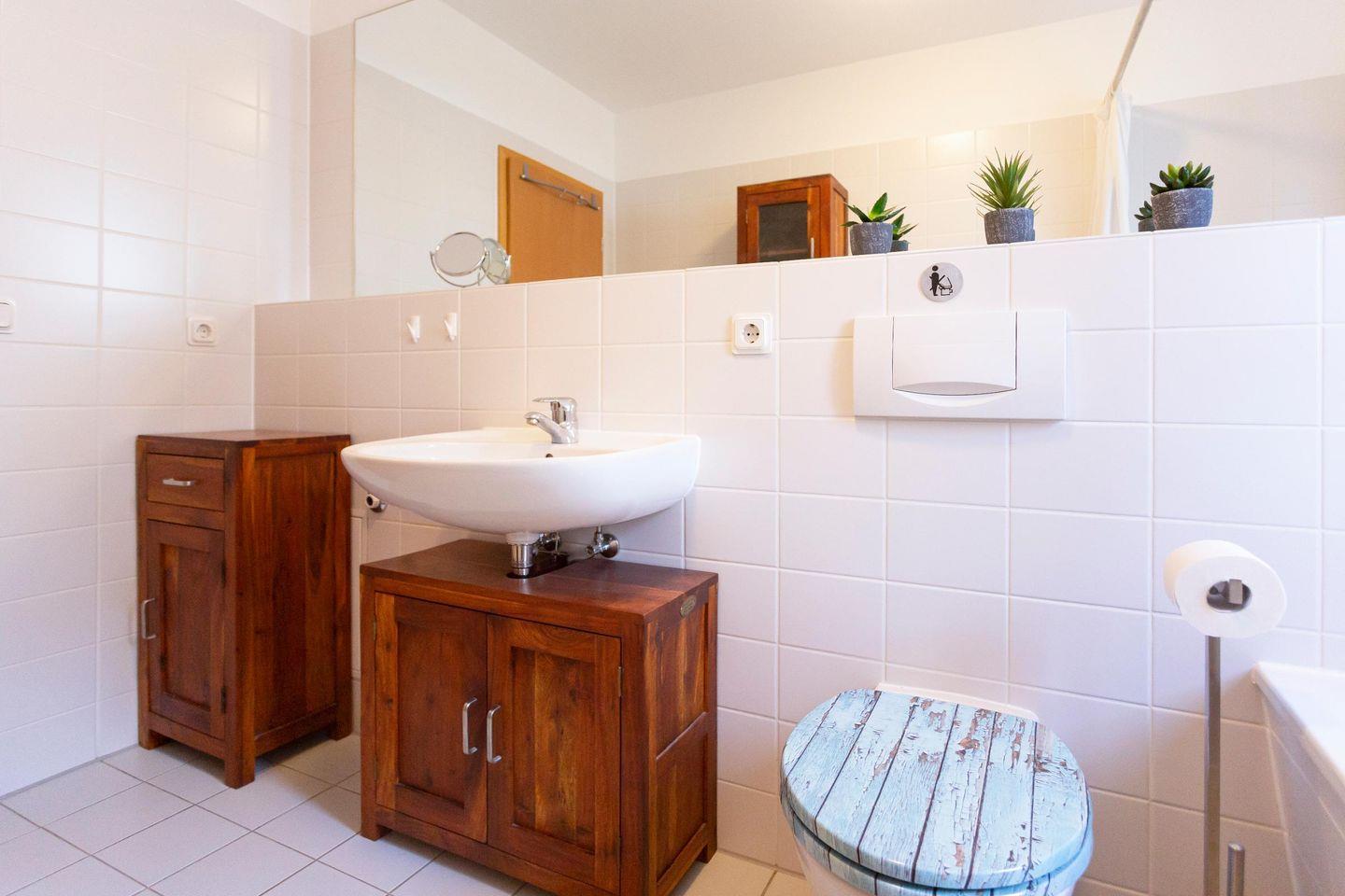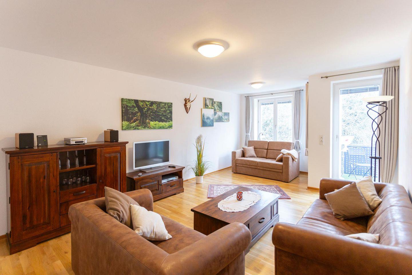 Der Wohnbereich mit gemütlichen Sofas und TV bietet viel Platz für gemeinsame Abende. Eine Couch ist ausziehbar und kann für zwei Personen aufgebettet werden. Vom Schlafzimmer und vom Wohnzimmer aus, können Sie direkt nach dem Aufstehen den Ausblick in die Natur vom Balkon aus genießen. Das Badezimmer ist mit einer Badewanne mit Duschvorhang ausgestattet.