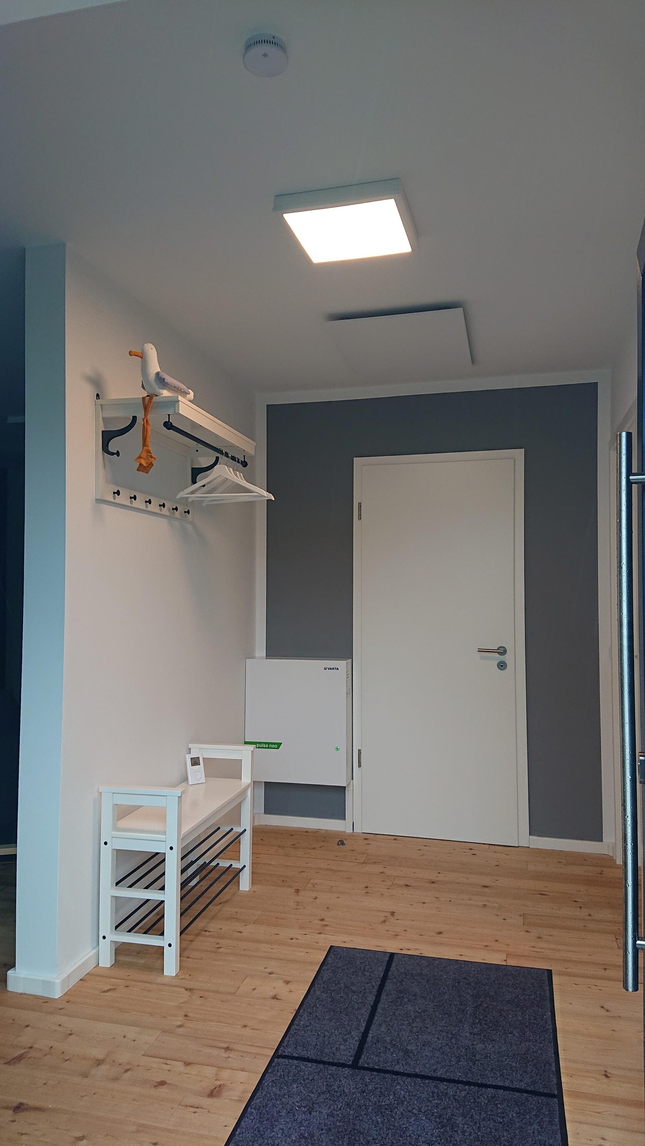 Das Haus wird mit Strom beheizt, der durch eine eigene Photovoltaik-Anlage auf dem Dach selbst gewonnen wird. Der überschüssige Strom wird in einem Hausakku gespeichert.