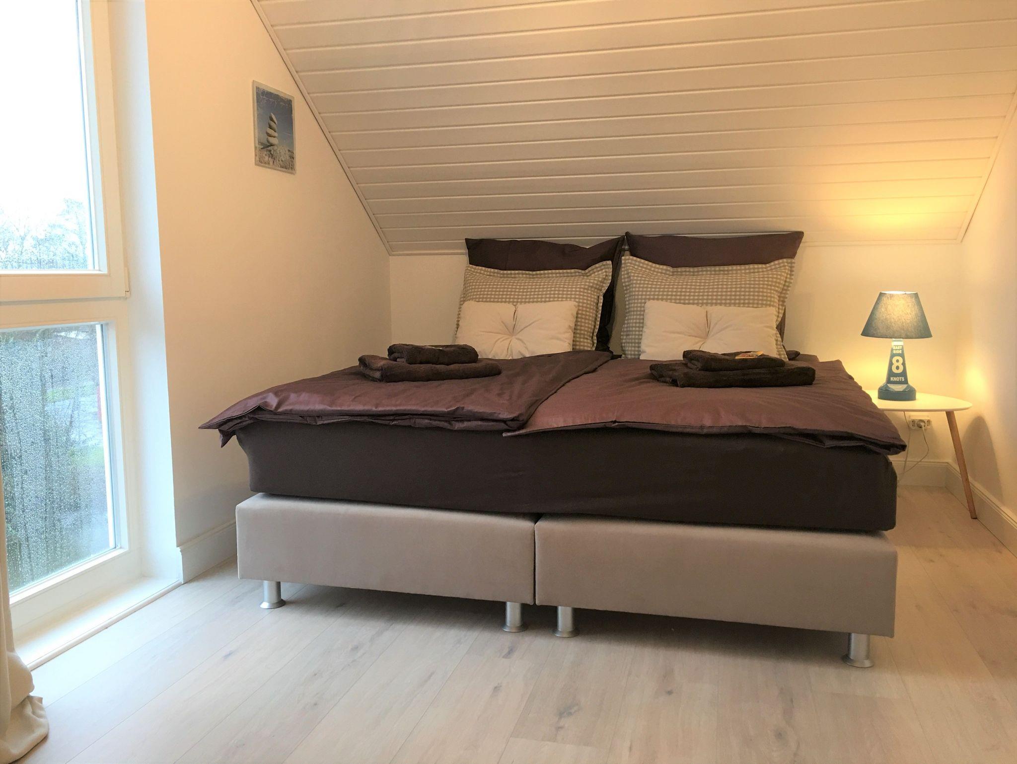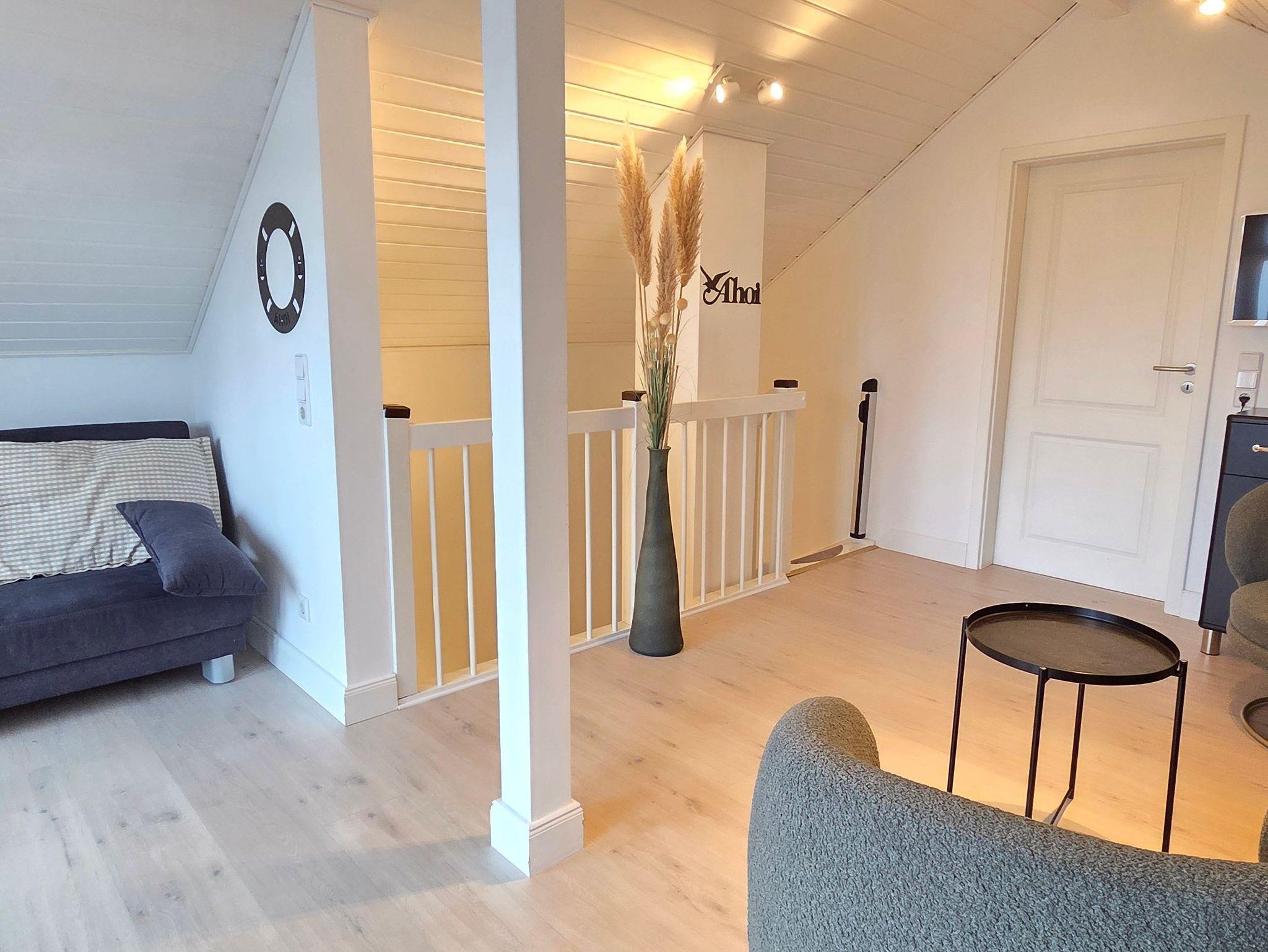 Die komfortable Ausstattung lässt keine Wünsche offen: drei Schlafzimmer mit Doppel-Boxspringbetten, zwei Schlafcouchs (120x200cm) im Wohnbereich und auf der Empore, ein Bad (mit Dusche, Dusch-Badewanne und Sauna), ein Gäste-WC sowie eine voll ausgestattete offene Küche. Neben gemütlichen Sitzgelegenheiten für 8 Personen ist auch ein Kamin vorhanden. Für Familien mit kleinen Kindern stehen Babybett, Hochstuhl, Treppenschutzgitter und gesicherte Steckdosen bereit.