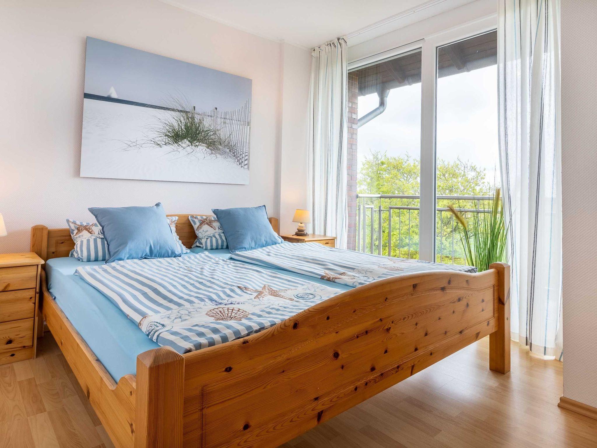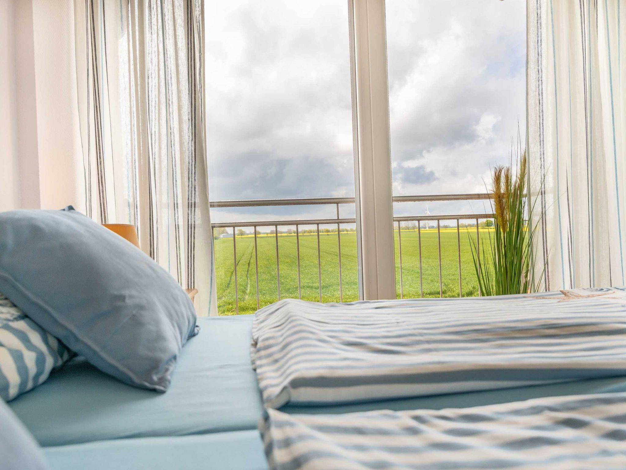 Die liebevolle eingerichtete Ferienwohnung Strand verfügt über zwei Schlafzimmer, eines mit Balkon und atemberaubendem Blick über die Felder, zwei Badezimmer, ein Wohnzimmer mit offener vollausgestatteter Küche und einem direkten Zugang auf die Terrasse und den Garten.