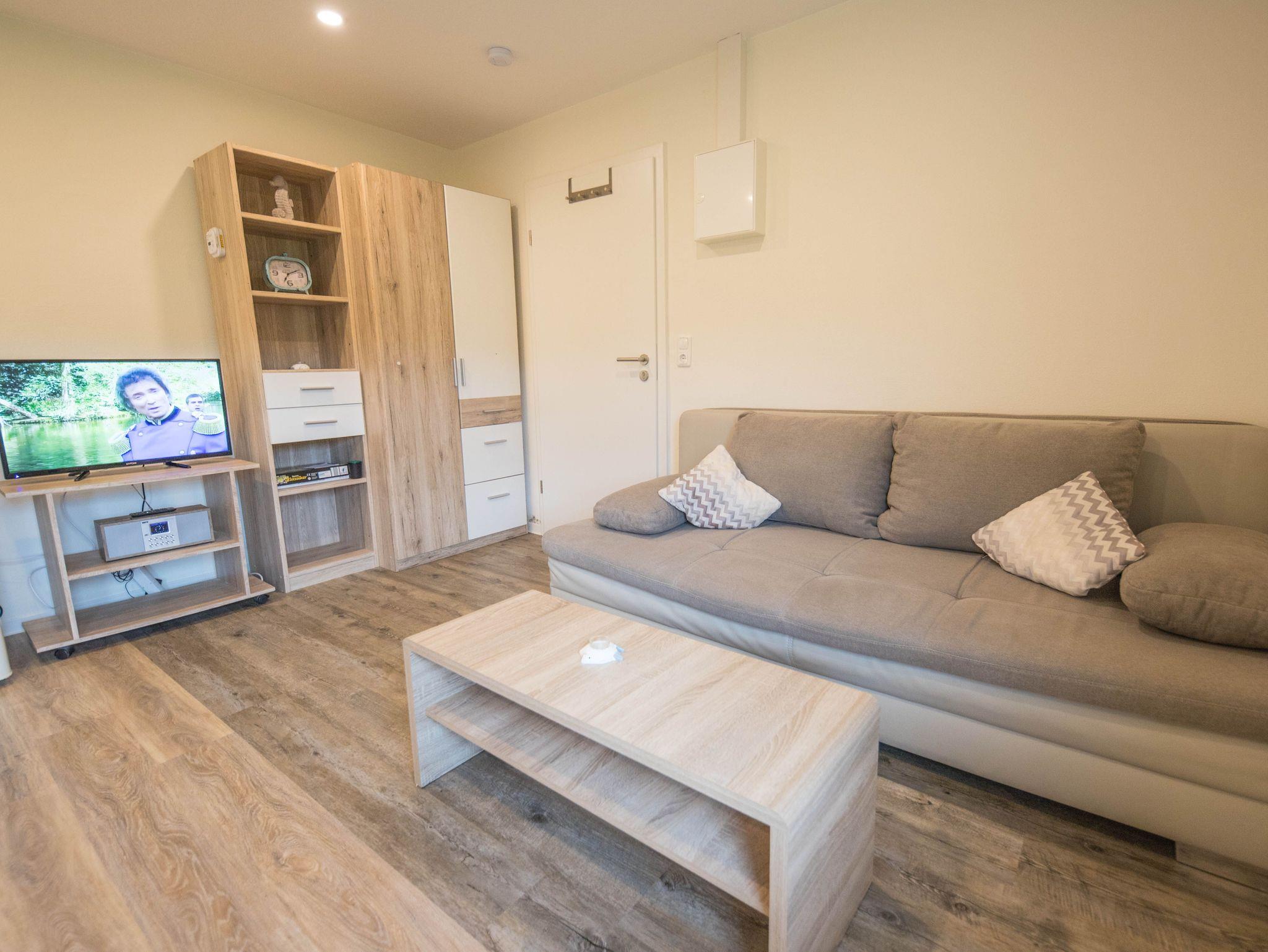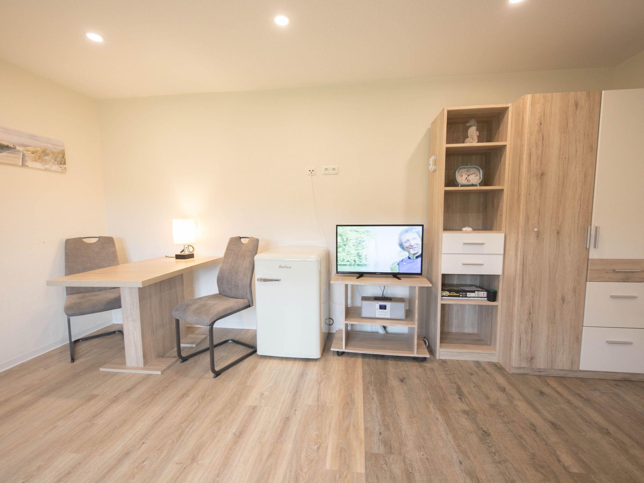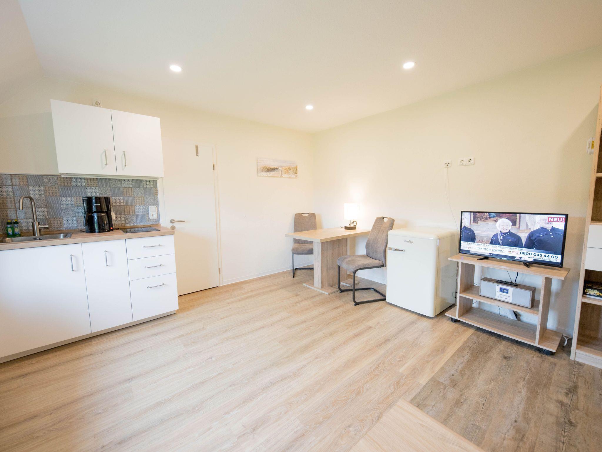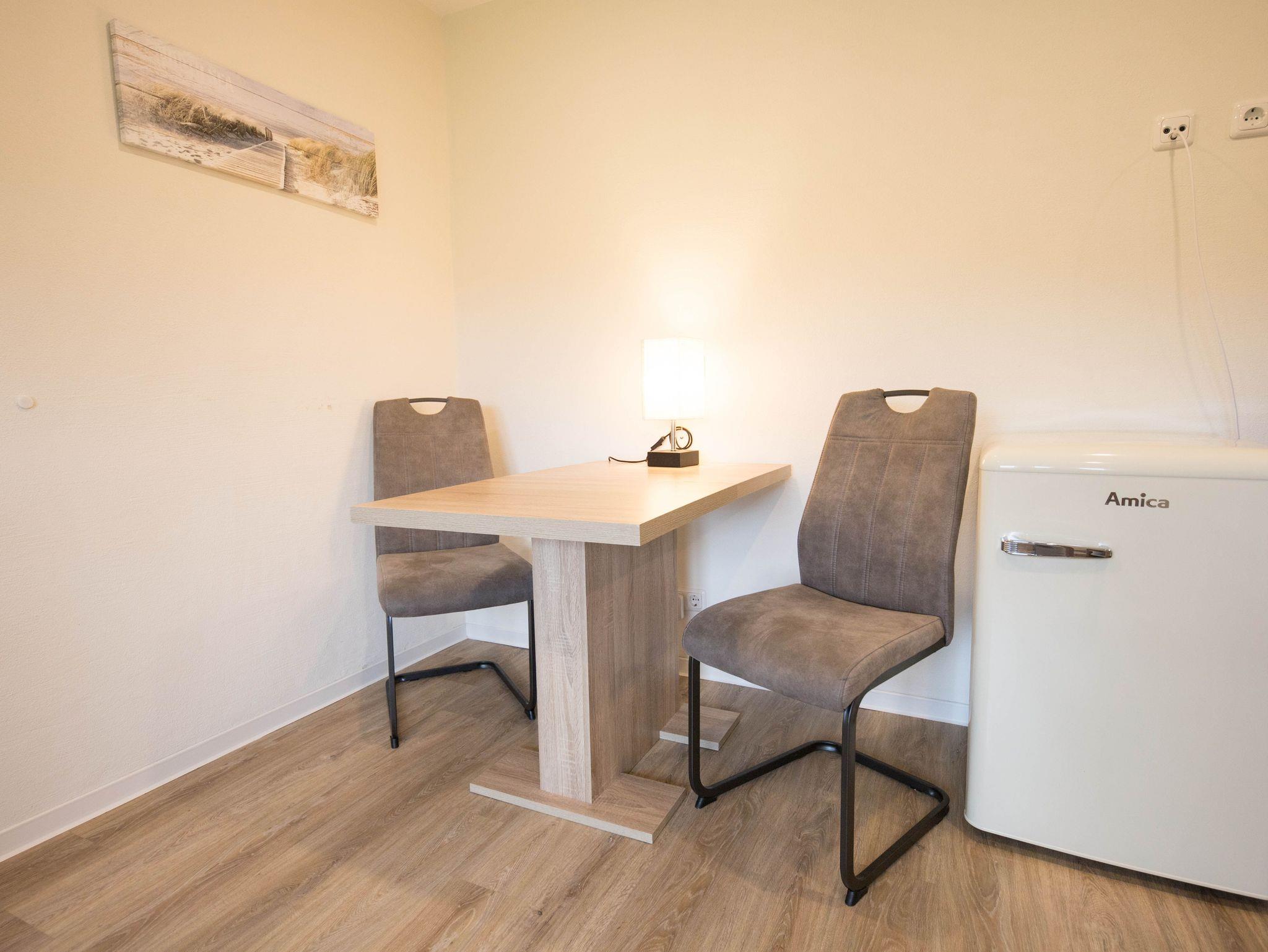 Das Appartement Juist ist ein Einraum-Appartment mit einem kombinierten Wohn-und Schlafraum mit Schlafsofa und Essplatz und einer integrierten offenen Pantryküche. Dem Zimmer schließt sich ein Tageslichtbad mit Dusche und WC an.
