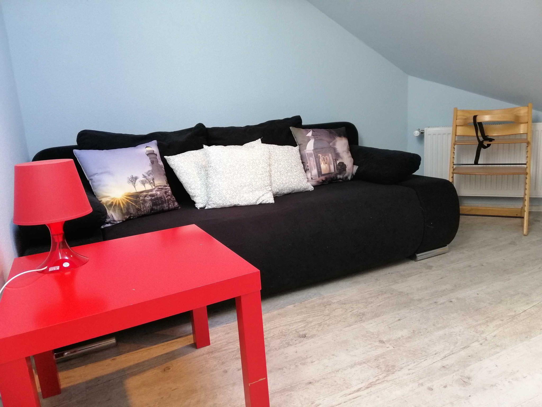 Die gemütliche Ferienwohnung verfügt über 68 m² Wohnfläche und bietet für vier bis fünf Personen ausreichend Platz für einen erholsamen Urlaub. Die separate Küche mit Essplatz ist mit einem Backofen und einem Kochfeld mit vier Herdplatten, einer Geschirrspülmaschine, einem Kühlschrank, einem Gefrierschrank, Mikrowelle, Kaffeemaschine, Wasserkocher, Toaster und Waschmaschine ausgestattet. Das Wohnzimmer verfügt über ein gemütliches Sofa sowie einen Fernseher mit Satellitenempfang. Der Essplatz ist im Wohnzimmer integriert. Dem Wohnzimmer schließt sich ein Schlafzimmer mit Doppelbett an. Über eine Raumspartreppe gelangen Sie in den oberen Stock. Hier finden Sie ein Schlafzimmer (Galerie) mit Doppelbett und ein Kinderzimmer mit Schlafsofa. Die Zimmer sind durch Außenrollos abdunkelbar. Der Wohnung schließt sich ein kleines Stück Garten mit Strandkorb an. Zum Strand sind es nur wenige Gehminuten. Ein Parkplatz ist direkt am Haus.