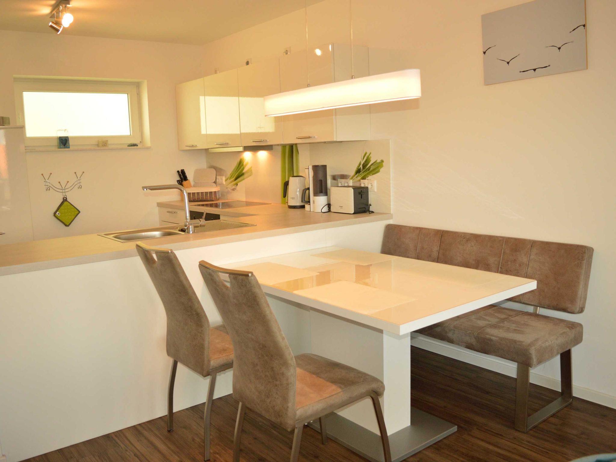 Der helle Wohnraum mit Schlafsofa, TV mit DVBT, WLAN und zwei Clubsesseln verfügt über große Panoramafenster mit Blick aufs Meer und einem direkten Zugang zum Balkon mit Gartenmöbeln, wo Sie die frische Nordseeluft einatmen können. Die moderne Küche ist offen im Wohnraum integriert und bietet neben einem Essplatz für 4 Personen einen Backofen, Geschirrspüler, Kühlschrank mit Tiefkühlfach, Wasserkocher, Kaffeemaschine und Toaster. Dem Wohnraum schließen sich das Schlafzimmer mit Doppelbett sowie das großzügige Tageslicht-Badezimmer mit Badewanne und WC sowie einem Fön an.