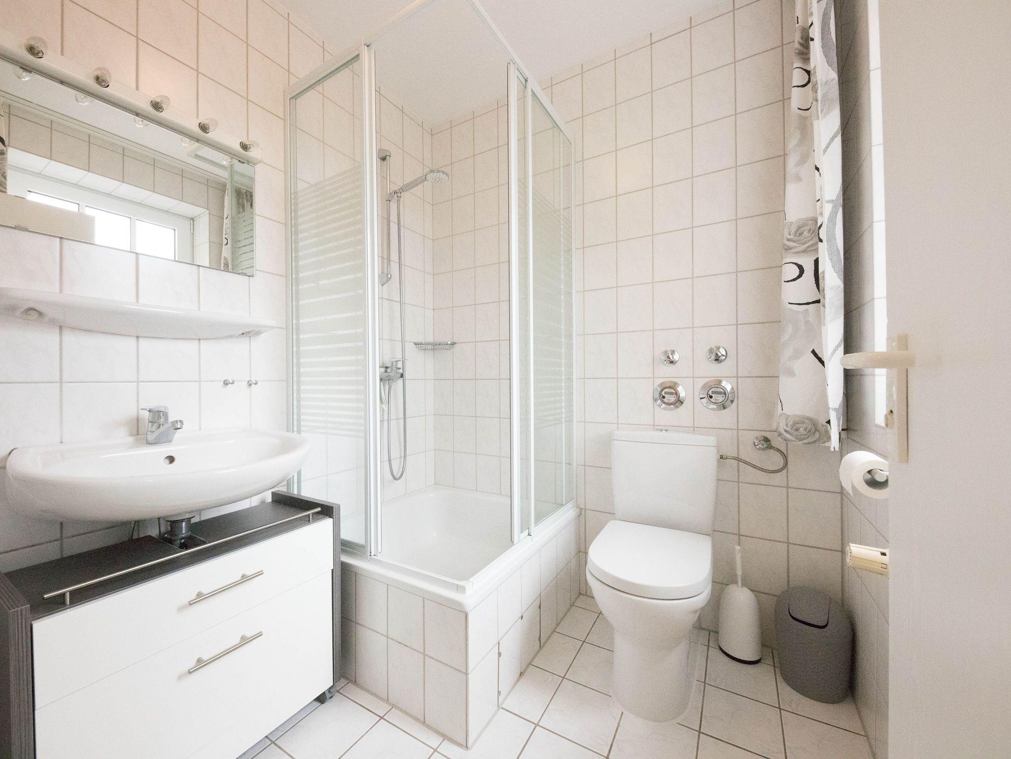 Das Tageslichtbadezimmer mit Dusche und WC befindet sich ebenfalls im unteren Bereich der Maisonettewohnung.