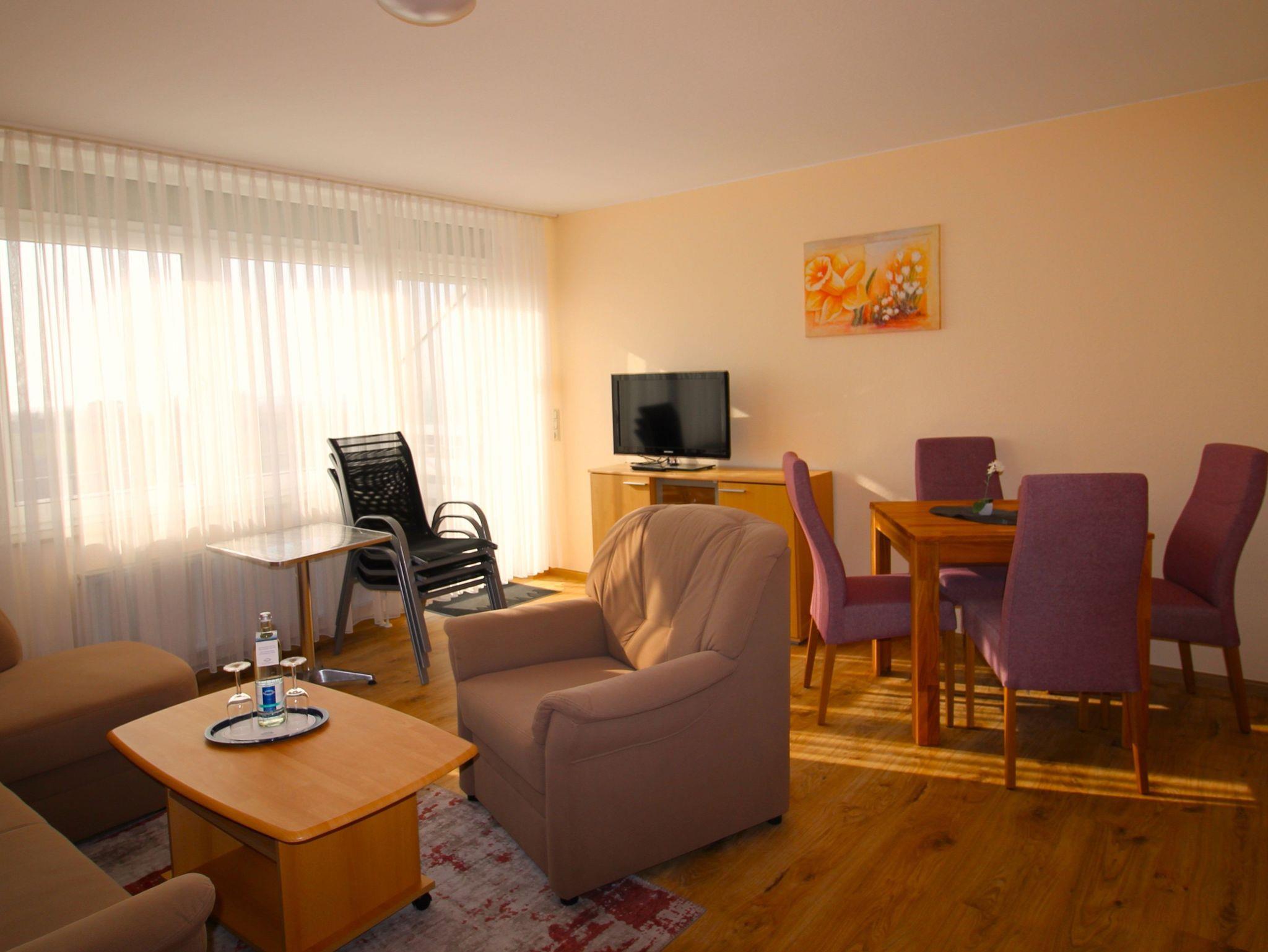 Die Ferienwohnung Typ Seepferdchen IV (3te Etage) verfügt über einen Balkon zur Seeseite und Nordseeblick. Die Wohnung teilt sich in ein Wohnzimmer mit gemütlicher Couch, TV, einer offenen Küche, sowie einem Schlafzimmer mit Doppelbett und einem Bad mit Dusche/WC auf. Hier sind Haustiere nicht erlaubt.