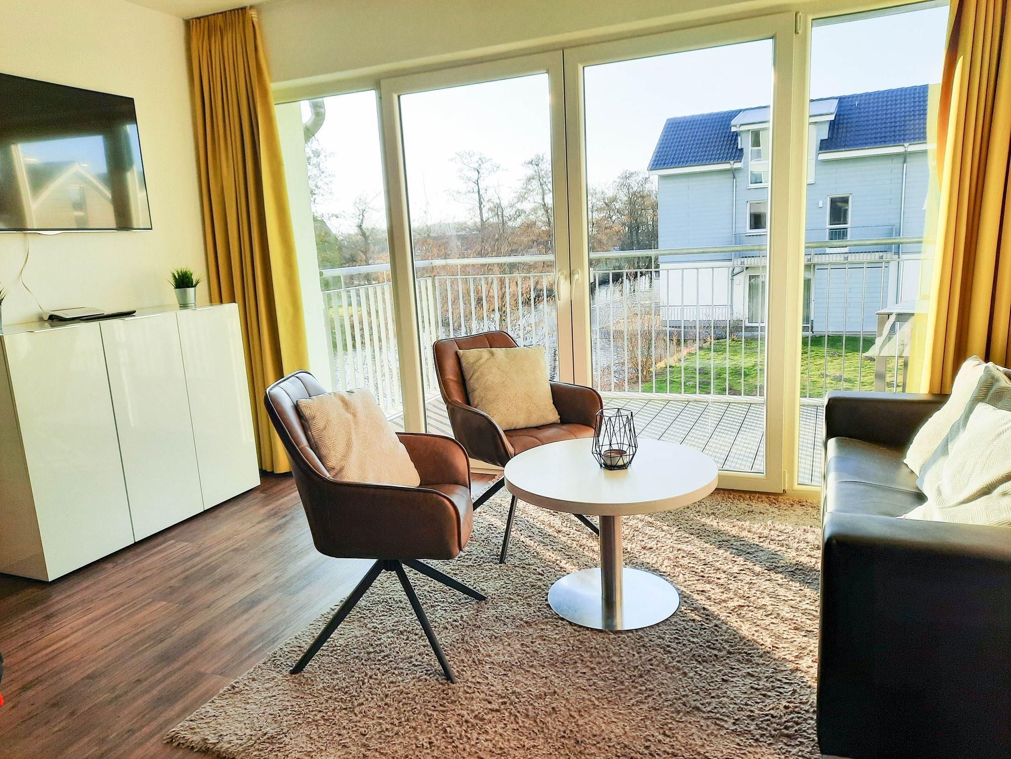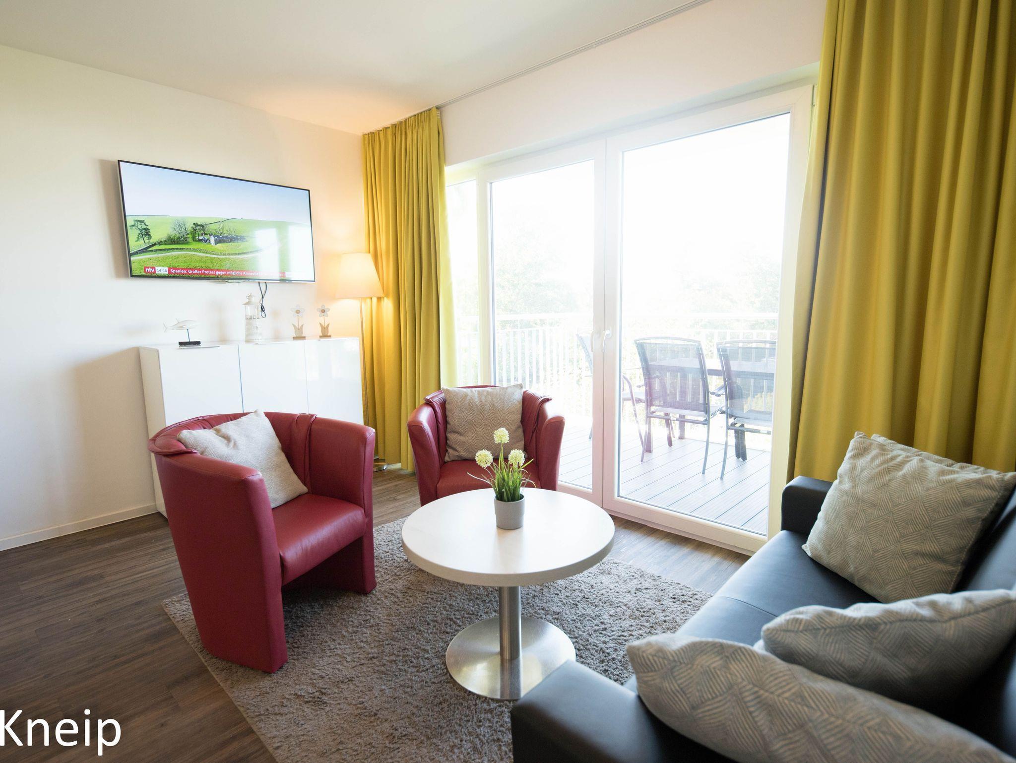 Der helle Wohnbereich verfügt über ein Schlafsofa, ein Couchtisch und zwei Sessel. Durch das Schlafsofa ist es möglich mit max. vier Personen zu übernachten. Ein Fernseher mit Satellitenempfang steht zur Verfügung.