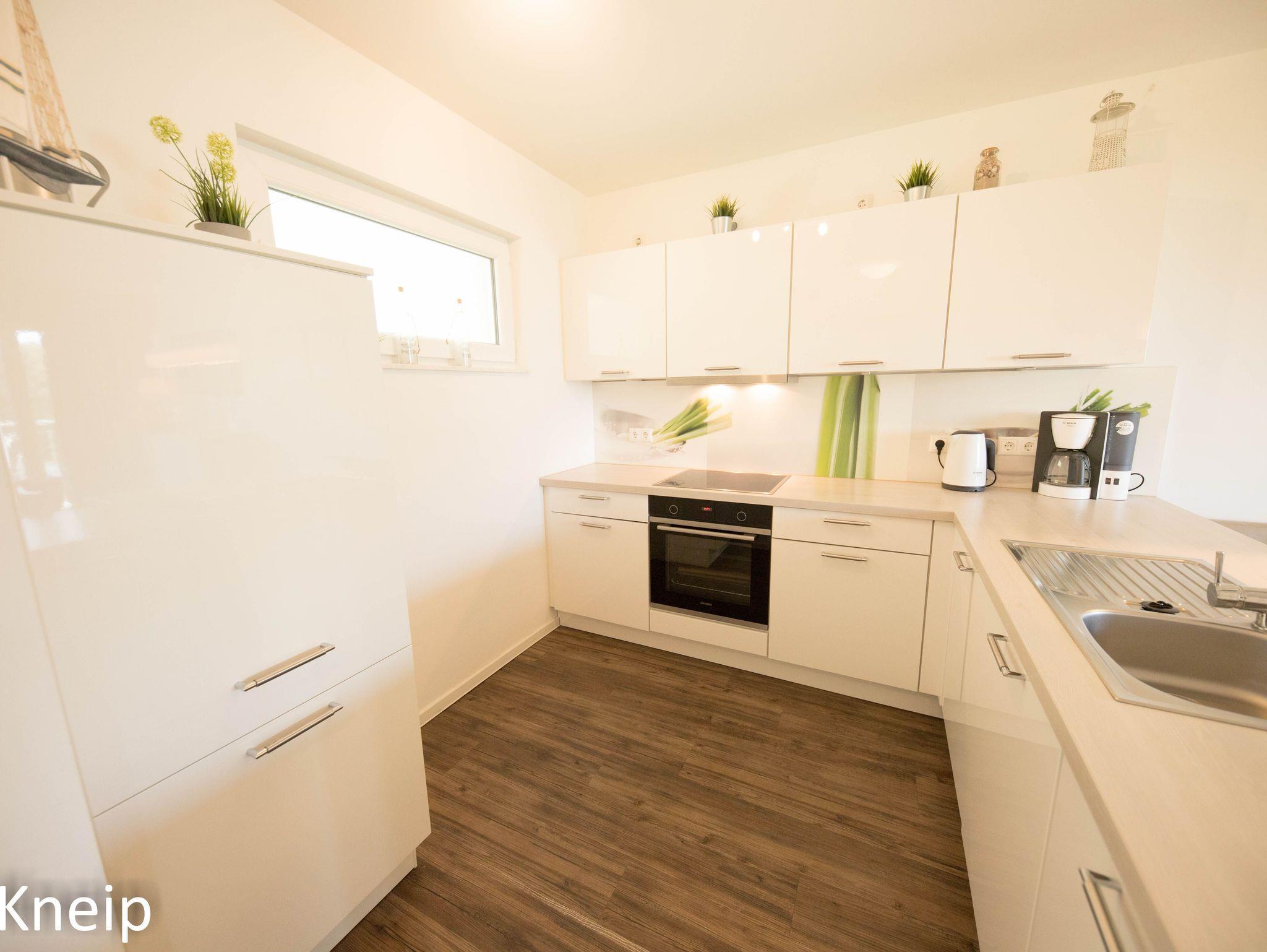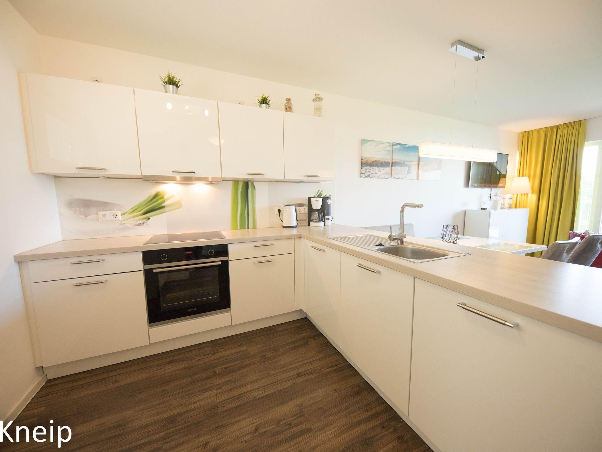 Der Küchenbereich ist modern offen zum Wohn-Essbereich gehalten und mit einer hochwertigen Einbauküche ausgestattet. Geschirr, Besteck, Gläser sowie Töpfe und Pfanne sind vorhanden. Beachten Sie bitte, dass Gebrauchs- und Verbrauchsmittel wie Spülmaschinen Tabs, WC-Papier etc. nur als Starterpaket vorhanden sind und nicht zur Ausstattung gehören, diese sind bitte von Ihnen mitzubringen.