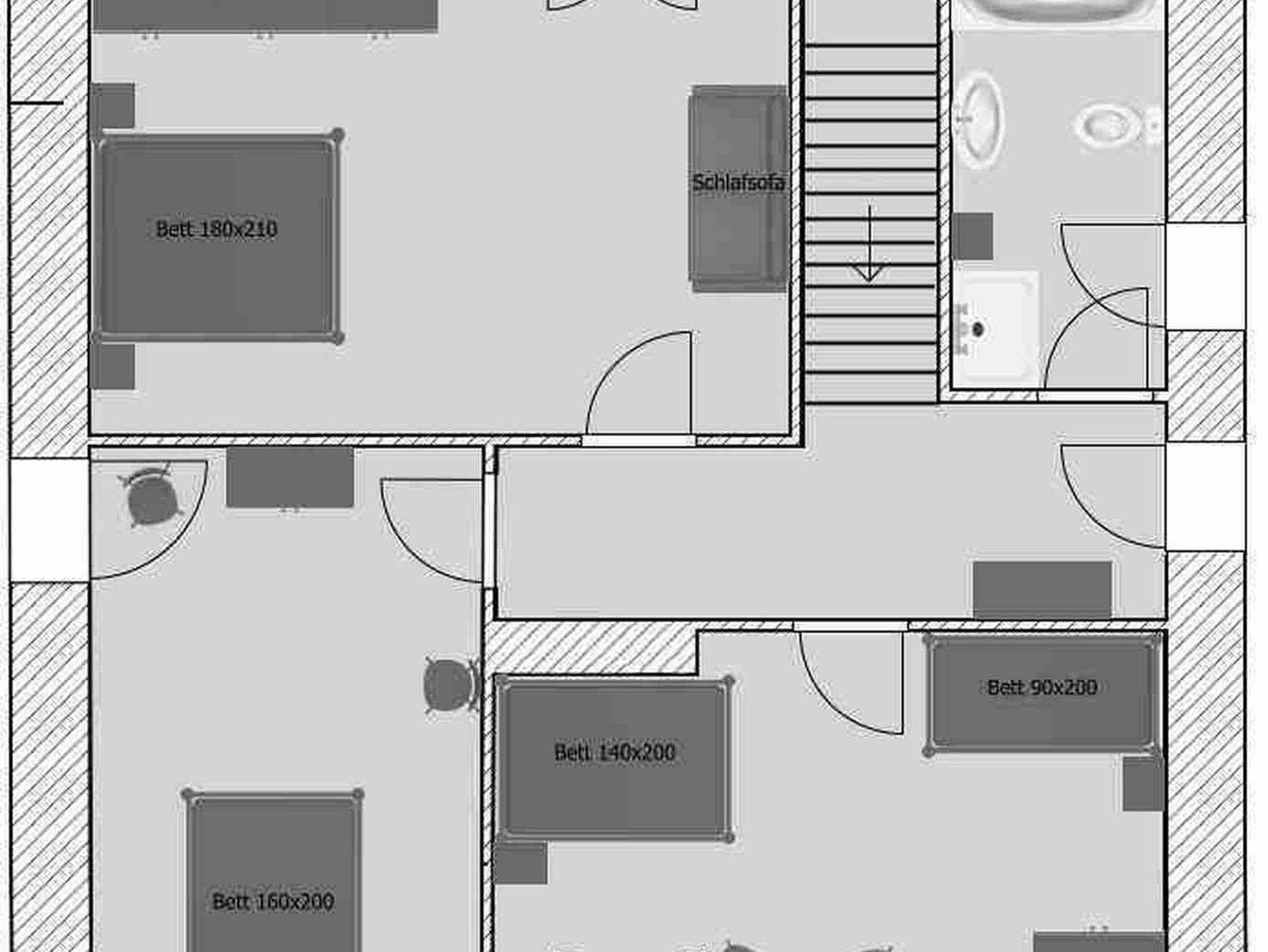 Im 1. Stock des Hauses befinden sich die 3 Schlafzimmer sowie das modern eingerichtete Badezimmer. Das Schlafzimmer 1 ist mit einem Kingsize-Bett für Große (1,80 m x 2,10 m) mit offenem Fußende sowie einem Schlafsofa ausgestattet. Schlafzimmer 2 beinhaltet ein Queensize-Bett (1,60 m x 2,00 m), ebenfalls mit offenem Fußende, und im Schlafzimmer 3 befindet sich ein französisches Bett (1,40 m x 2,00 m) sowie ein Einzelbett (0,90 m x 2,00 m). Ein Wäschepaket (Bettwäsche plus 2 Handtücher) ist gegen Aufpreis zubuchbar.